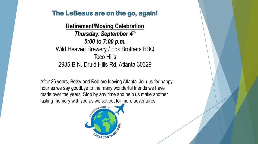 After 25 years at ARC, Rob is retiring on September 5th. Not only is he leaving ARC, but Betsy and Rob are moving from Atlanta. Our last day in this beautiful city is the following weekend. To mark the occasion and say our final farewells, we will be at the Wild Heaven / Fox Bros location in Toco Hills for happy hour on Thursday, September 4th. If you are available, please stop by at any time – it would be great to see you!