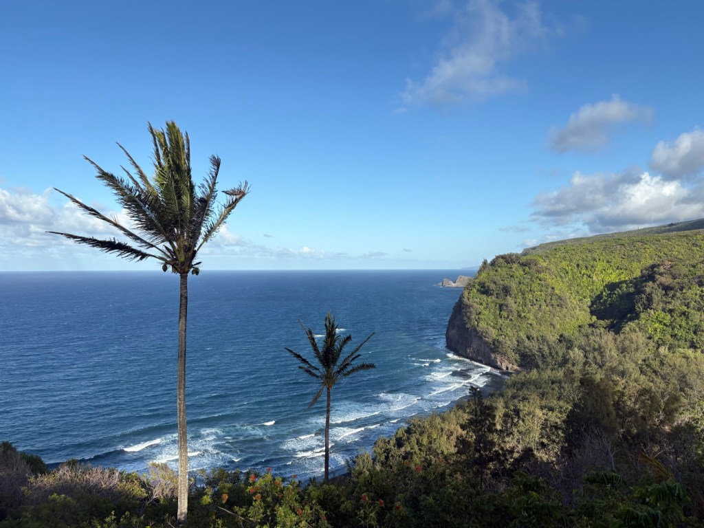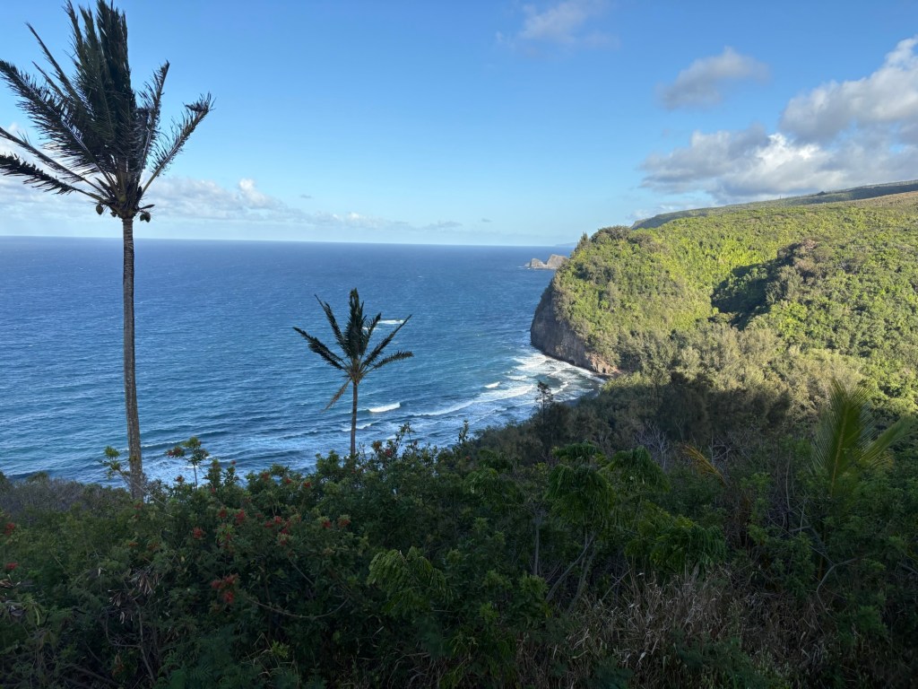 From Kohala we took the winding, dead-end road up to the Pololu Valley overlook. It is a gorgeous spot high up on a cliff. There is a winding path that you can hike down to a black sand beach but it has a steep and difficult return, and they also advise that no one swim there due to rocks and strong currents. For today we were content to just look.