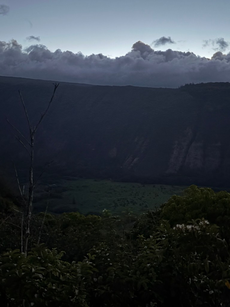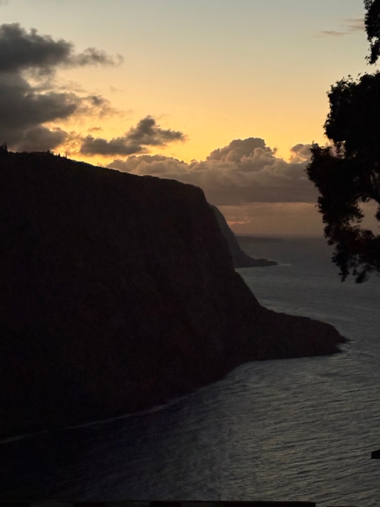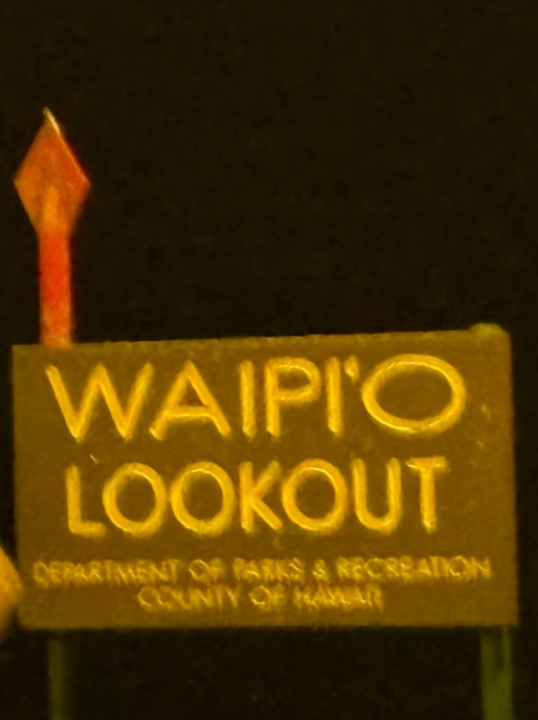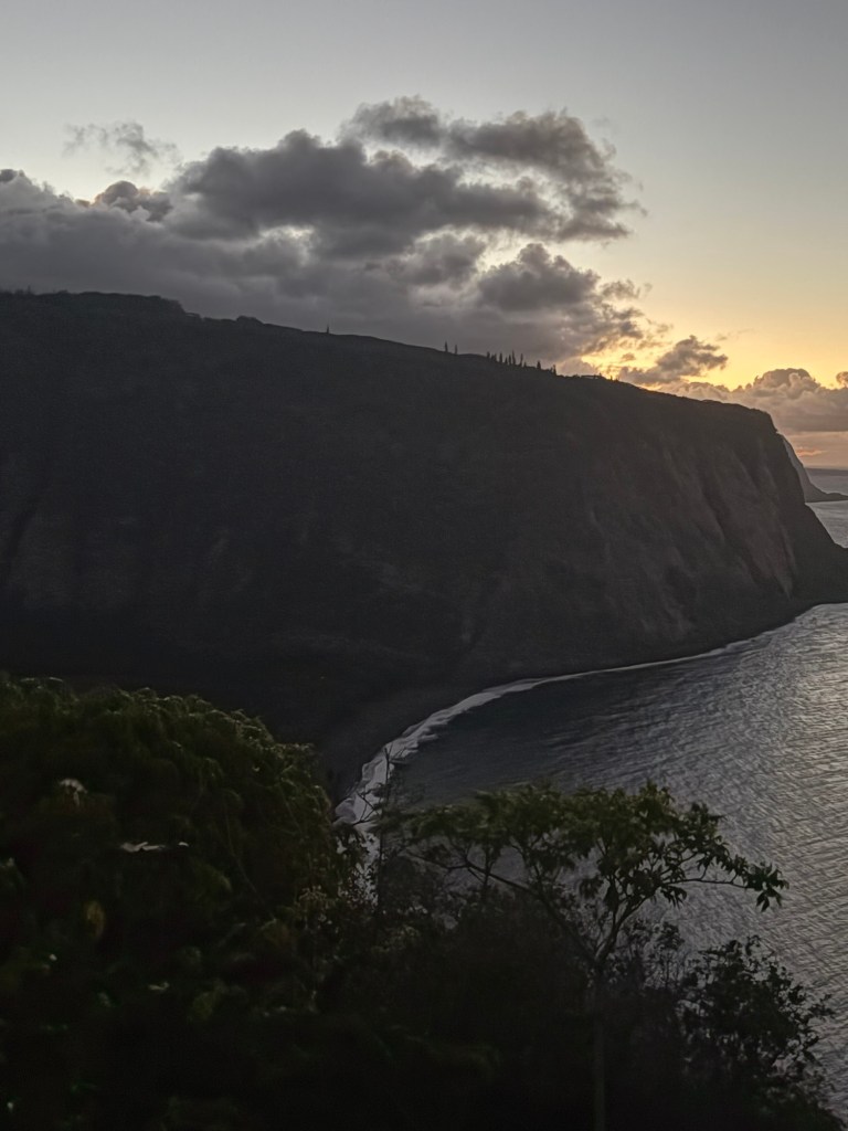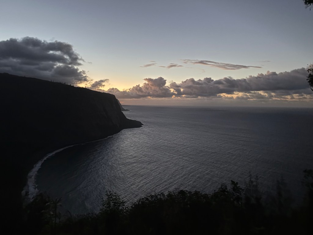 Although we boogied, we didn’t quite make it to our last sightseeing stop, the Waipi’o Valley overlook, before sunset as we’d hoped. But we still got a feel for the beauty here, and got a few nice shots of the last sliver of sun.