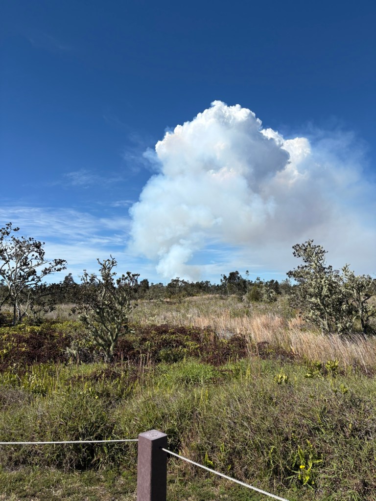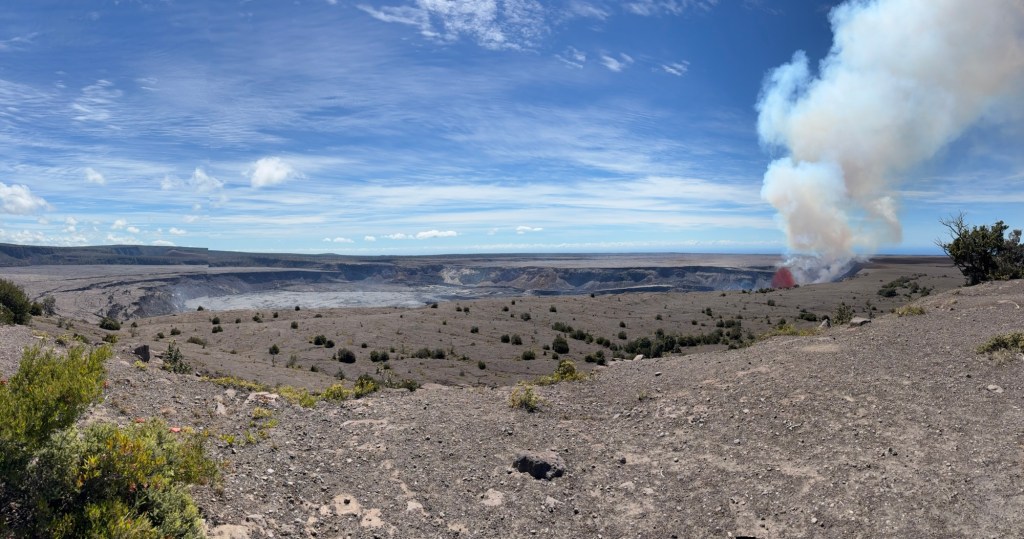 Kīlauea volcano is erupting again! It had stopped erupting right after we arrived on the island, and we were so hoping we might get to see lava flow. So when we awoke to the news today, we scrapped all other morning plans, jumped in the car, and headed straight to Volcanoes National Park! As we drove, the closer we got to the park, the more smoke we could see from the volcano. By 9 a.m. it was already quite crowded, but we were lucky enough to find parking at the Kīlauea overlook area (which was definitely not available by 10 a.m.). We took a short hike along the Crater Rim Trail, and almost immediately came across an amazing view of the spewing lava! I think a little boy summed it up best for everyone when he round the corner to the overlook (riding on his daddy’s shoulders) and shrieked “LAVAaaaaaaa! Oh my gosh- look at the LAVA!”
