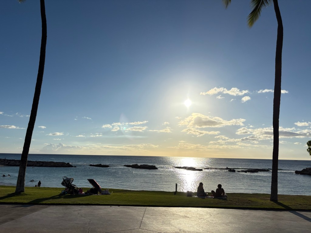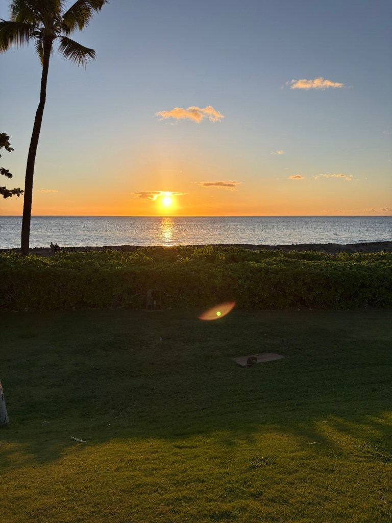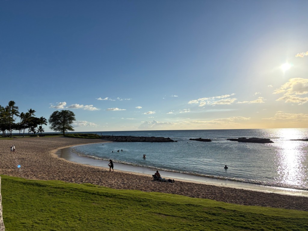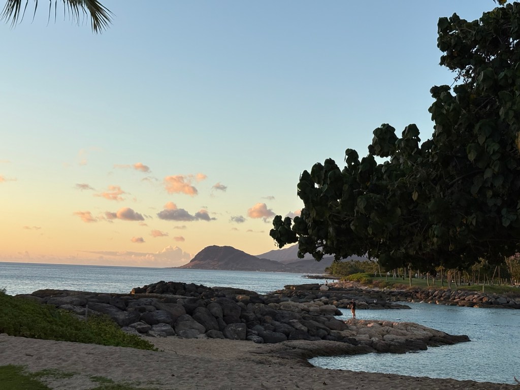 After we checked in we headed right back out with our Guide Along app, and braved the Honolulu traffic to go to the Ko Olina area of town and start our explorations. We actually stayed out here last time we came to Oahu in 2012, and as a surprise for Jenna we spent a few nights in Disney’s Aulani Resort. It was a gorgeous area that has built up significantly since our last visit, and they have four swim and snorkel sheltered lagoons around all the resorts in the area. We went for a nice snorkel at Lagoon 4. While it was a pretty snorkel area with a good variety of fish, most fish were very small in the lagoon and it just couldn’t compare to our Big Island experience yesterday at Punalu’u and Two Steps. After snorkeling we walked a long path that connects all the lagoons and watched a marvelous Oahu sunset. We visited the Aulani resort briefly, which was as beautiful as we remembered, and then headed to dinner at Monkeypod. We split a salad and a fish sandwich and a piece of butterscotch pie for a very yummy dinner in a fun atmosphere. A great start to our Oahu adventures!