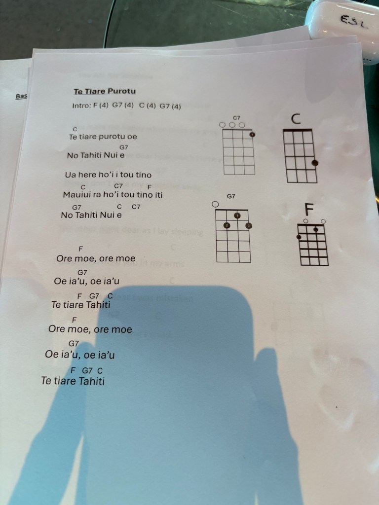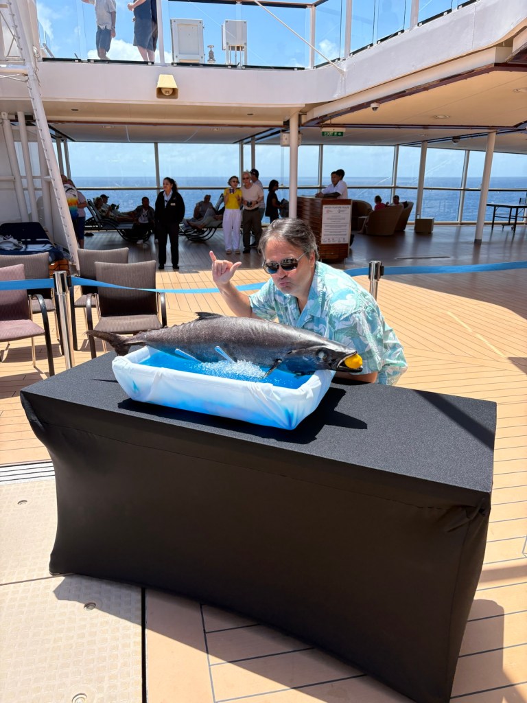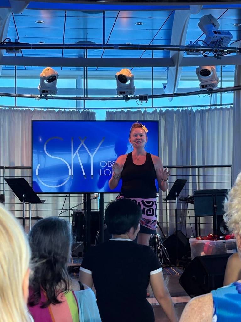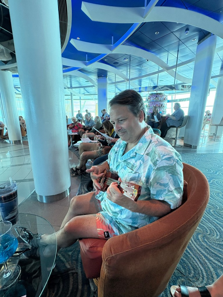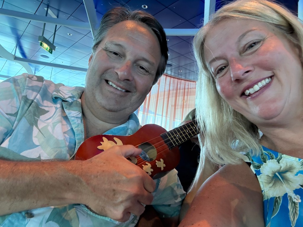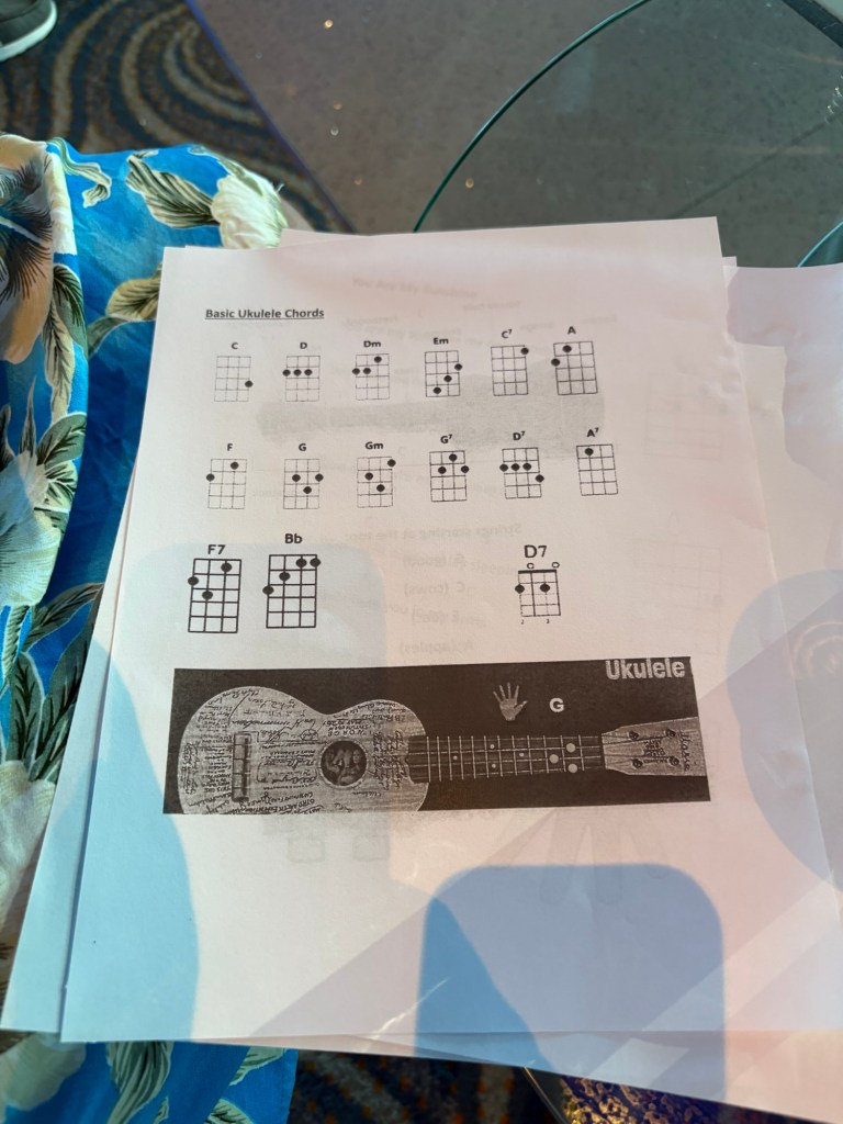 After the Equator crossing, we spent our day enjoying more of the great activities offered by our ship. From the port of Honolulu until our first port of call in Tahiti on Wednesday, we have onboard a team of people they call the βHawaiian Ambassadorsβ who offer daily classes and lectures to teach guests about Hawaiian customs and culture. I love it! Today I went to two of their classes, a hula class and a ukelele class. The hula class was fun, and we learned to sing a Hawaiian song and do the accompanying dances to two songs. I love that their dances are designed to tell stories, and the movements are very purposeful.
