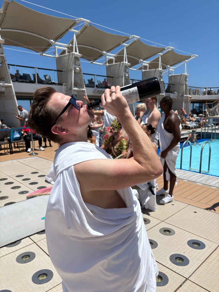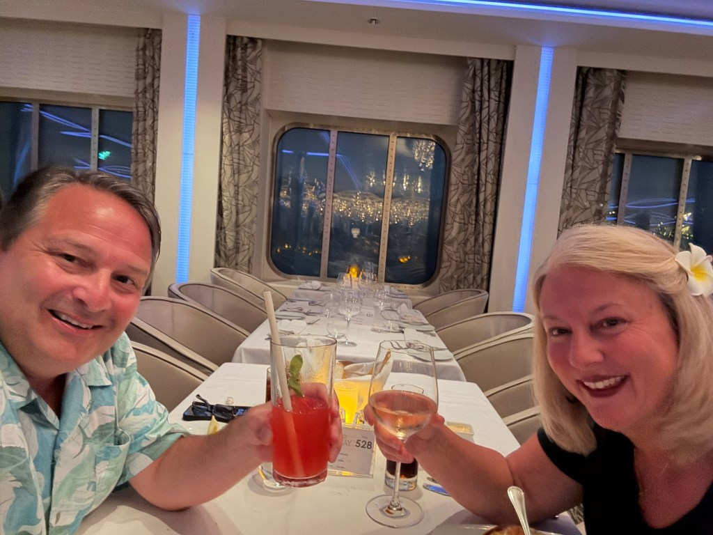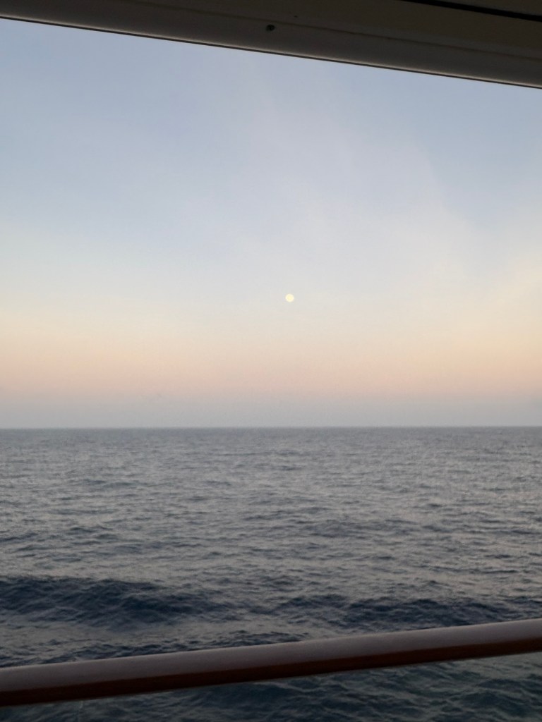 Our evening brought another dinner in the dining room (food there has been pretty mediocre overall- nothing bad, but nothing to write a blog about, and still beats cooking at home!), two rounds of trivia in the Sky lounge (we miss you CV trivia pals!), some free champagne (the best kind) at the shops onboard, a bit of dancing at the 80s party, and a lovely full moon. You know, just our usual Sunday night, right?! π€£