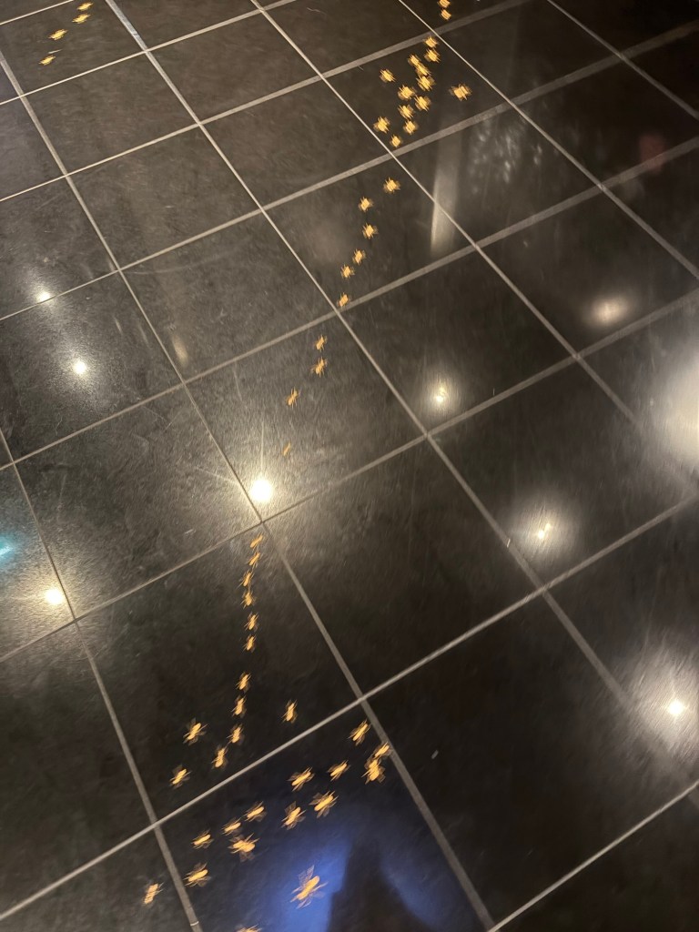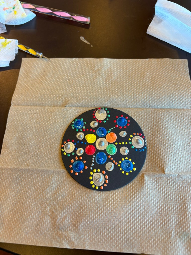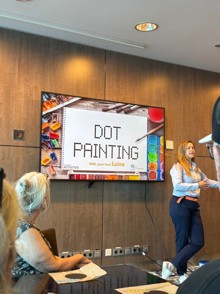 Slept in late today, which was lovely, having fully acclimated to our time zone out here and being back to our “usual” selves of staying up late, and sleeping late whenever we can. We had lunch in the dining room and then headed off to some activities. Rob started at the gym, while I headed to a “dot art” class. I will preface this with the statement that I am not an artist, nor have I played one in tv, and this was an excellent reminder why I was better suited to an office job 😝. I am posting a picture of my “masterpiece” below… copyright pending. 🤣😭