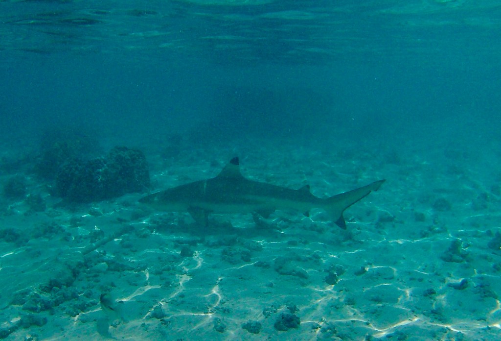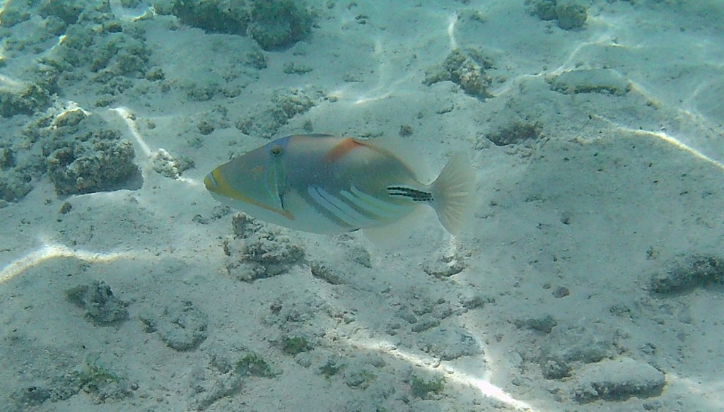 Before we were even off the snorkel ferry, we could see blacktip reef sharks and big stingrays in the shallow, clear water next to us! People do tend to feed them in this area, so they hang out a lot, especially the stingrays, with no apparent fear. In fact some of these tamer rays will come right up and brush against you to ask for food or pats! They evidently enjoy having their noses rubbed according to our guide, and verified by Rob!