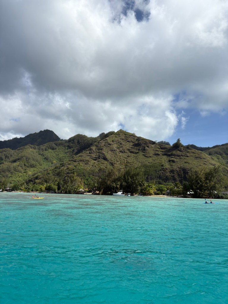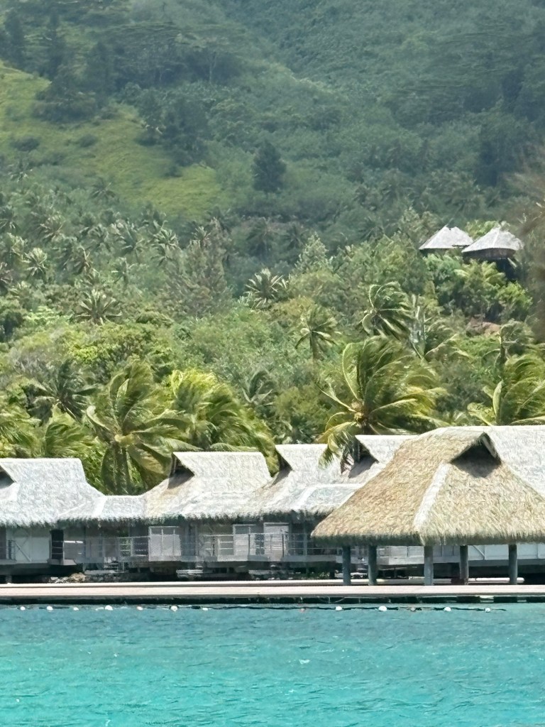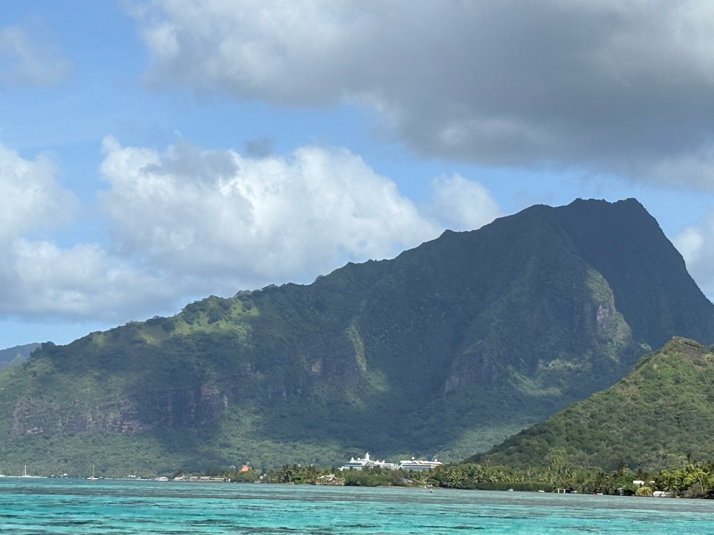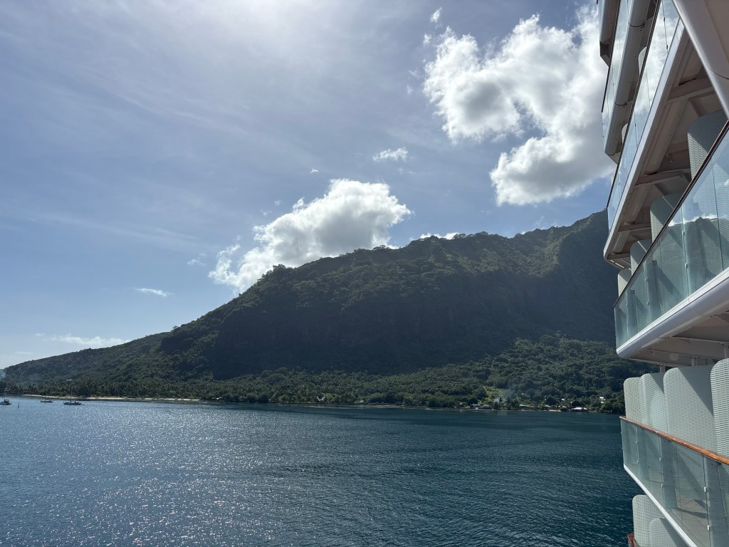 Woke up this morning to the lovely site of land outside our window, and not just any land! Mo’orea means “yellow lizard” in Tahitian, and the island is supposed to look like a heart from the air. A true Love Island ❤️! Moorea is only 11 miles northwest of Papeete Tahiti where we were on Wednesday, but it is full of jagged volcanic mountains that give it a mystical look in my opinion. For contrast, I took the first picture below of what Moorea looks like when viewed from Tahiti, and the second picture below is a tiny slice of it from off our balcony while in port.