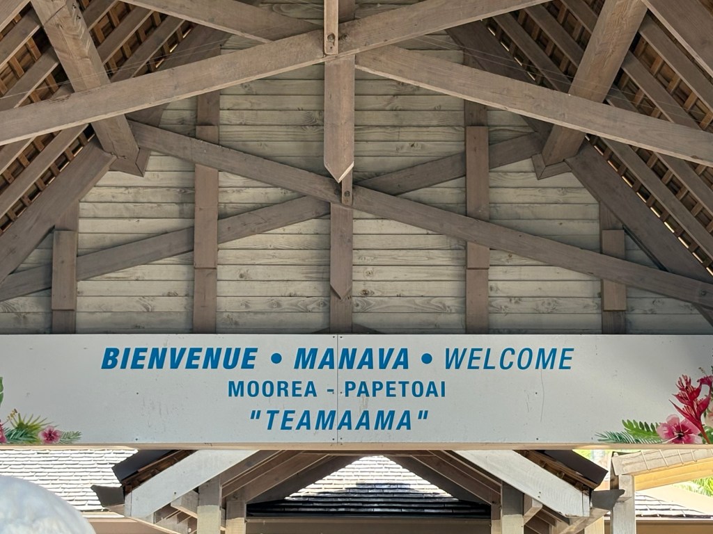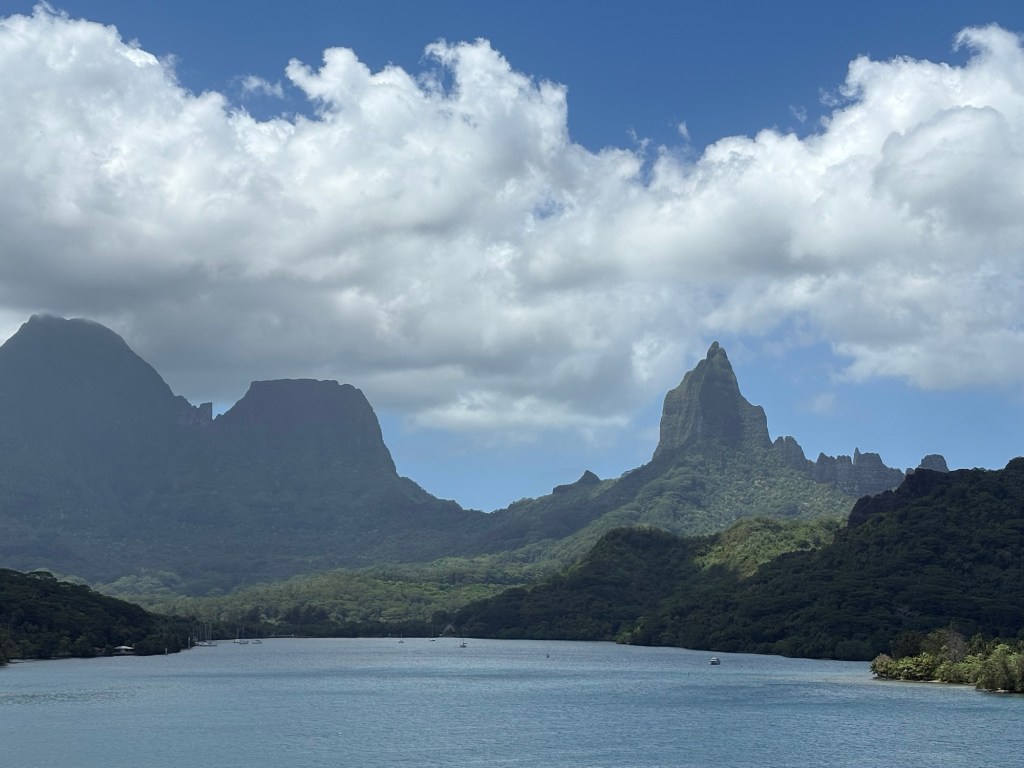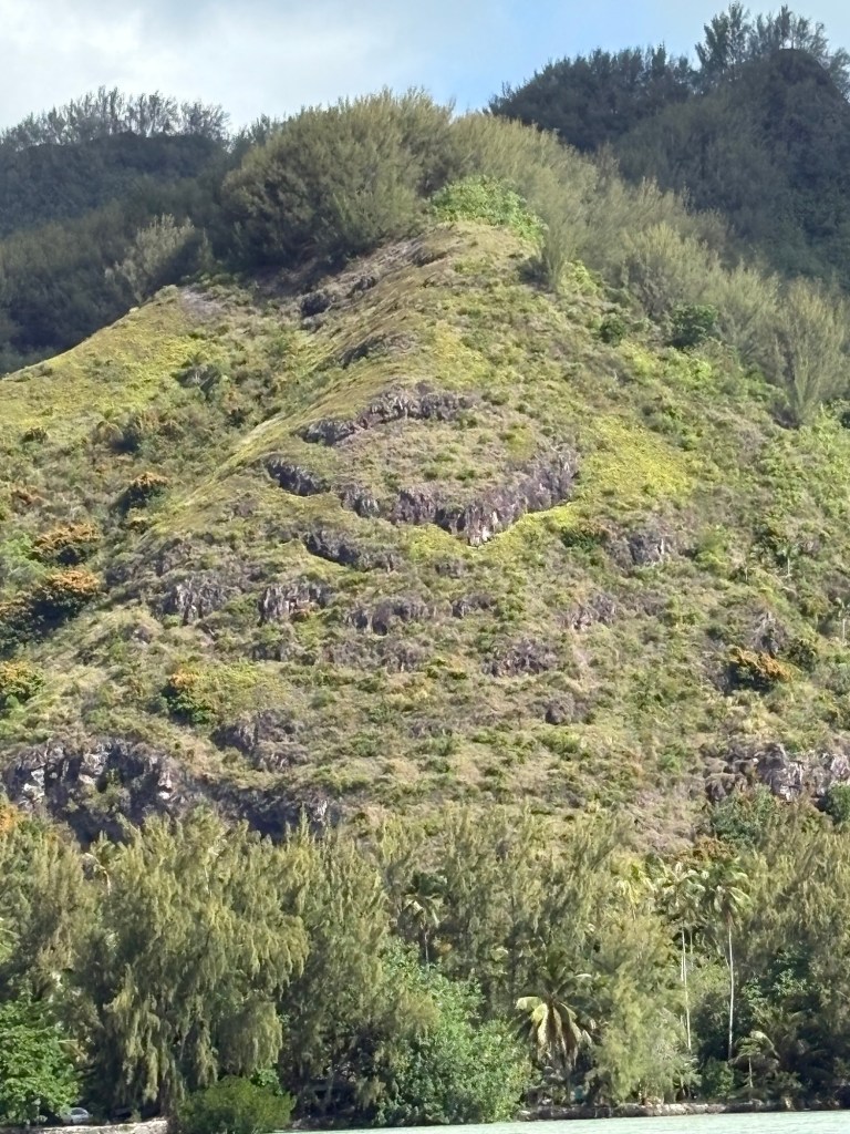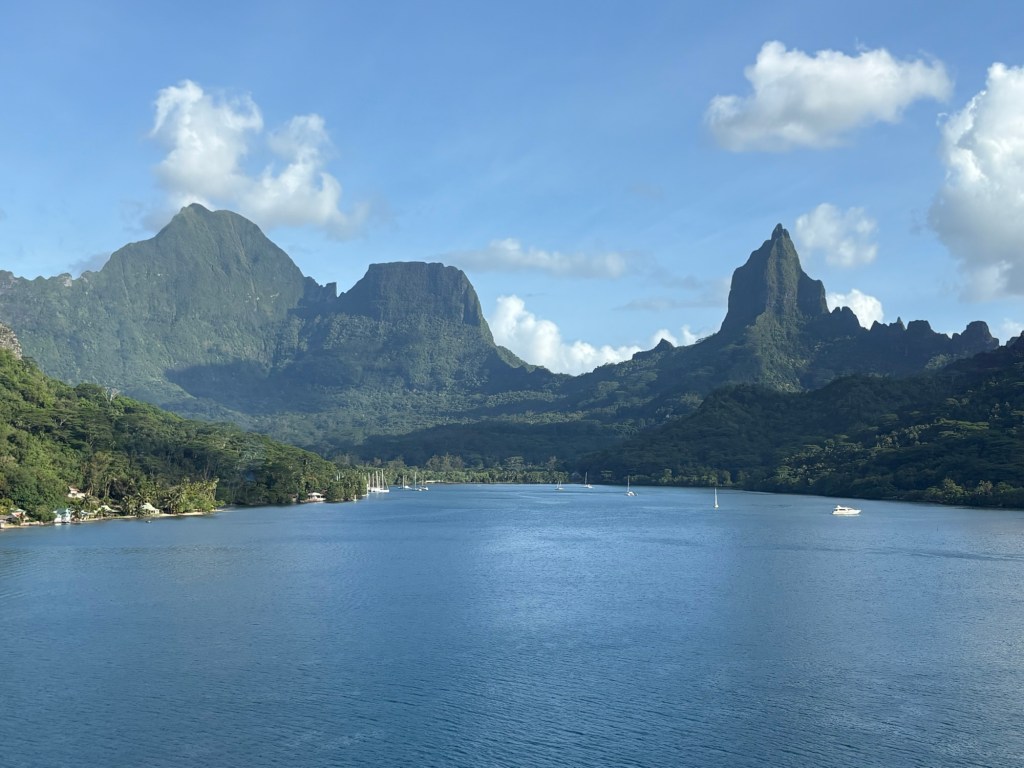Woke up this morning to the lovely site of land outside our window, and not just any land! Mo’orea means “yellow lizard” in Tahitian, and the island is supposed to look like a heart from the air. A true Love Island ❤️! Moorea is only 11 miles northwest of Papeete Tahiti where we were on Wednesday, but it is full of jagged volcanic mountains that give it a mystical look in my opinion. For contrast, I took the first picture below of what Moorea looks like when viewed from Tahiti, and the second picture below is a tiny slice of it from off our balcony while in port.
