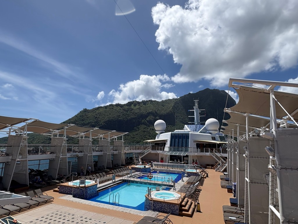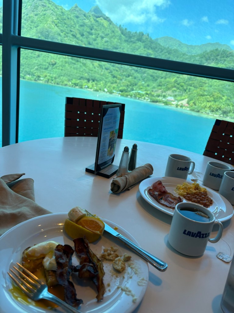 I loved watching the crew react to Mo’orea. Because this is a repositioning cruise and not part of their “usual itinerary”, many of these stops are firsts for the crew, too. At any given time, you could see ship’s staff sneaking pictures of the sights on their phones along with the guests. 😍 Here was our view from the breakfast buffet, and the top deck of the ship. Just wow!