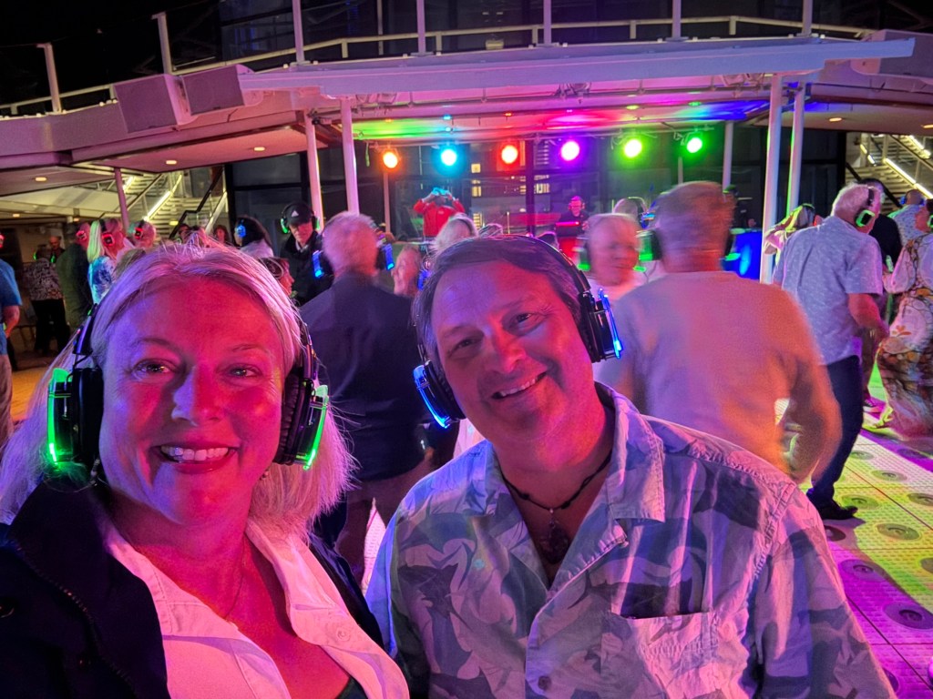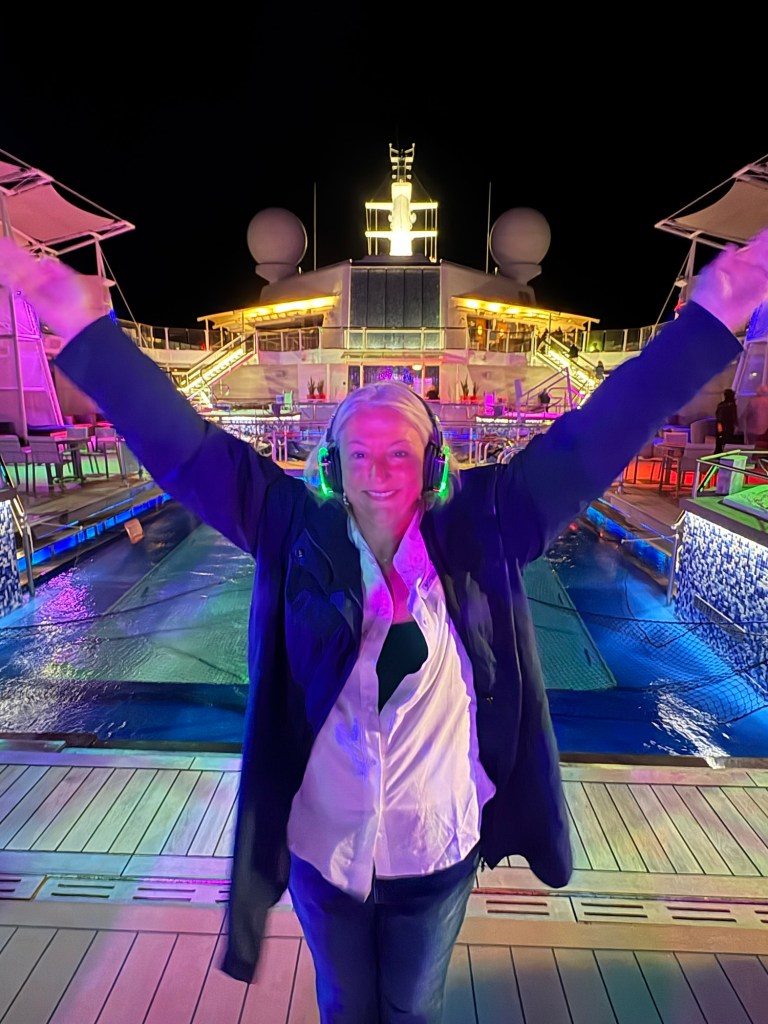 Our day concluded with another silent disco party under the moonlight. If you’ve never been to one, everyone gets a pair of headphones and there are multiple channels of music you can switch between and dance to. So, you literally dance to your own (chosen) beat with a group of others doing the same. Our party had three different DJs spinning three different types of songs (one mostly rock/pop, one classic rock, and one oldies) and each dj had an assigned color (red, blue, or green). The headsets they gave us had three channels on them (one for each dj), and after you selected your channel, your headphones glowed whatever color of your music/dj selection. So, if you were listening to “green”, you could see who else in the crowd was listening to the same music as you, and you often found yourself dancing with strangers who chose the same color. Of course you could change colors at any time, which I often did. It’s so funny to watch because although it’s not loud with music, it’s a whole bunch of dancing people often singing different songs aloud, or yelling their favorite lines or dancing the Cupid shuffle right next to people doing the YMCA. Slightly chaotic, but big fun.