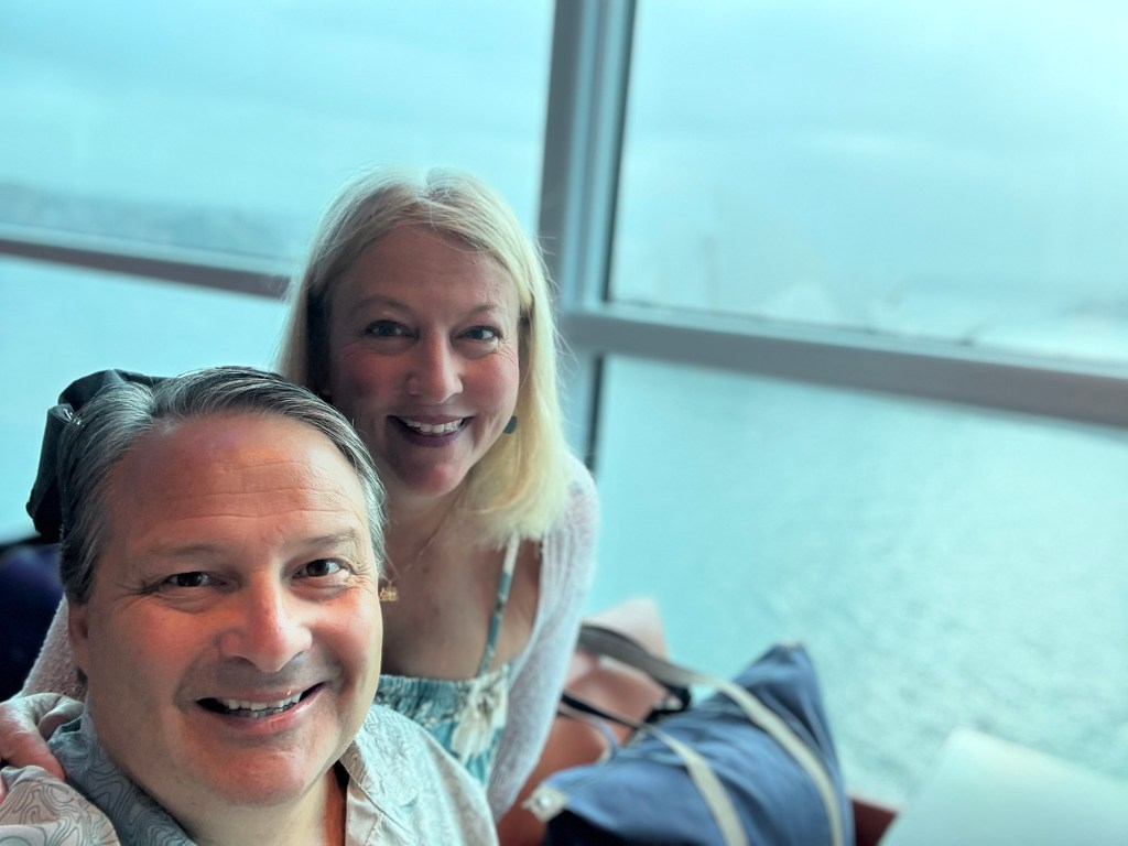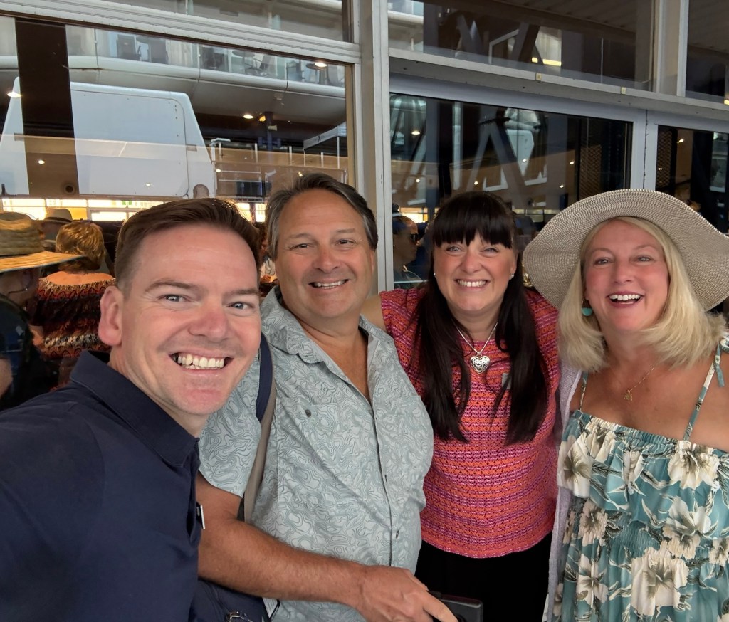 The departure day of the cruise is the same everywhere with the βThank you for coming, now get the heck off our ship because 2500 more people are coming in three hours!β- vibe. We had to be out of the cabin by 7:30 a.m. and by 8:30 a.m. all breakfasts were shut down and you had to be out of the breakfast areas, so, yeahβ¦ get off. π Getting off the ship they had people from every department lined up to say goodbye to us, including the cruise and activities directors (a husband and wife team named Dave and Angela, who we loved- picture below), which we thought was super sweet. By 9 a.m. we were in the taxi and on the way to our hotel for tonight, the Intercontinental Sydney Harbor, which is very close to the cruise ship dock.