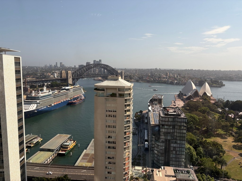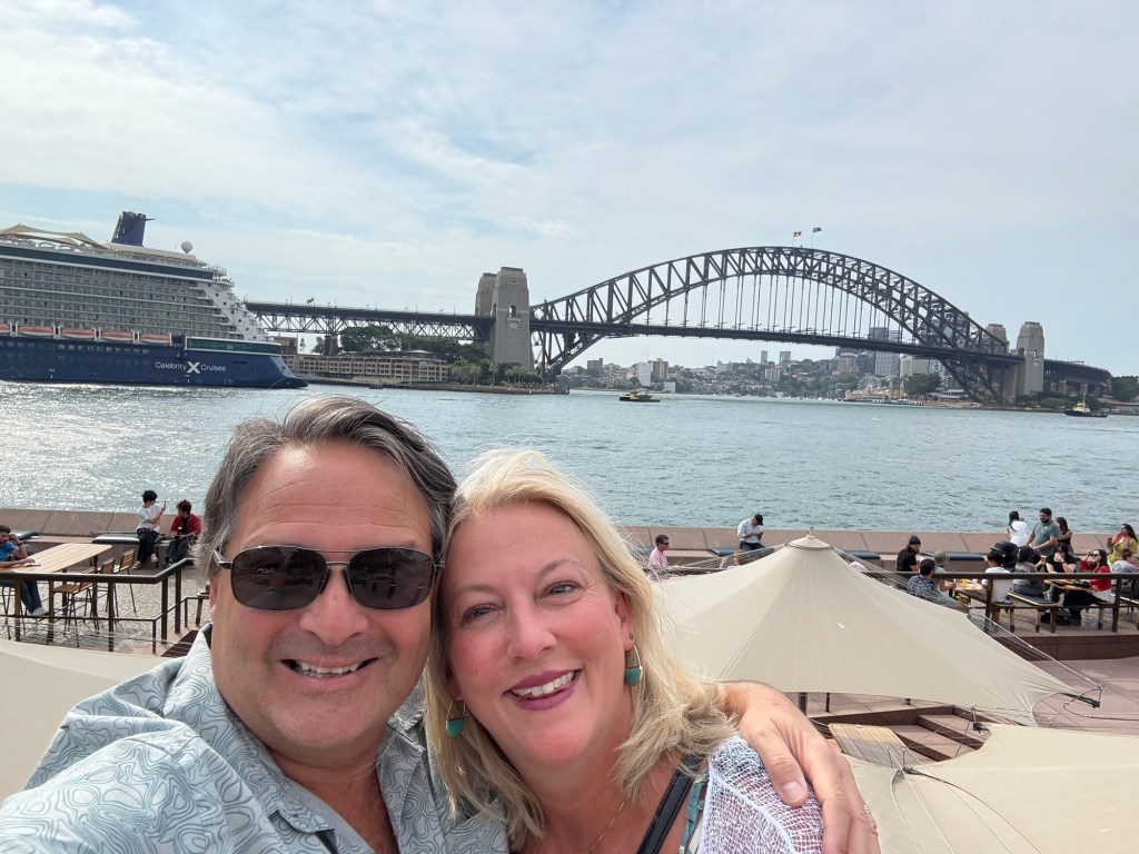 We have arrived in Australia to begin Leg Three of our epic retirement journey!! Our Celebrity Solstice ship pulled in to Sydney Harbor this morning around 5:30 a.m., and I woke when the shipβs engines slowed down. That was very fortunate because we just happened to be sailing past the iconic Sydney Opera House!! BEST 5:30 a.m. view of my life! There are so many beautiful landmarks right as you pull in to the harborβ¦ I was so excited!!