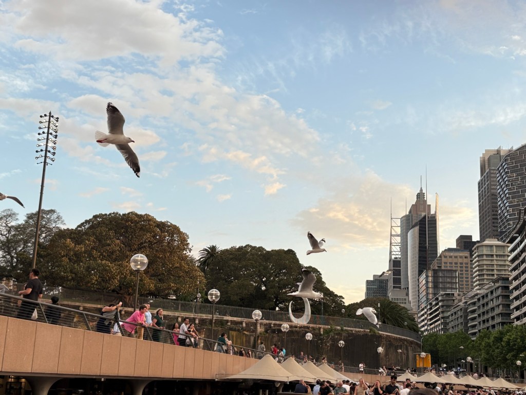 After the show we headed to the Opera House Bar for some light dinner and a local beer. Itβs a beautiful spot to watch sunset, and it is packed with people and seagulls as the sun goes down. We were hoping to see flying foxes, but no luck today. It was still a beautiful night!