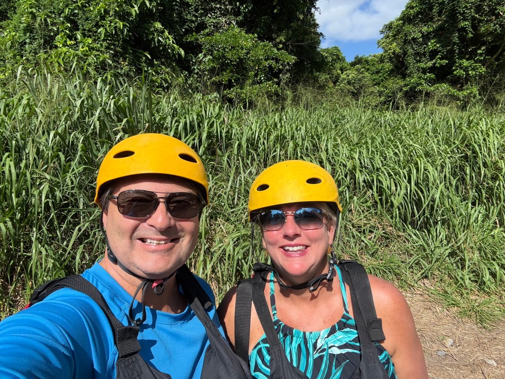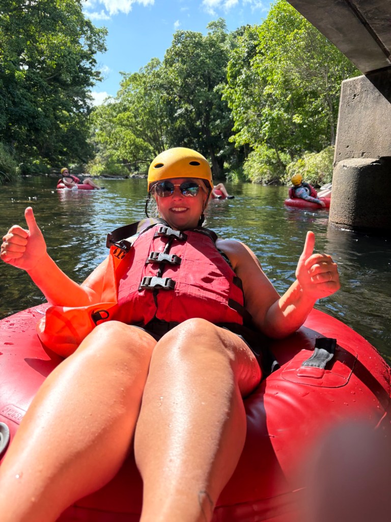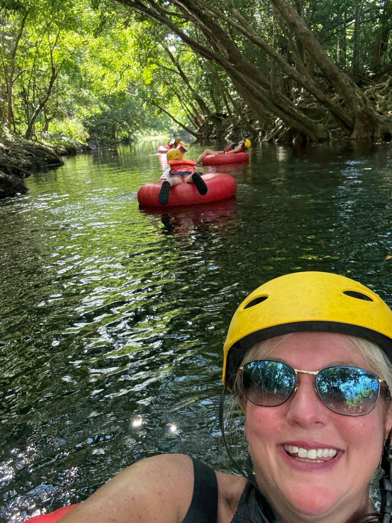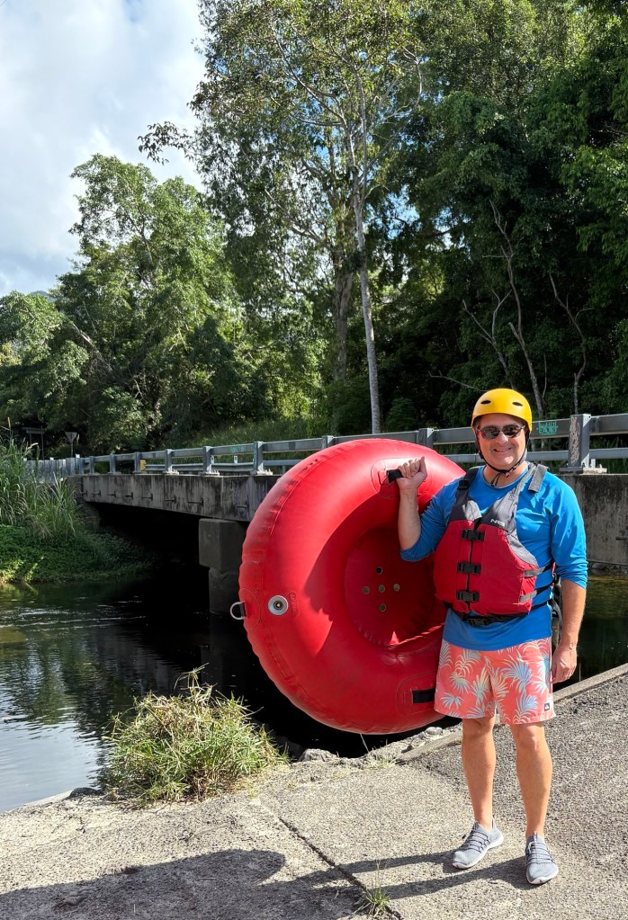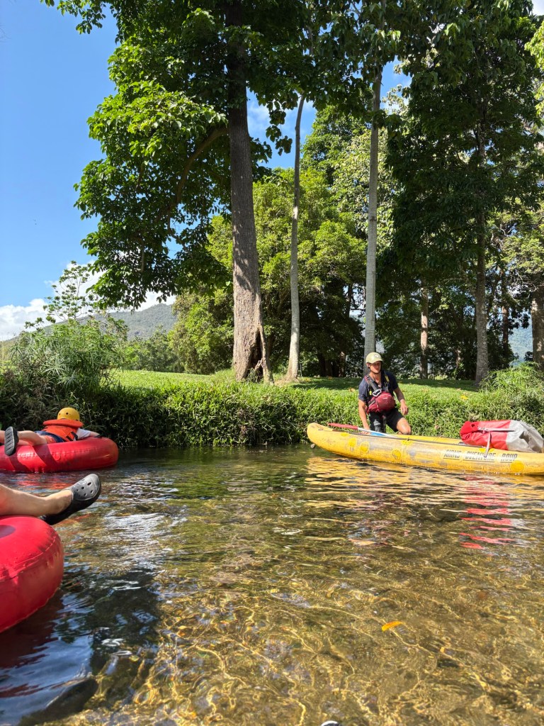 An early start this morning when the Cairns Adventure Tours bus picked us up at 7:30 a.m. (we are failing the “get lots of sleep” part of retirement since we got to Oz!) and drove a group of about 25 of us out to the Little Mulgrave River for a tubing adventure! The river access point was about 30 minutes away from Cairns through lots of sugarcane fields and into the rainforest. Our guides got us all geared up, did a safety briefing, and plopped us down in our tubes on the Little Mulgrave River, which is a freshwater river and has no crocodiles that anyone knows of. Our guide did point out the (bigger) Mulgrave River, DOES, in fact, have crocs but that usually “only locals swim there.” What?! 😂🐊