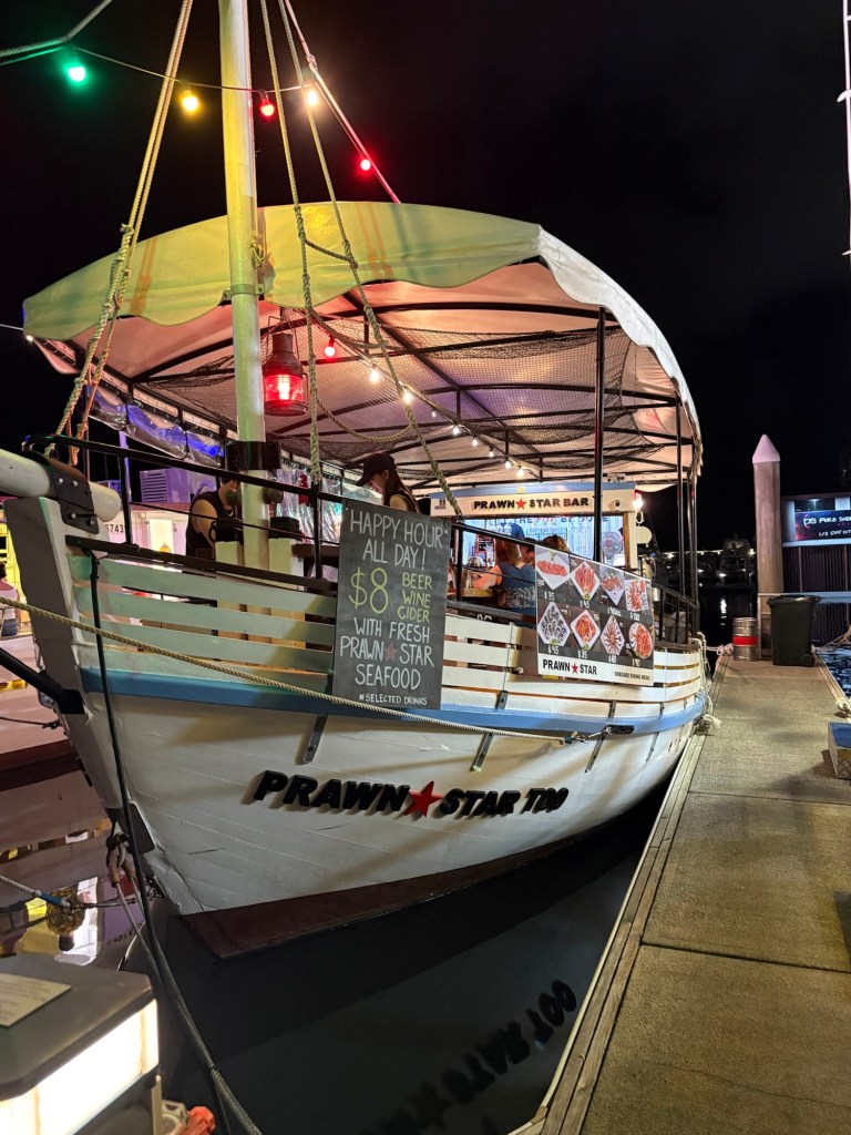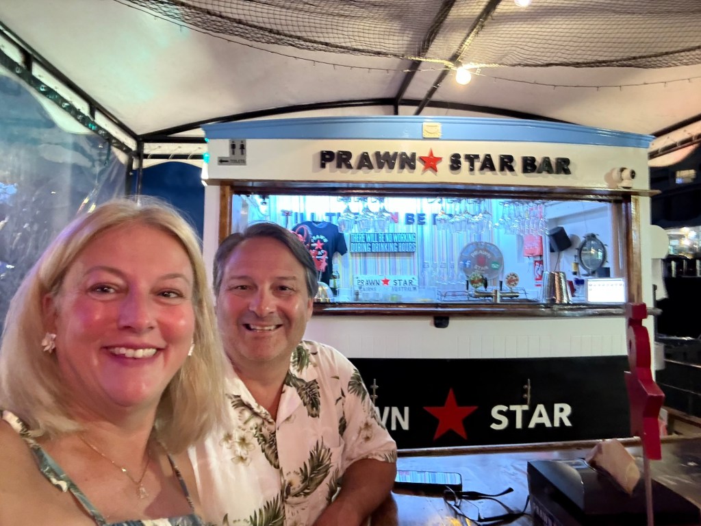 After lunch we did some walking and shopping in the stores along the wharf, and then headed back to our condo for showers and clean up. Tonight we went back into the wharf area (it is a really happening part of town) and had dinner at a place our condo owner recommended called The Prawn Star. The Prawn Star restaurant is actually four separate boats docked in the marina. You walk up to the first boat where the hostess is and she assigns you seats at a large table on one of the four boats (dining al fresco on the deck, of course 😂). Tables are shared by about 12 people per boat. It is an all seafood, small menu, and all freshly caught and boiled on the first ship, where you can watch them cook. It’s a cute concept, and the food was really good.