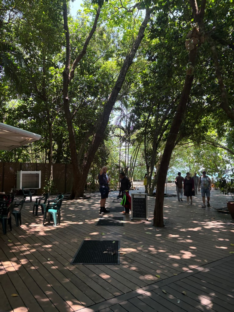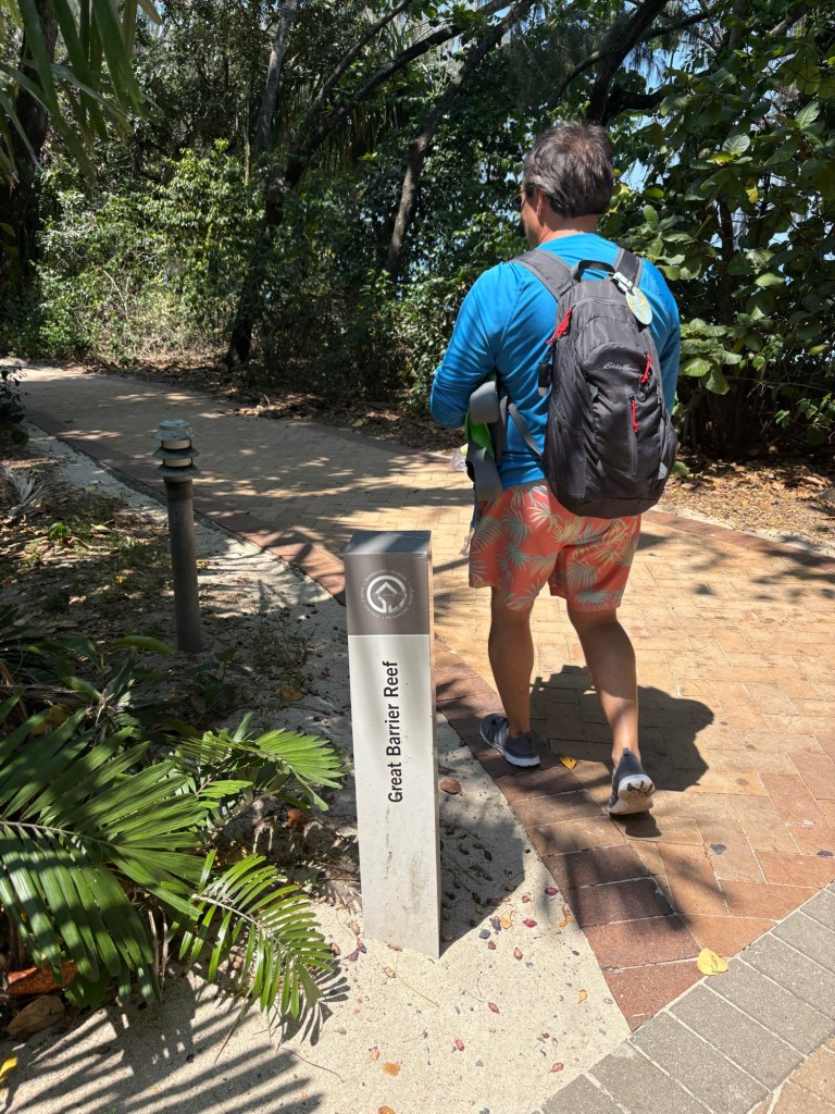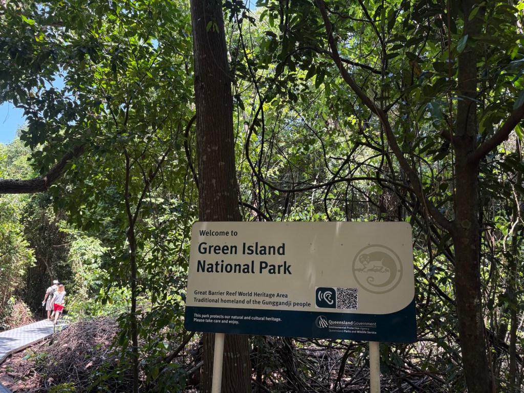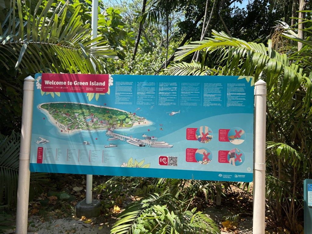 We were up early again this morning to head to the marina and catch our tour boat to Green Island, which is about an hour off the coast of Cairns. Lots of tour groups on our boat, and lots of boats on the less-than-one-mile long Green Island dock, which made for some surprising crowds for a Monday! Green Island sits in the Coral Sea and is covered in rainforest, so it’s very scenic. It has one eco resort on it, a boat dock, and a few points of interest, the main one being that is right in the Great Barrier Reef National Park. You can snorkel the GBR right off the beach there, which is super cool, plus they have “the usual” beach tourist stuff like parasailing, glass bottom boats, etc. We took a nice walk around the island in the morning.