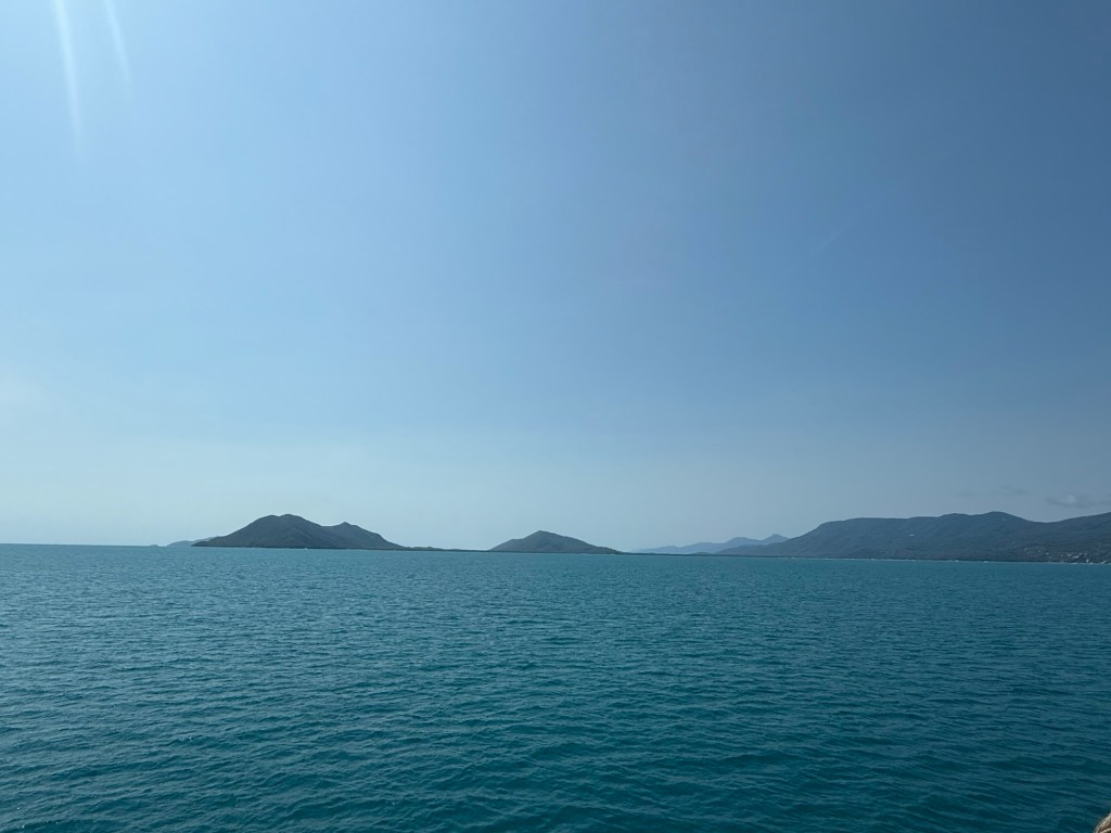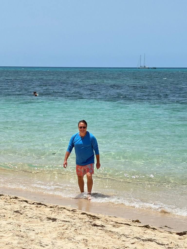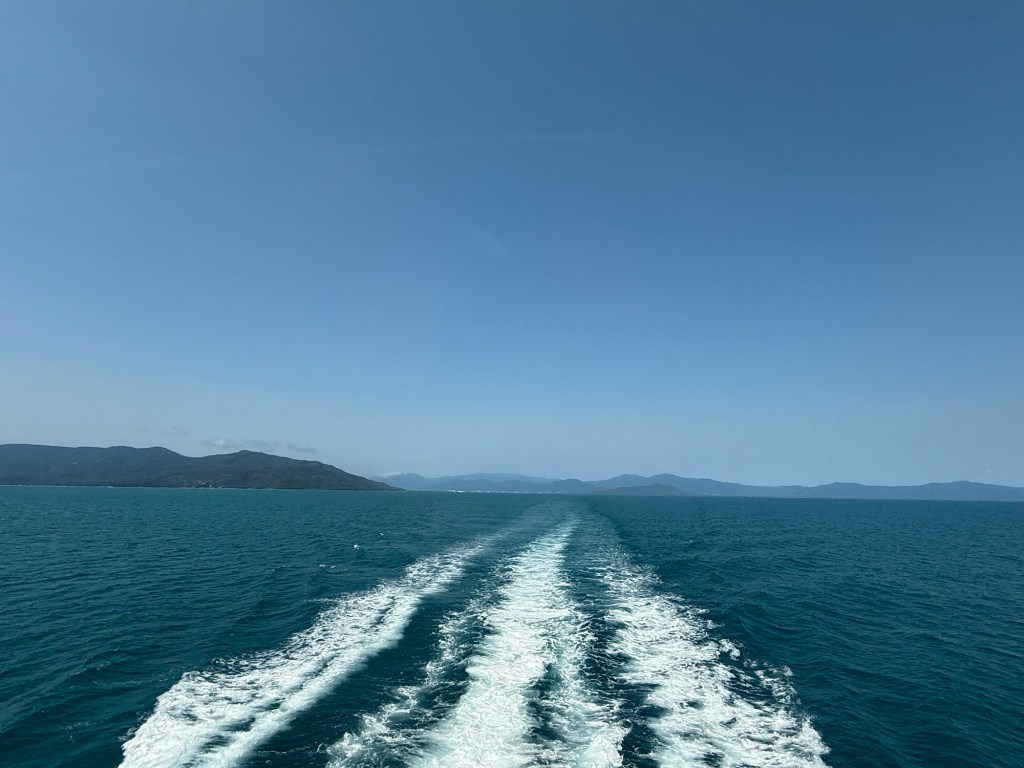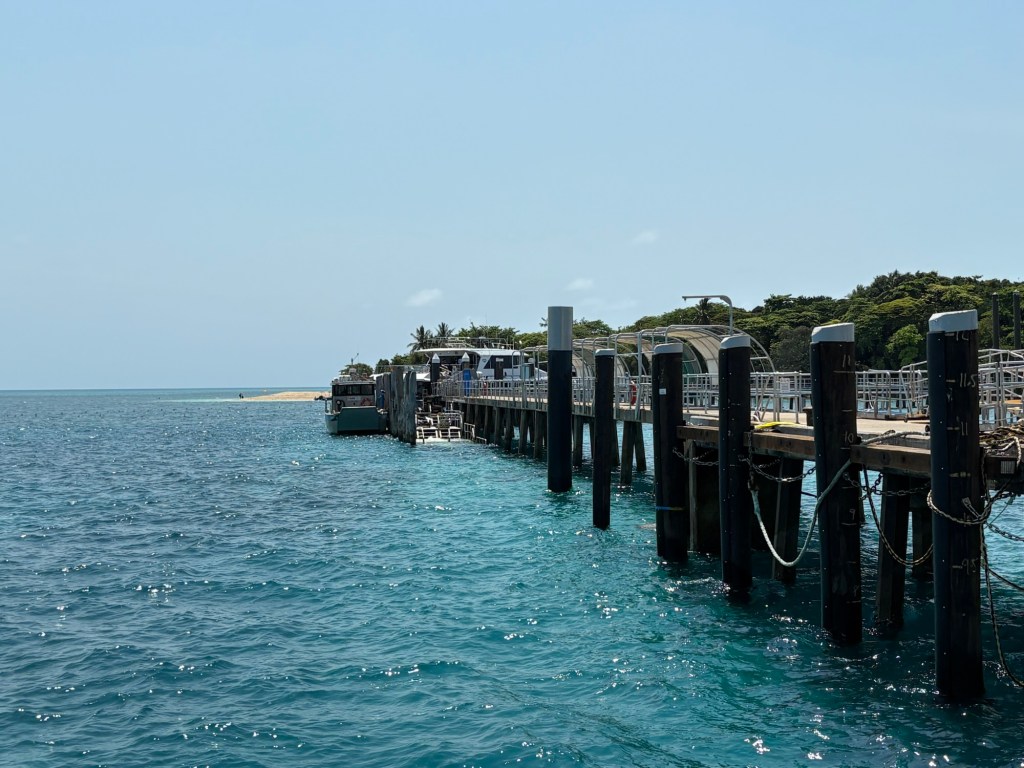 We were up early again this morning to head to the marina and catch our tour boat to Green Island, which is about an hour off the coast of Cairns. Lots of tour groups on our boat, and lots of boats on the less-than-one-mile long Green Island dock, which made for some surprising crowds for a Monday! Green Island sits in the Coral Sea and is covered in rainforest, so it’s very scenic. It has one eco resort on it, a boat dock, and a few points of interest, the main one being that is right in the Great Barrier Reef National Park. You can snorkel the GBR right off the beach there, which is super cool, plus they have “the usual” beach tourist stuff like parasailing, glass bottom boats, etc. We took a nice walk around the island in the morning.