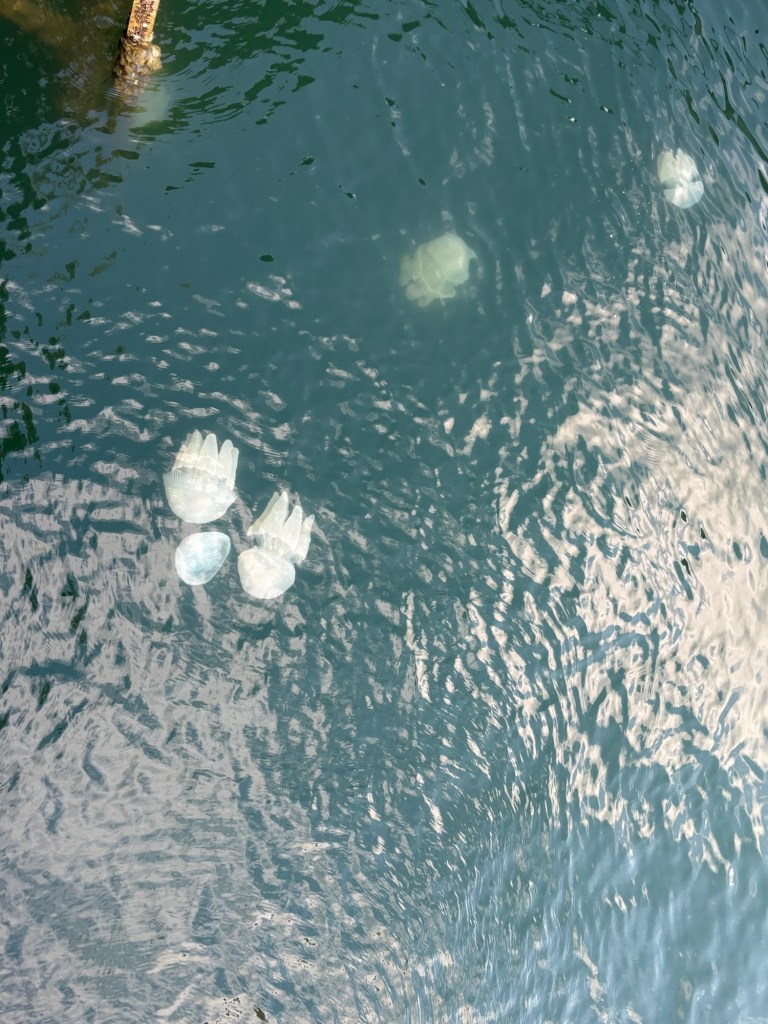 We had lucked out in our timing of our GBR snorkels. Australia has a serious “stinger season” in the summmer (typically November thru March) where snorkel places require you to wear full-body “stinger suits” when you snorkel to protect you from a certain kind of jellyfish stings. However, the stingers haven’t been seen here just yet, so we were able to swim without them. Yay! When we returned to Cairns, however, it was crazy to see how many jellyfish were hanging out in the harbor! These are “jelly blubber” (no kidding! Isn’t that a great name?!), a type of relatively harmless jellyfish that aggregate in harbors and estuaries around here.