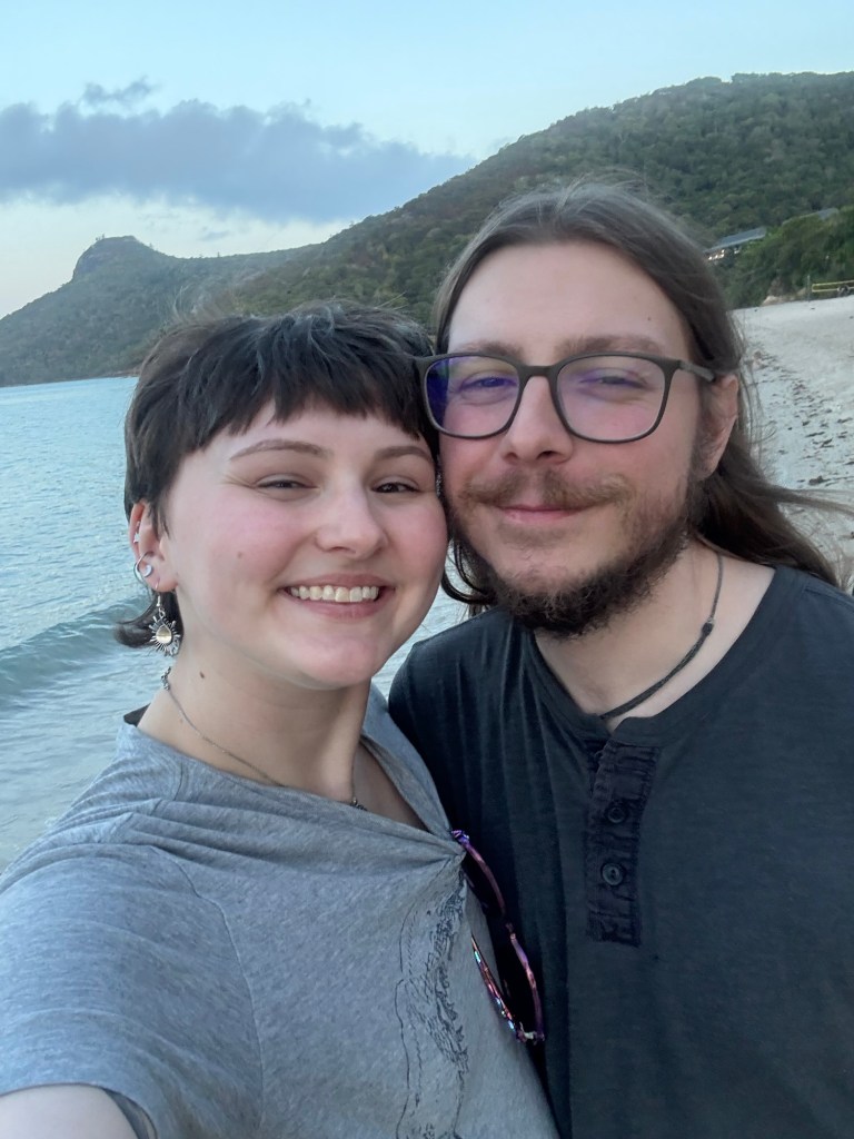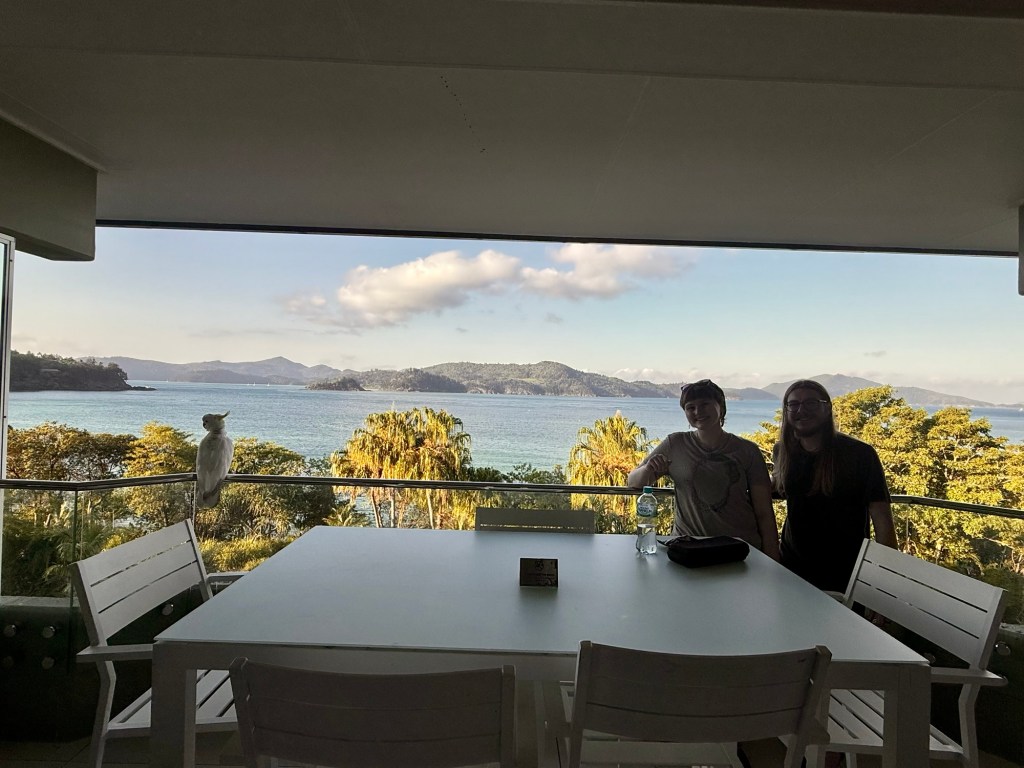 My heart is full as I write this, as our missing piece is back in place: Jenna and her significant other Connor have joined us here in Australia! They left Atlanta on Thursday 10/30, changed planes in both LA and Sydney, and arrived today in Hamilton Island, Whitsundays in Queensland at 2:30 pm on 11/1! These loves have had a helluva few days of travel, and we are so grateful they got here safely and with on time and relatively smooth flights. I felt like my heart stopped today when I saw them walk into baggage claim- I was sooo happy to get them here, as this is the longest we’ve ever gone without seeing Jenna. Joy!!
