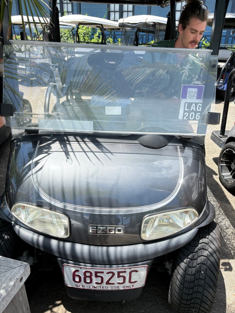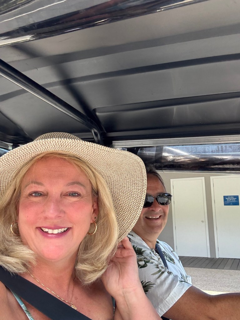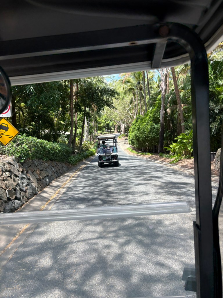 We are renting a VRBO condo here, and upon arrival we found a rep from the rental waiting for us at the docks with a sign with our names on it (felt like celebs!) . He took our luggage and showed us to our golf cart that comes with our rental (the whole island uses electric golf carts!) and showed us to our rental place. He explained to us all about the island, gave us a guide with all the places to eat, shop, and play on the island, and gave us info on the Hamilton Island app (!!) we can use to find out information and events and make reservations for things. Wow!!!