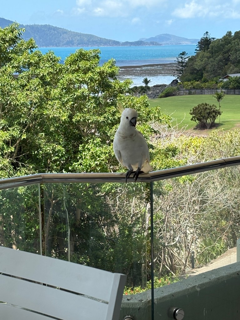 We LOVE our condo here! It so pretty and well thought out, has its own washer and dryer (which after weeks and weeks of travel, we SO appreciate), and has amazing views. We opened the door to our light-filled space, and the first thing we saw was a white cockatoo sitting on our porch railing, peering in the sliding glass doors at us!! šŸ˜šŸ˜‚