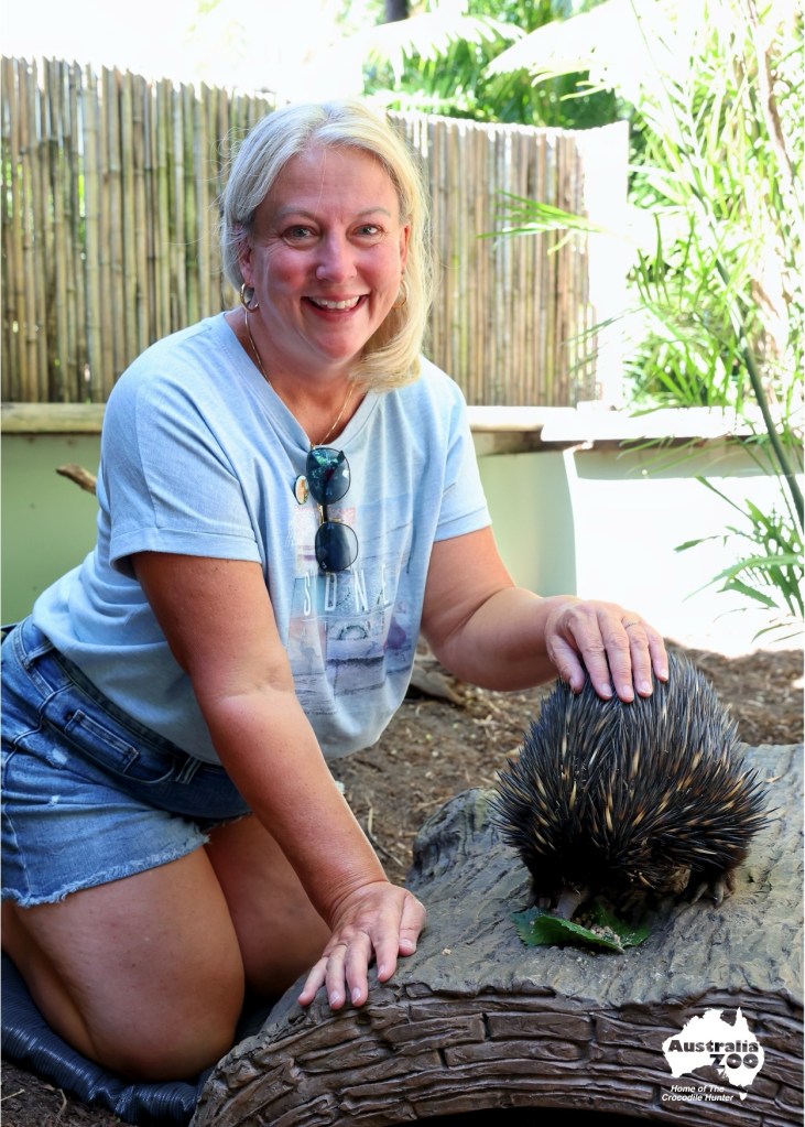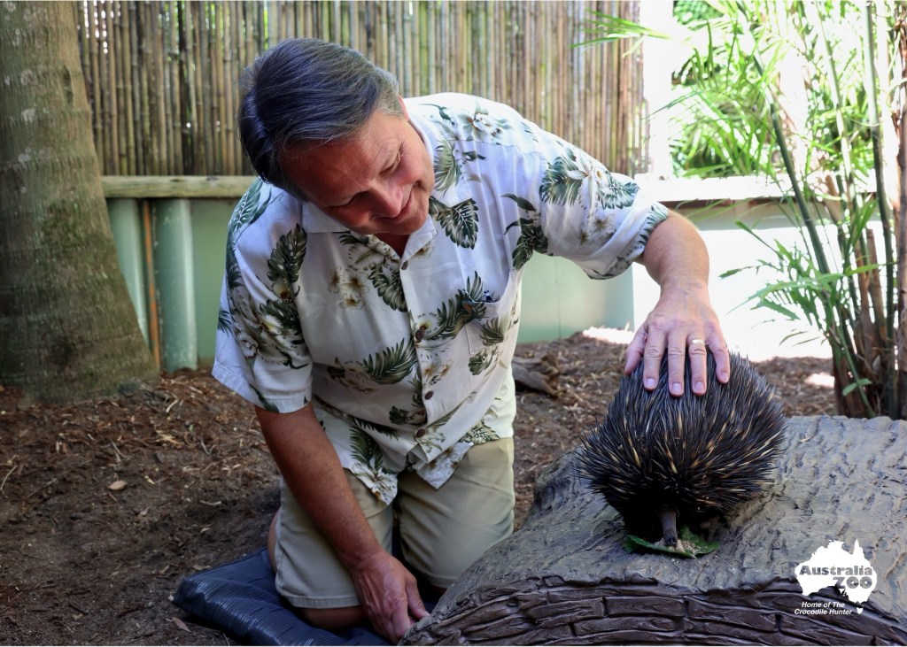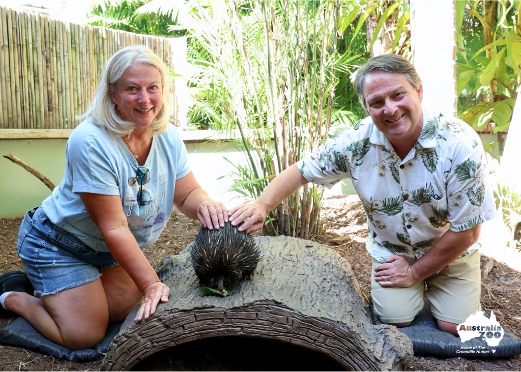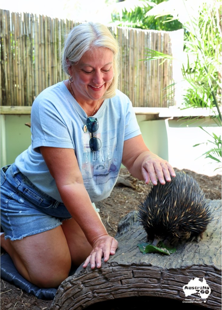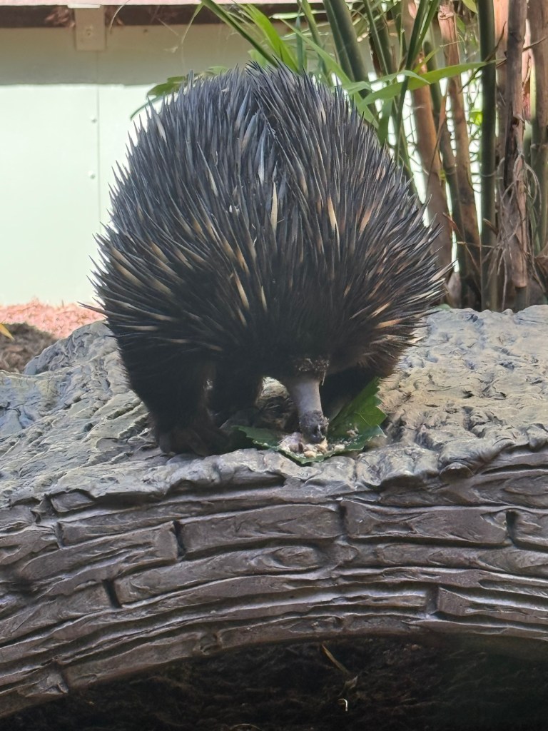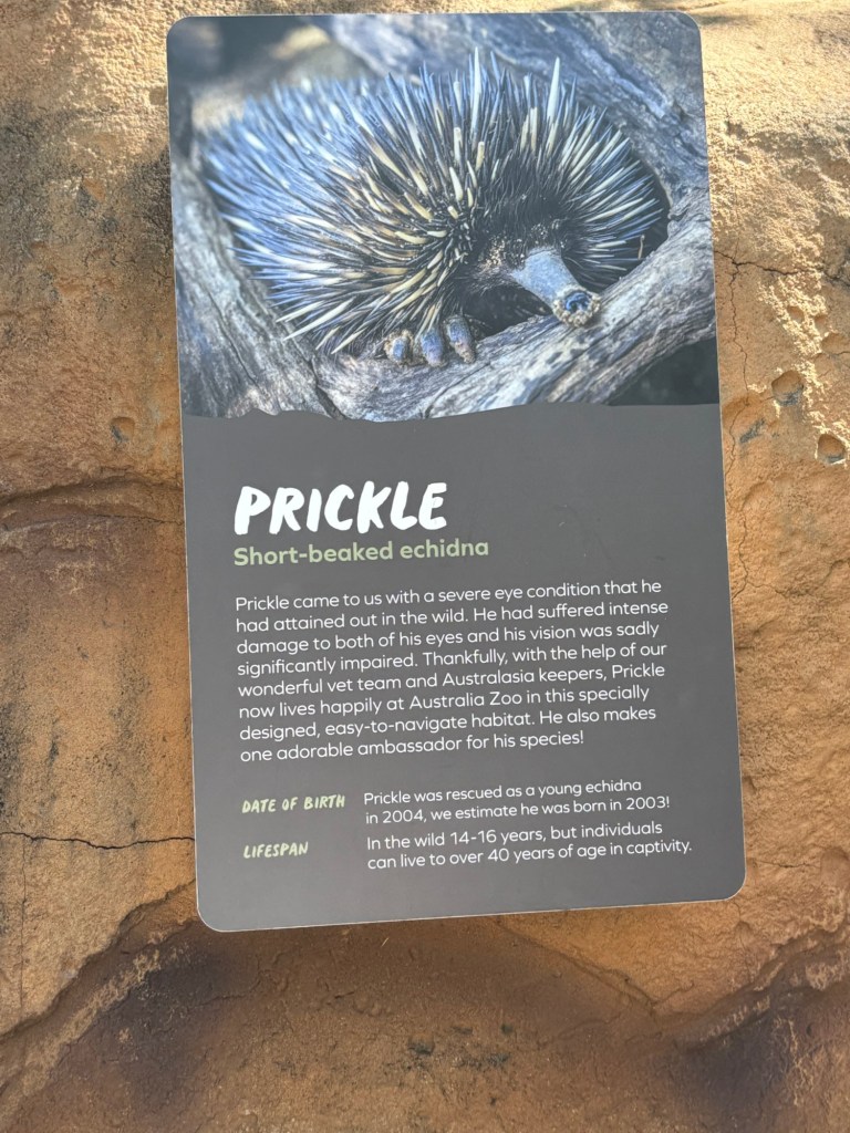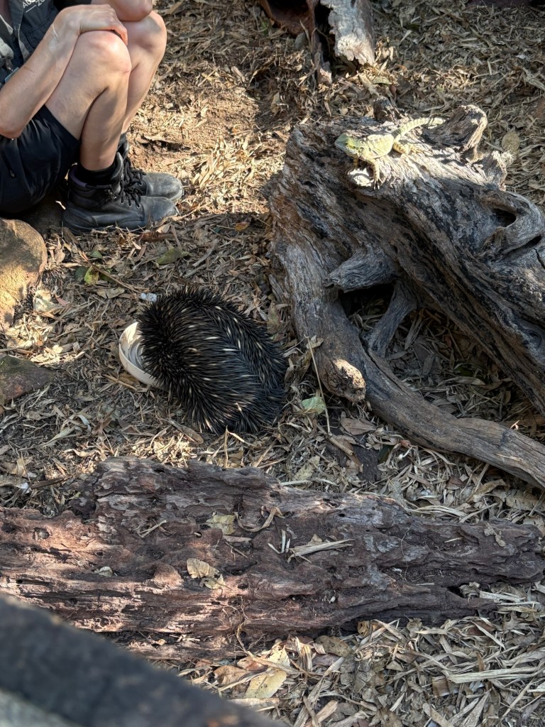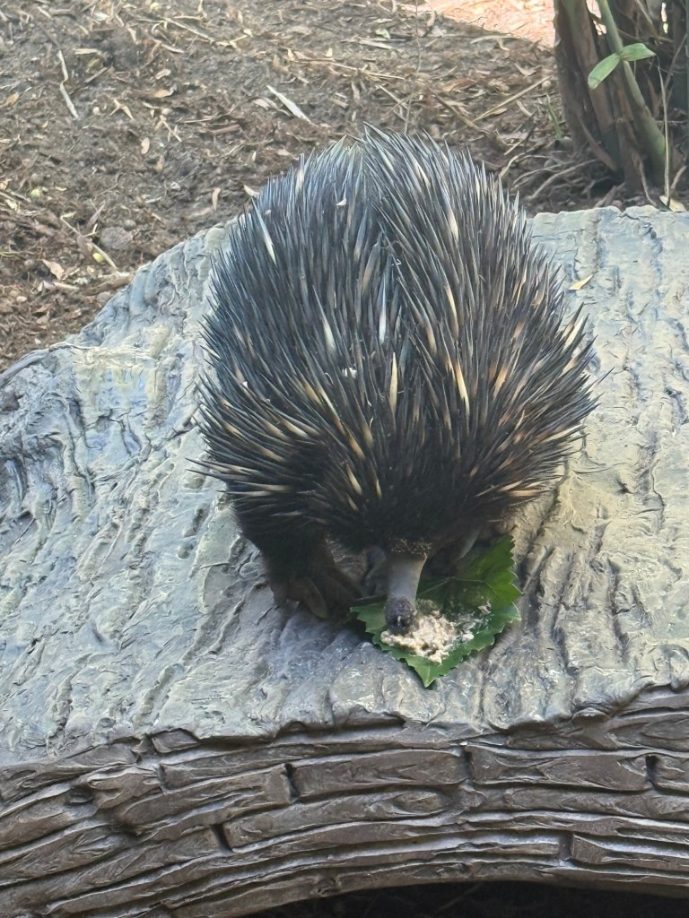 After lunch Rob and I had our animal encounter selection with the tiny little echidna. Ours was named “Three Feet” for obvious reasons, having been found and rescued from a pool drain and requiring an amputation of one of his legs. After his leg was rehabbed, Three Feet was going to be released back into the wild when his keepers found out that he was allergic to ants, one of the main staple foods of an echidna’s diet! Poor little guy! So, he has stayed at the zoo. We learned soooo much about these funky little egg-laying marsupials! Plus we got to pet Three Feet, who had spiky quills that felt like waxy plants. He was so cute! We also met his friend Prickle.