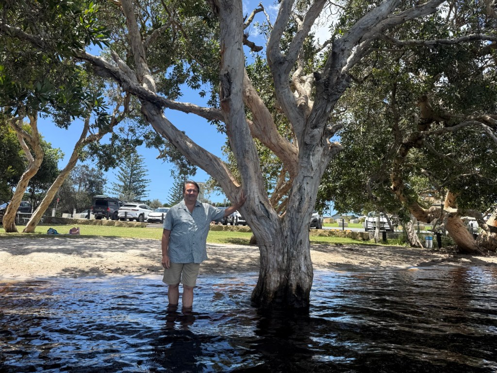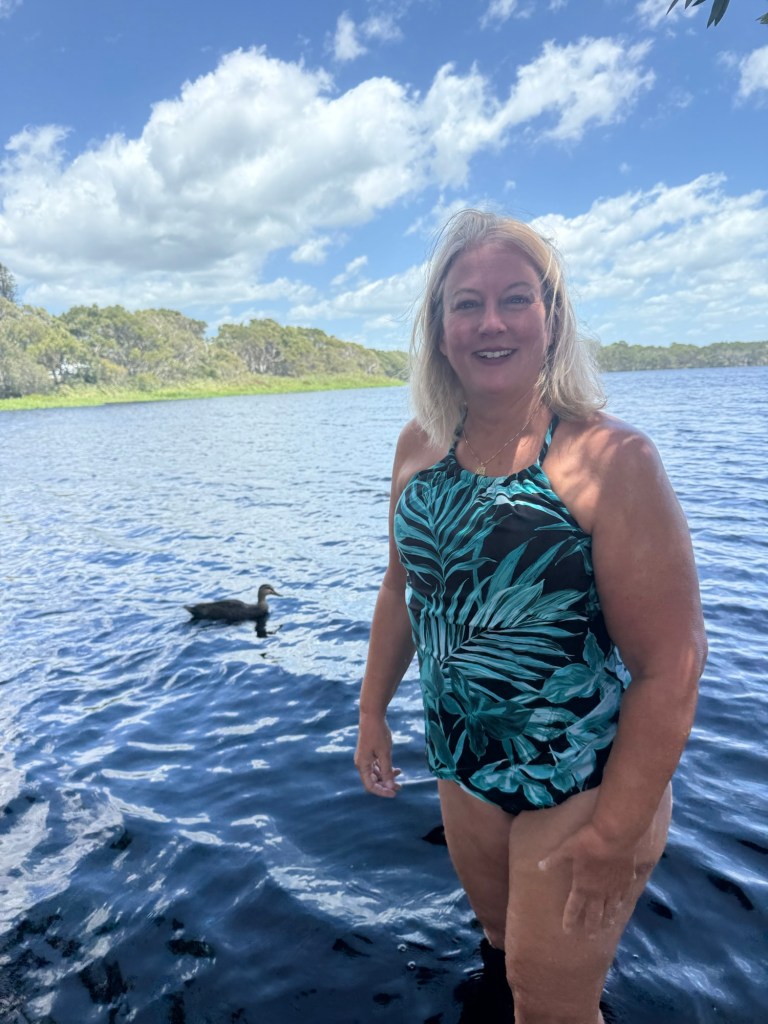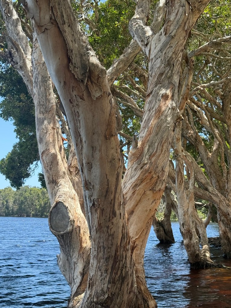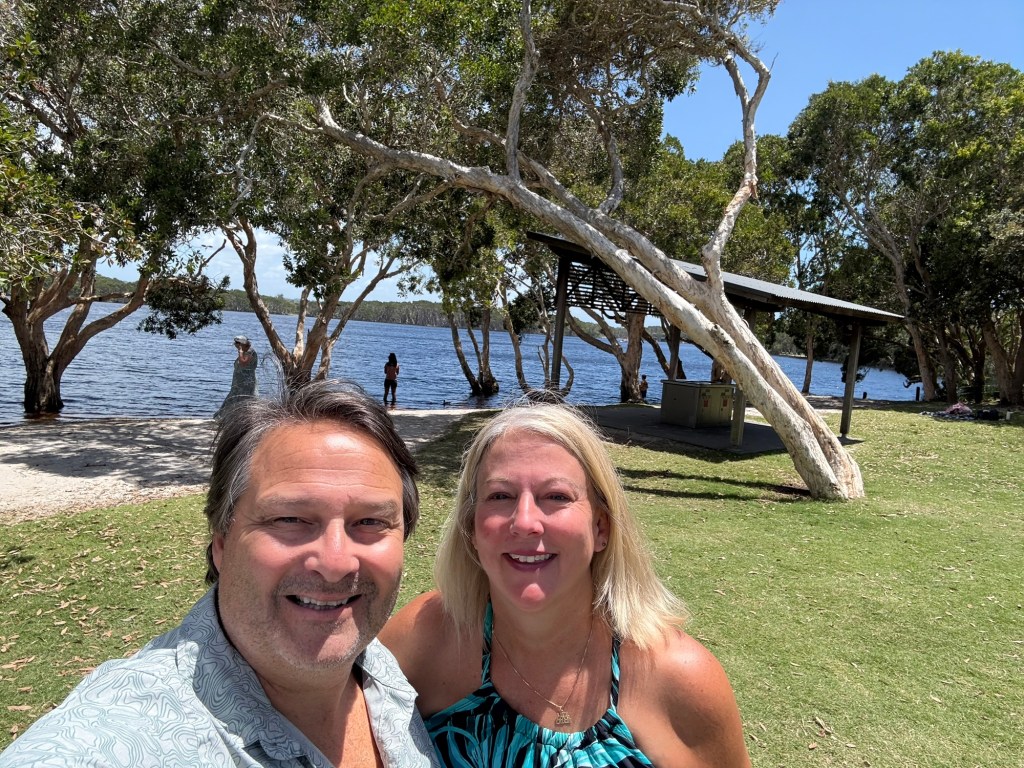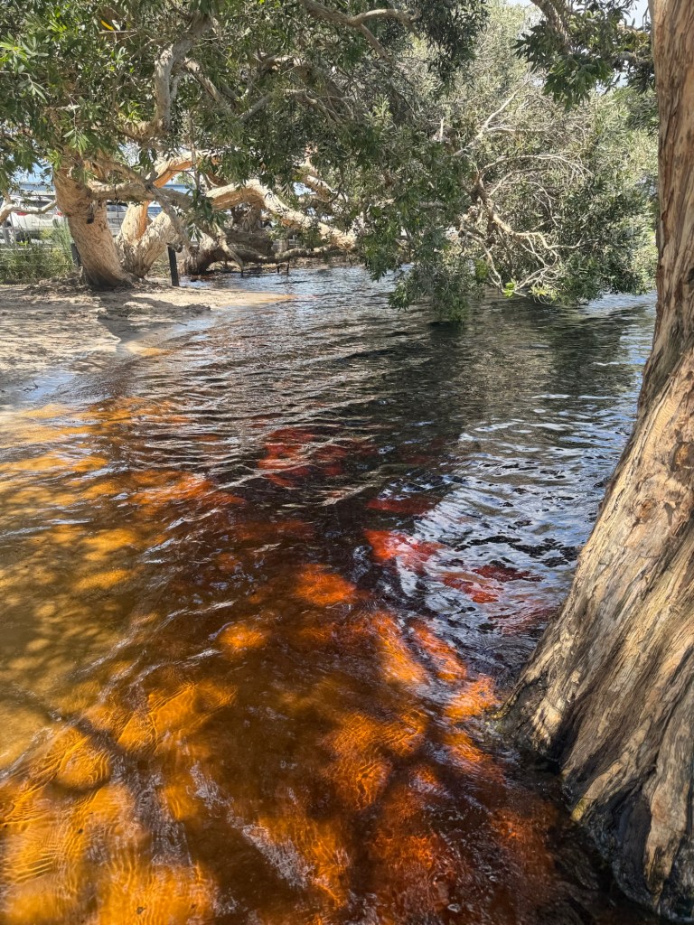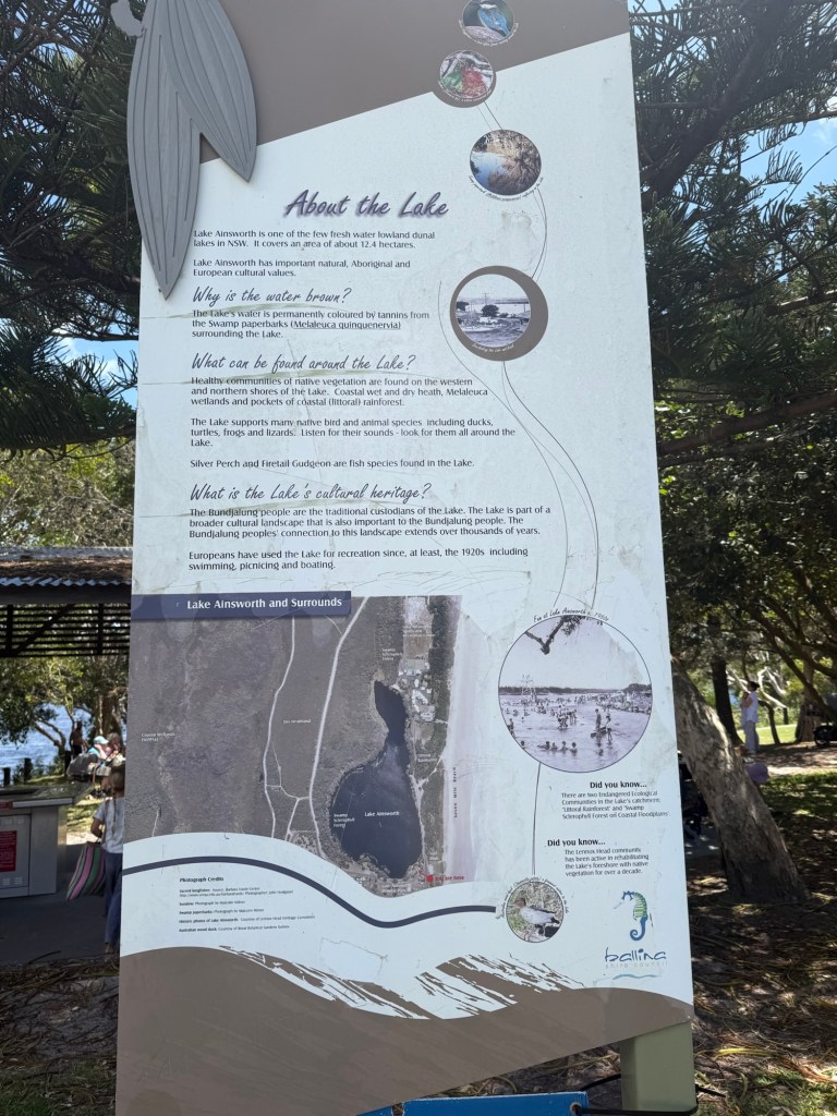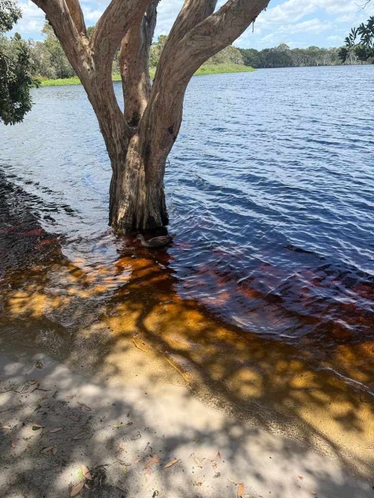 Our first stop today was a beautiful lake (fresh water but right beside the ocean!) called Lake Ainsworth. What makes this lake special is that it is ringed with tea trees (swamp paperbarks), and they emit a sap/oil that has been used for skin conditions, cleaning, insect repellent, and more. I used to use a tea tree shampoo back in the day, and I saw that many locals duck in here daily for a “skin and hair softening” dip, so I wanted to check this out. The water was- as promised- shades of orange to coffee brown- and really pretty to look at. Getting in, you could feel the slightly oily properties of the tree sap in the water, but it also smells good. Rob waded in, but I went for the full dunk. Neat stop!