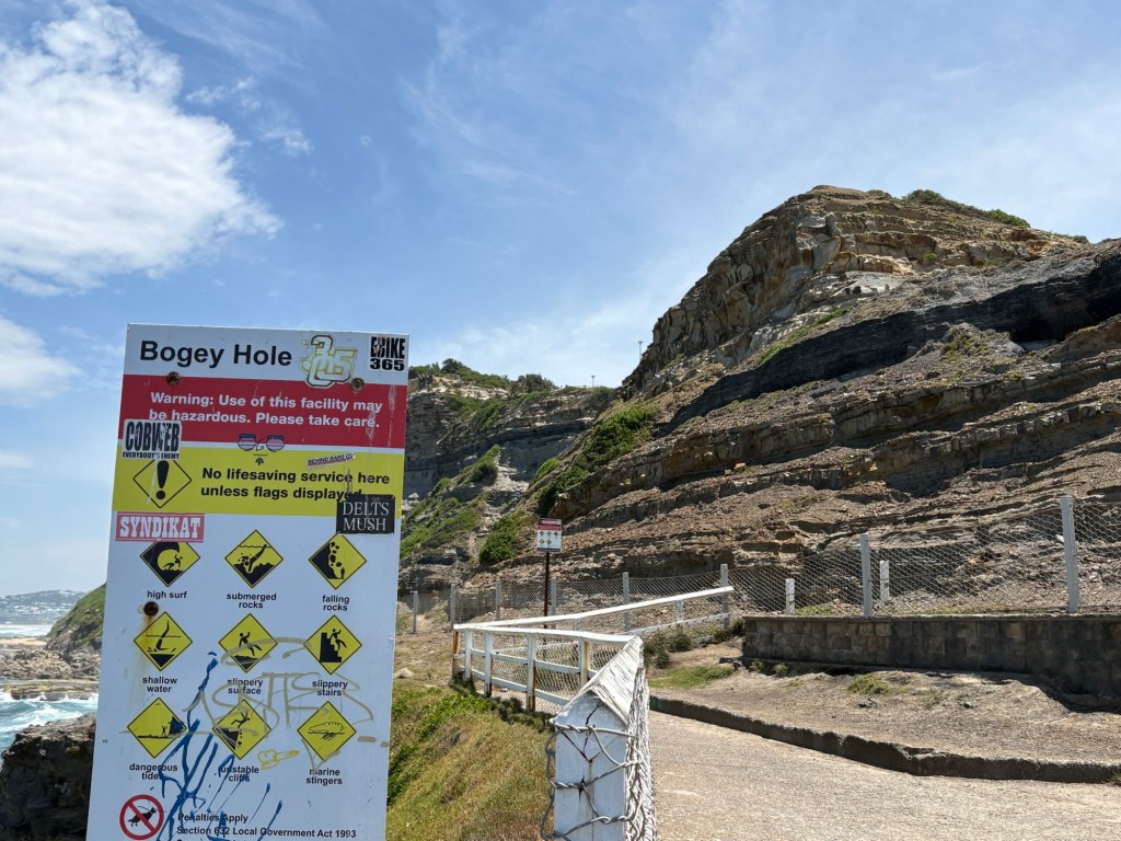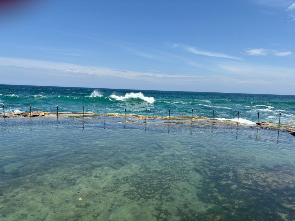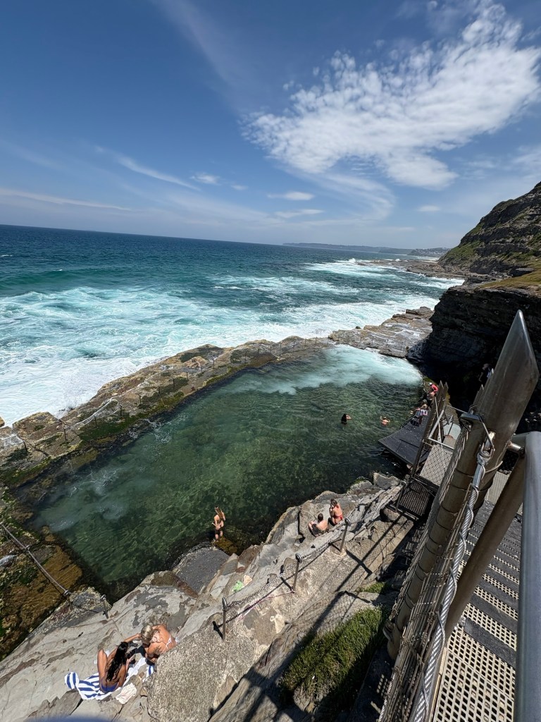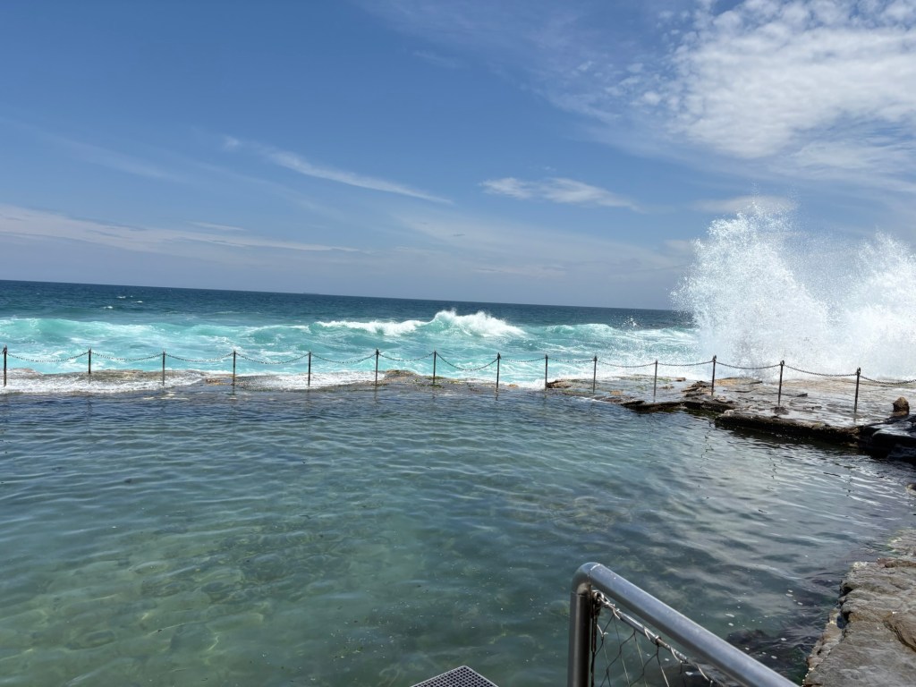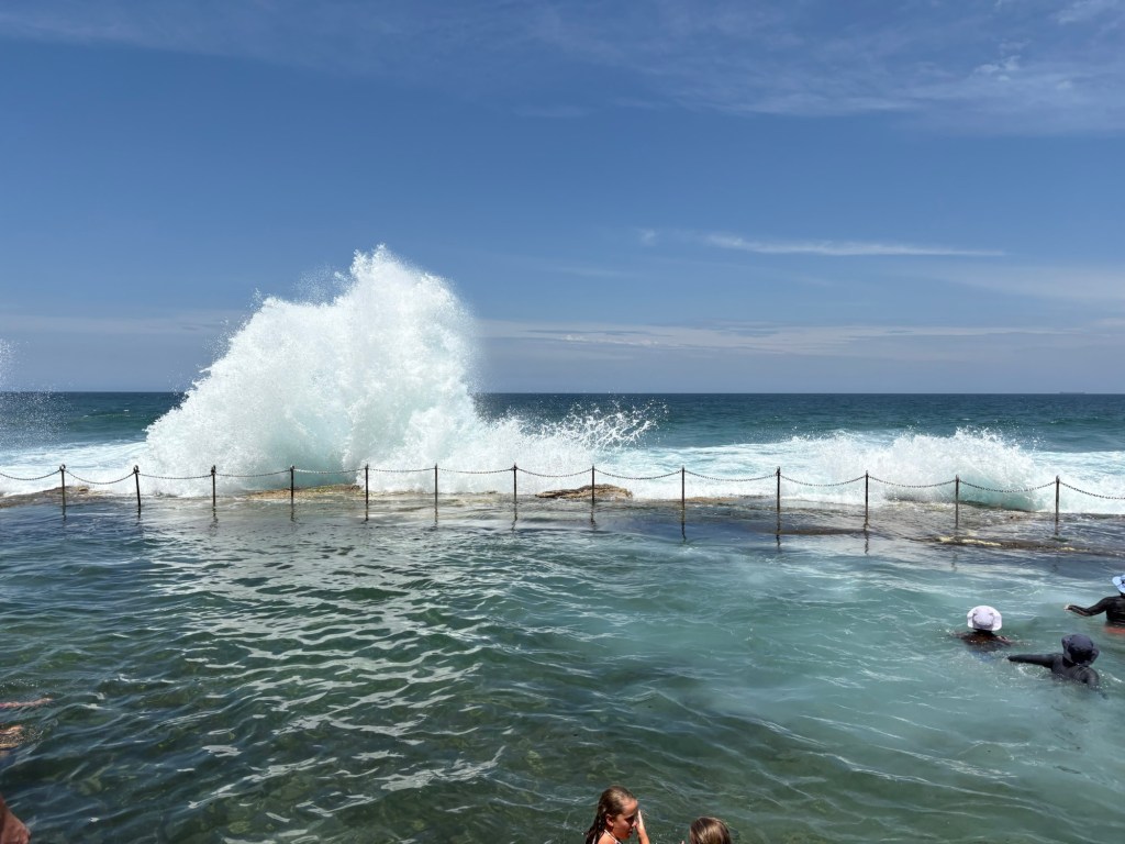I have a new favorite sight/activity for this leg of the trip! The Bogey Hole is a hand-carved swimming hole in the rock cliffs of Newcastle created by convicts under the command of Major James Morisset, in 1819 for his personal use. The pool was originally referred to as the ‘Commandant’s Baths’. Basically this rock ledge sits right in the cliffs next to the ocean. And when the crashing waves come in, they spray up as they hit the rocks and keep the pool filled. They even carved out a little drain area into the rocks. Despite the sordid past, it’s pretty fascinating and a beautiful spot to watch waves crash and swim safely in sea water overlooking the ocean but not IN the ocean. I fell in love with this spot instantly and would put it on my “definitely want to go back” list.