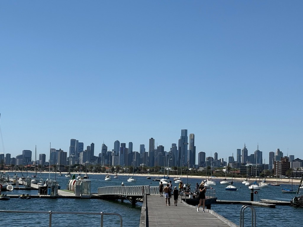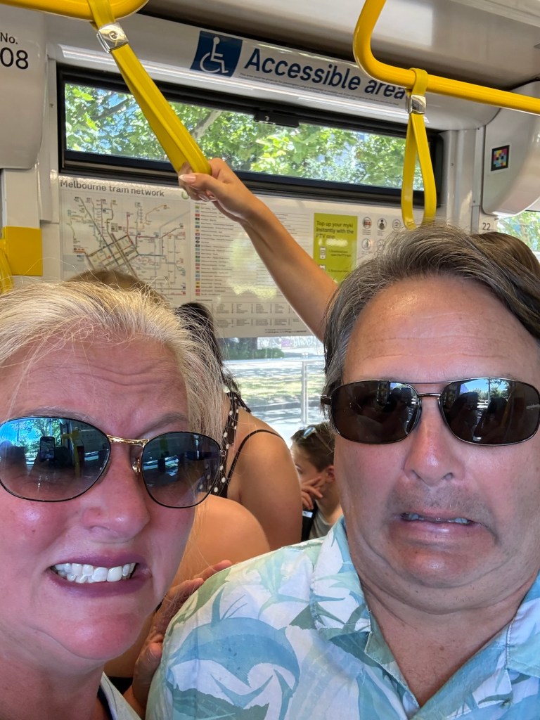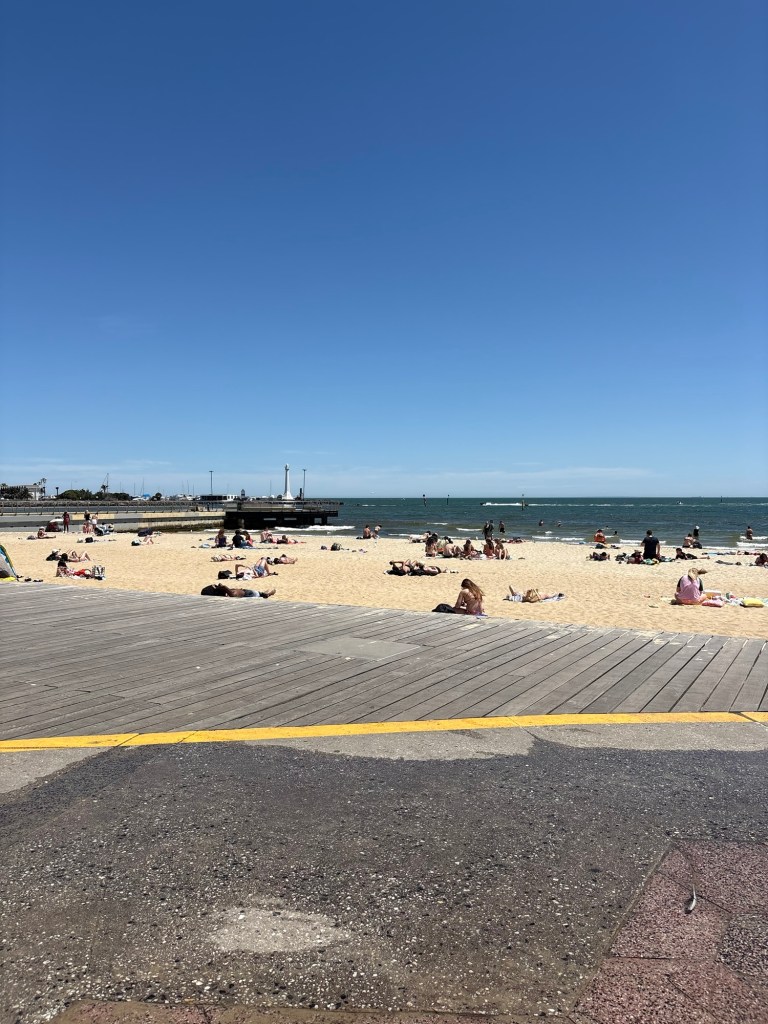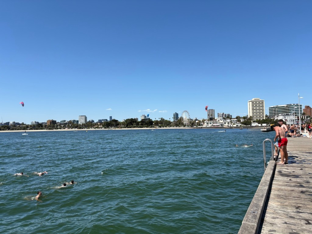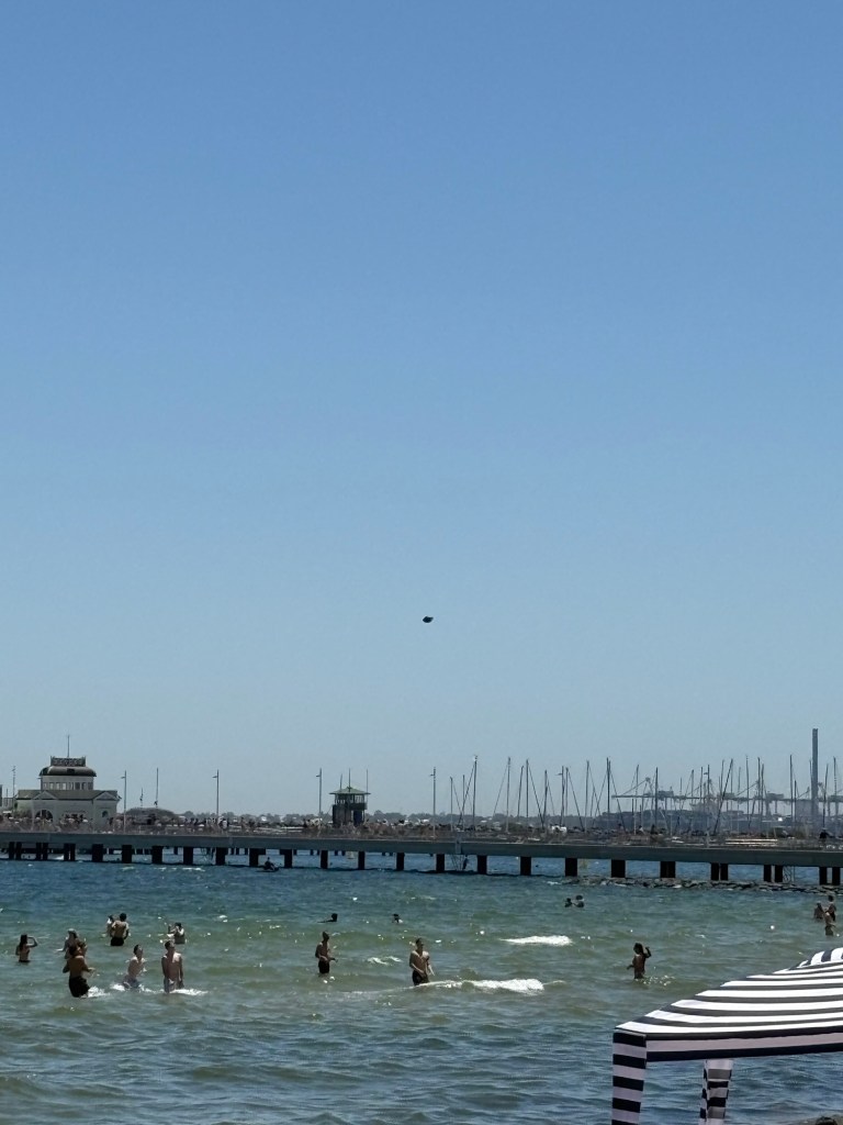 As the temperature in Melbourne crept up toward 100 degrees Fahrenheit today, we decided today would be a good day to hit the beach and take a swim. So, this morning we, along with about 30,000 of our closest acquaintances, hit the tram and headed to St. Kilda Beach.