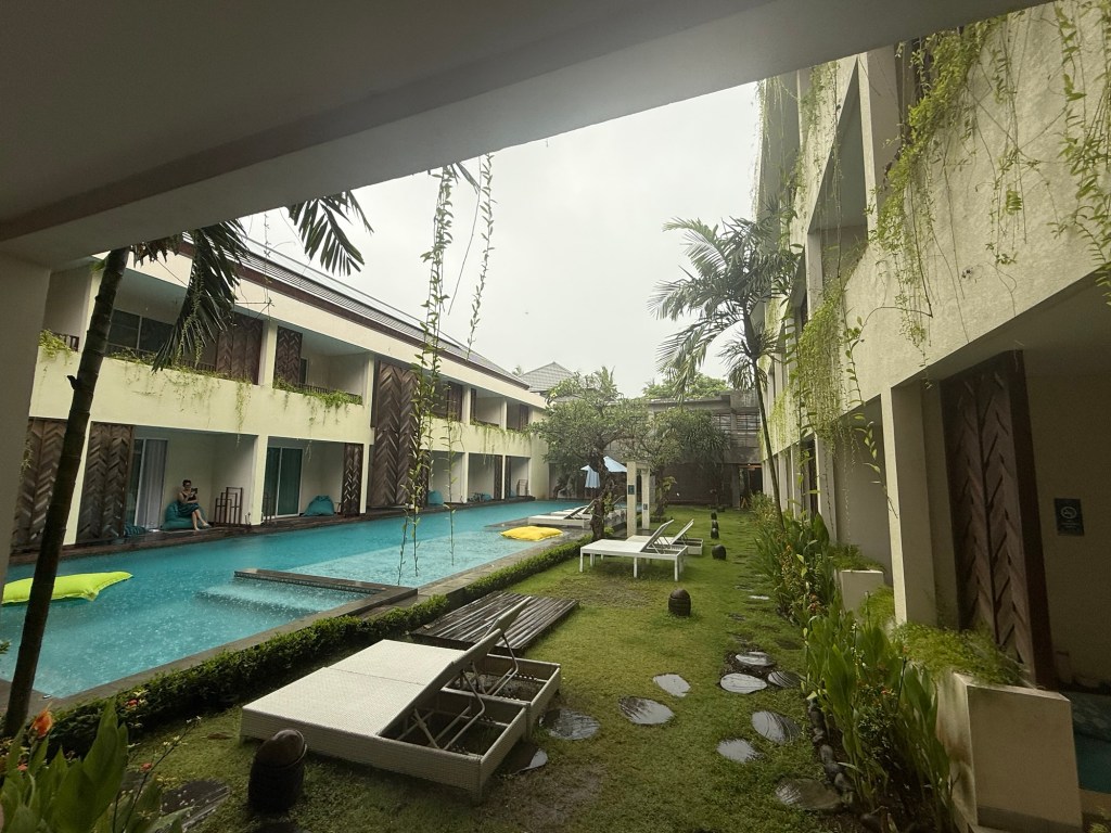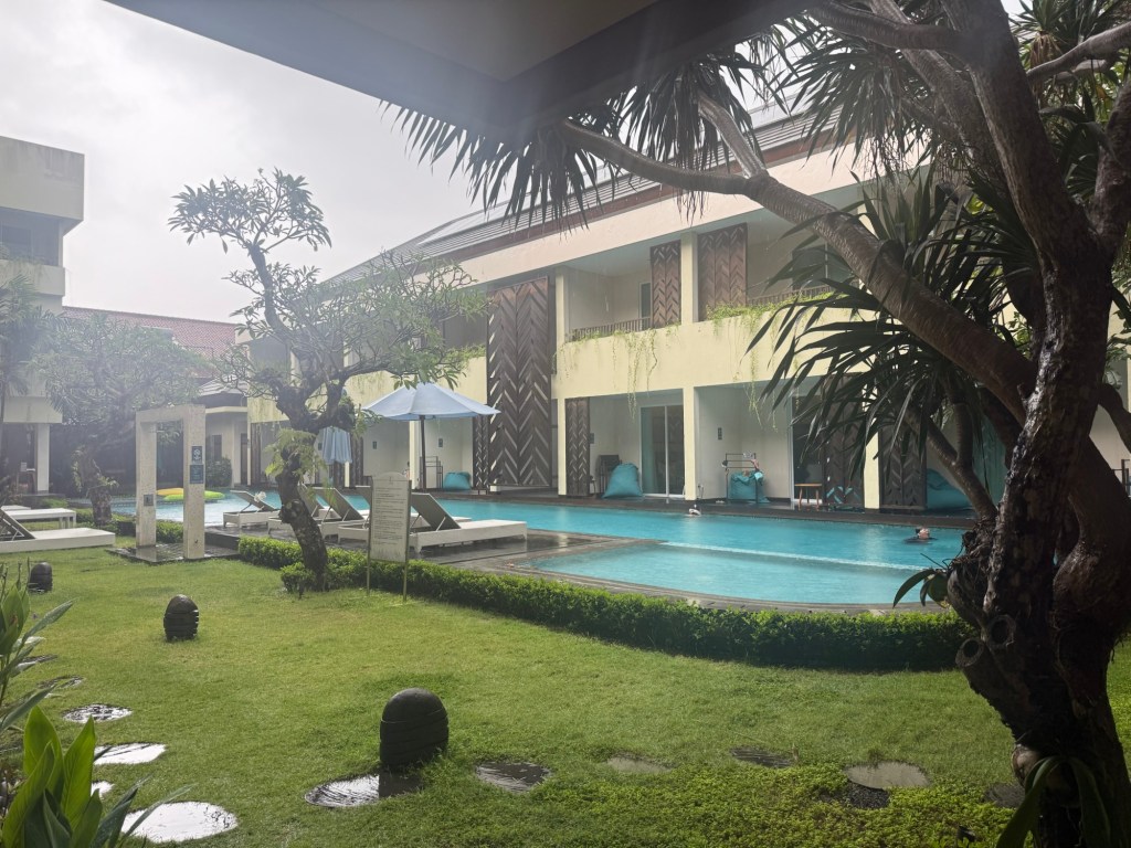 We were awoken at 4:00 am with a driving rain on the hotel roof and it didn’t stop the entire day. It became lighter from time to time and then became a deluge just as often. We planned today to lounge by the pool and soak up the sun – oh well.