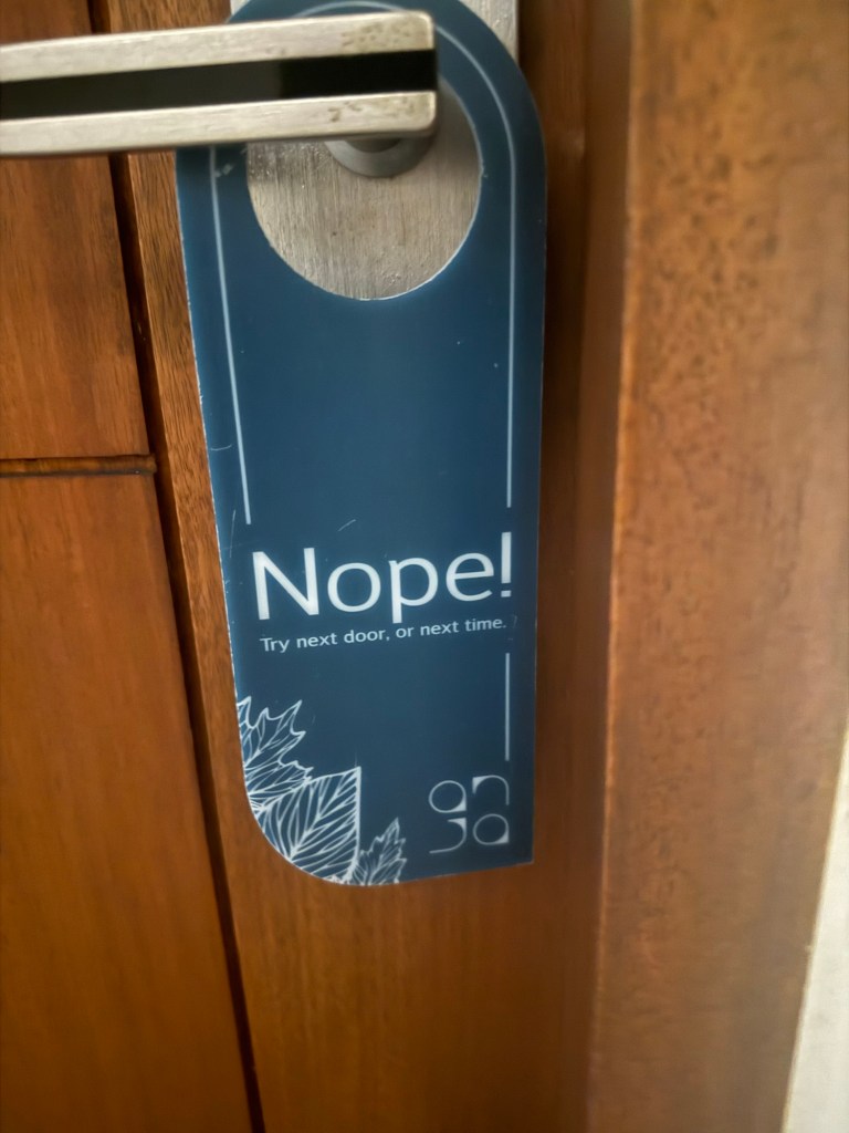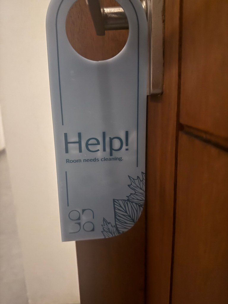 The afternoon was forced relaxation, including trying the local beer (kinda like Budweiser), reading, scrolling, and napping. All in all, not a bad afternoon. We were amused by the hotel room door signs for privacy and cleaning – Nope or Help! 😂
