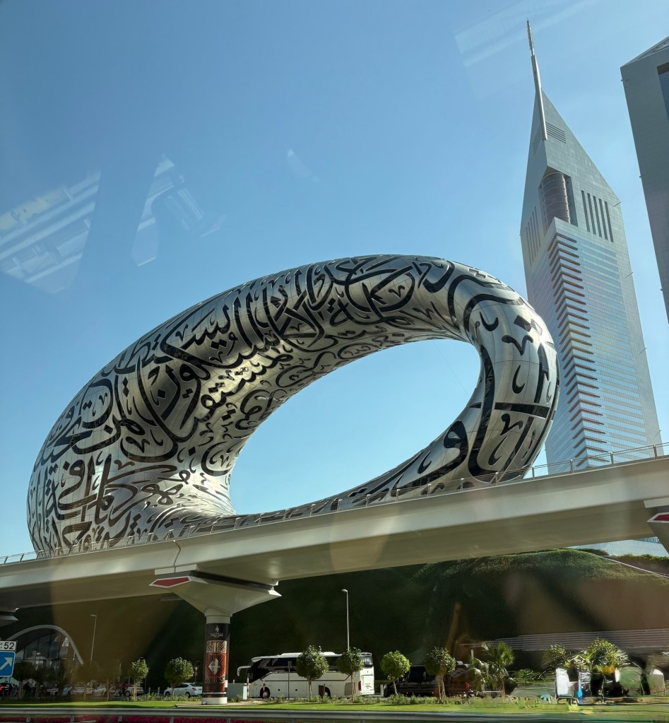Anyway… our final flight before the US was “only” eight hours, which wasn’t too bad. On the way to the airport we passed Dubai’s Museum of the future. This place was on my list of “If we had one more day in Dubai…”, so I was happy that I at least got to see this incredible building! I fell in love with the building while watching the Amazing Race (it was a stop for one of the races) and knew I wanted to see it. And I did! 😊