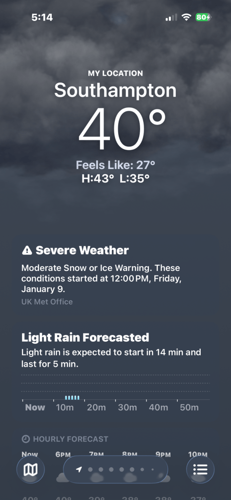 Southampton does have a good central business district with plenty of shops and restaurants, so we have managed to gather most of what we wanted for the cruise. We are repacking the new suitcase we purchased here and have plenty of laundry to do, but it’s all good. We had a good pizza dinner last night and did a last run of stores tonight. The temperature here has been mostly in the 30s, but no rain (and no snow 😢). I wouldn’t have minded a little snow this winter!