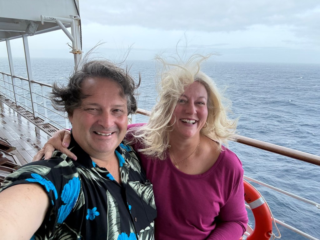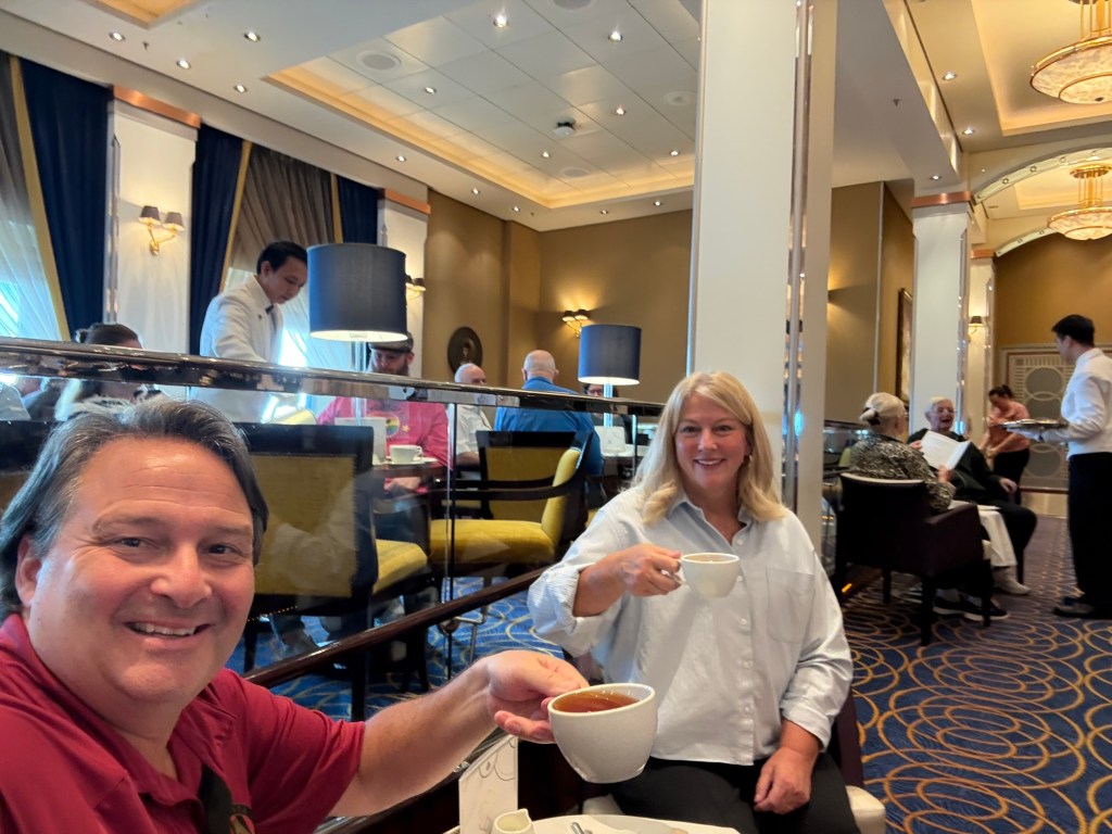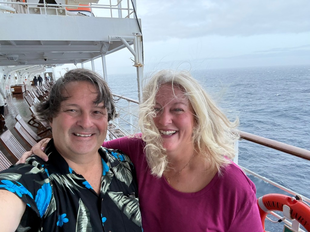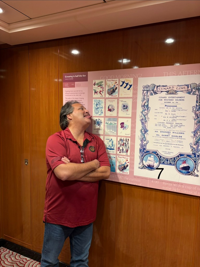 We are enjoying sailing on the Queen Mary 2 for our “crossing” and not a “cruise”. The QM2 is the only active ocean liner in service today. Apparently an ocean liner and cruise ship are technically different. An ocean liner is designed primarily for transportation across seas or oceans on a regular, scheduled service, unlike a cruise ship where the voyage itself is the main purpose primarily along coastlines with multiple ports. Ocean liners are built with stronger hulls, deeper drafts, and more powerful engines to withstand rough open ocean conditions and maintain high speeds and schedules. This makes sense once you’ve been on the QM2 compared to other ships. The QM2 is beautiful and elegant, but not as large and with fewer amenities than the newer cruise ships. And while it has been rough in the North Atlantic, it has been quite manageable on board.
