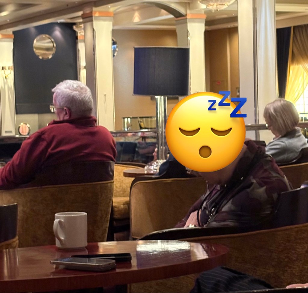 I wanted to do a whole montage of people sleeping in public spaces on this boat, but I think our fellow passengers can probably afford better lawyers than me, and since this is a public blog, I rethought that idea. So, to protect the innocent, or- in this case- the sleepy, I have a few anonymous snoozer photos below so you get the idea. I mean, they’re everywhere. Except in their cabins. Why would they want to sleep there?!