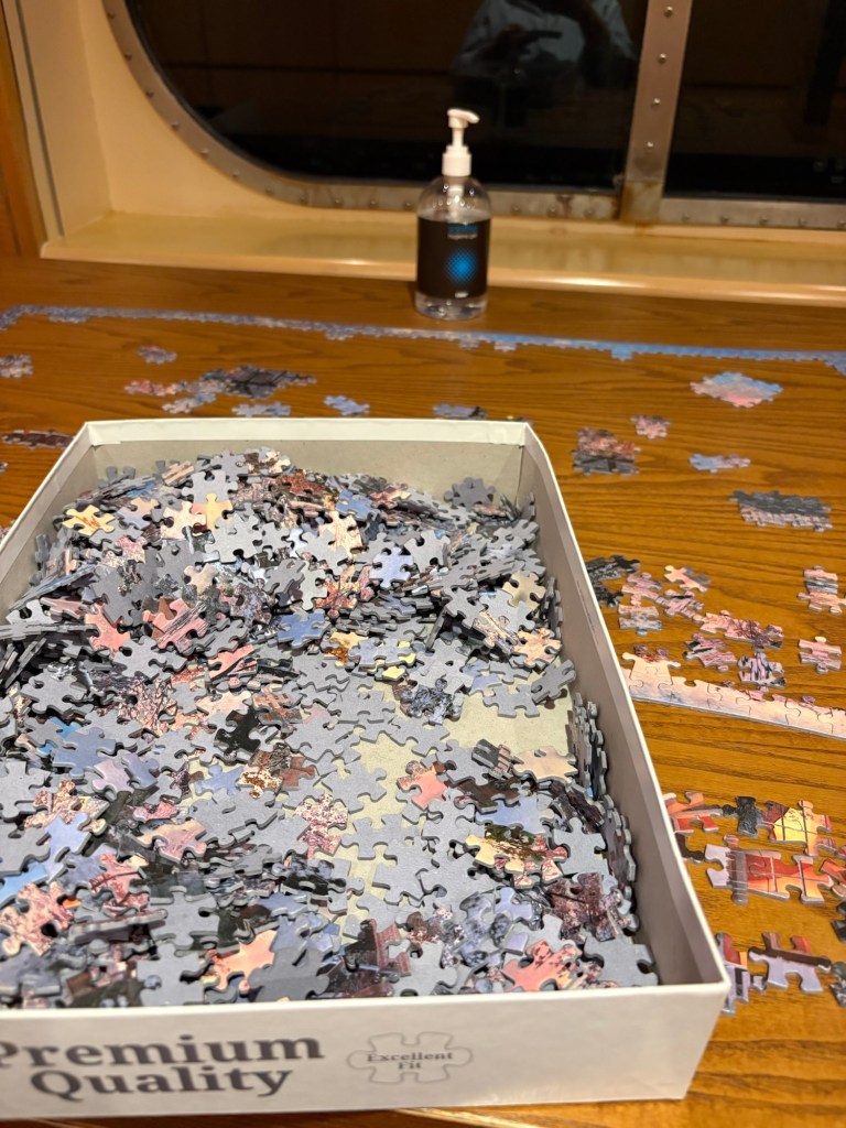 So we have frittered away our days with books, puzzles, eating, another scavenger hunt, fighting old people for laundry machines, watching old people sleep in public spaces, watching shows, high tea, team USUK trivia, making old people angry by existing or taking a seat they might have had if they came earlier, silent disco, art talks, and other entirely useless and highly entertaining pursuits.