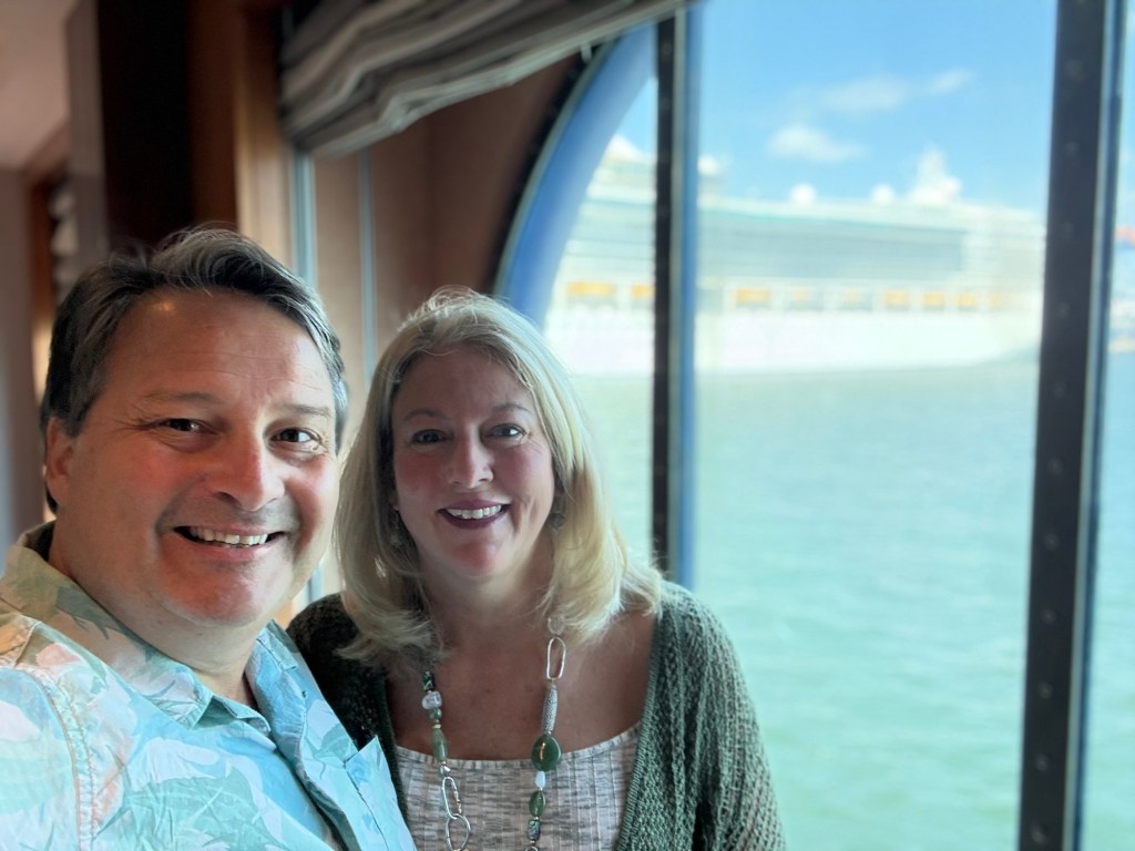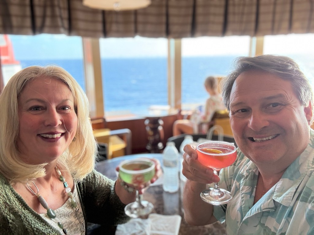 Although this was only our 4th time sailing on Celebrity, they match loyalty points with Royal Caribbean, and we have sailed Royal many times. We were delighted to find out that Celebrity moved (matched) us up to a higher loyalty rewards level on this cruise, so we are now at the “Elite” level (instead of “Select”) of the Captain’s Club. This means some cool perks for us, including a couple free bags of laundry (very important when you are sailing for 25 days!), invites to special events, and – our favorite- free (select) happy hour drinks from 5-7 daily! Nice!!! Here we are enjoying our “perks” this evening.