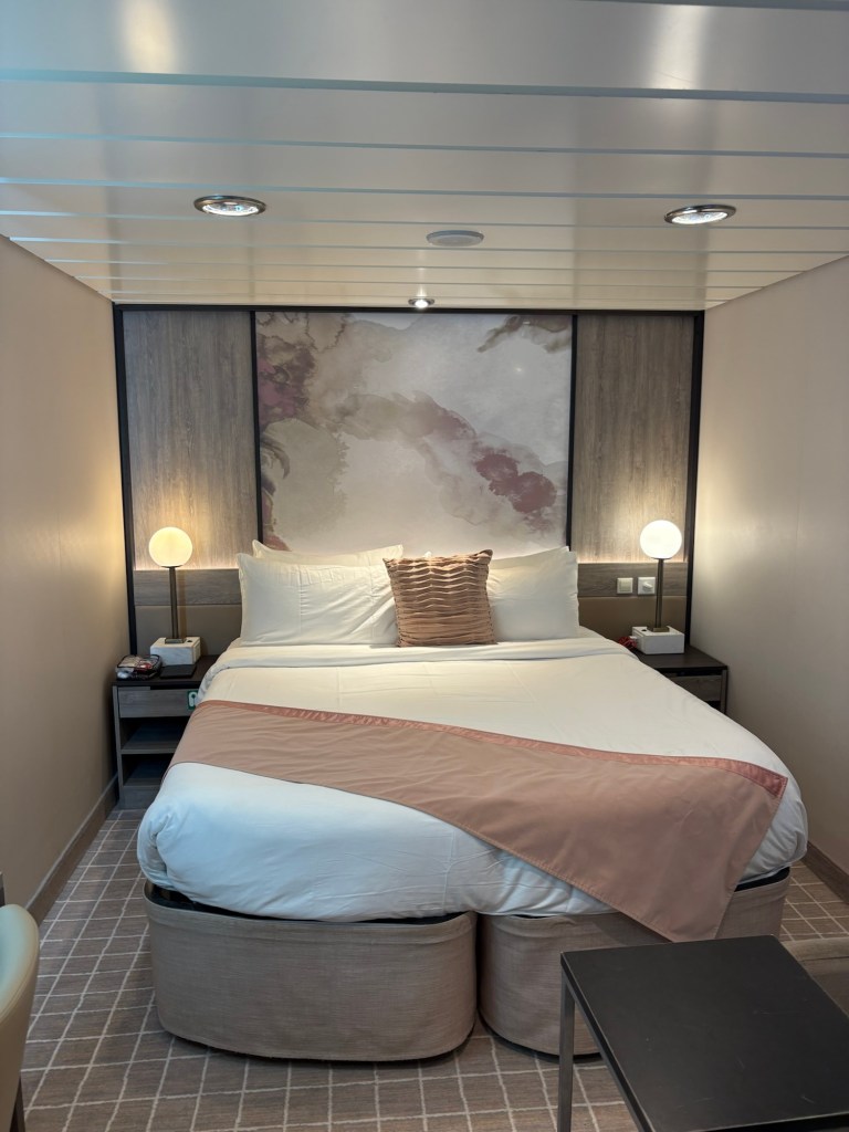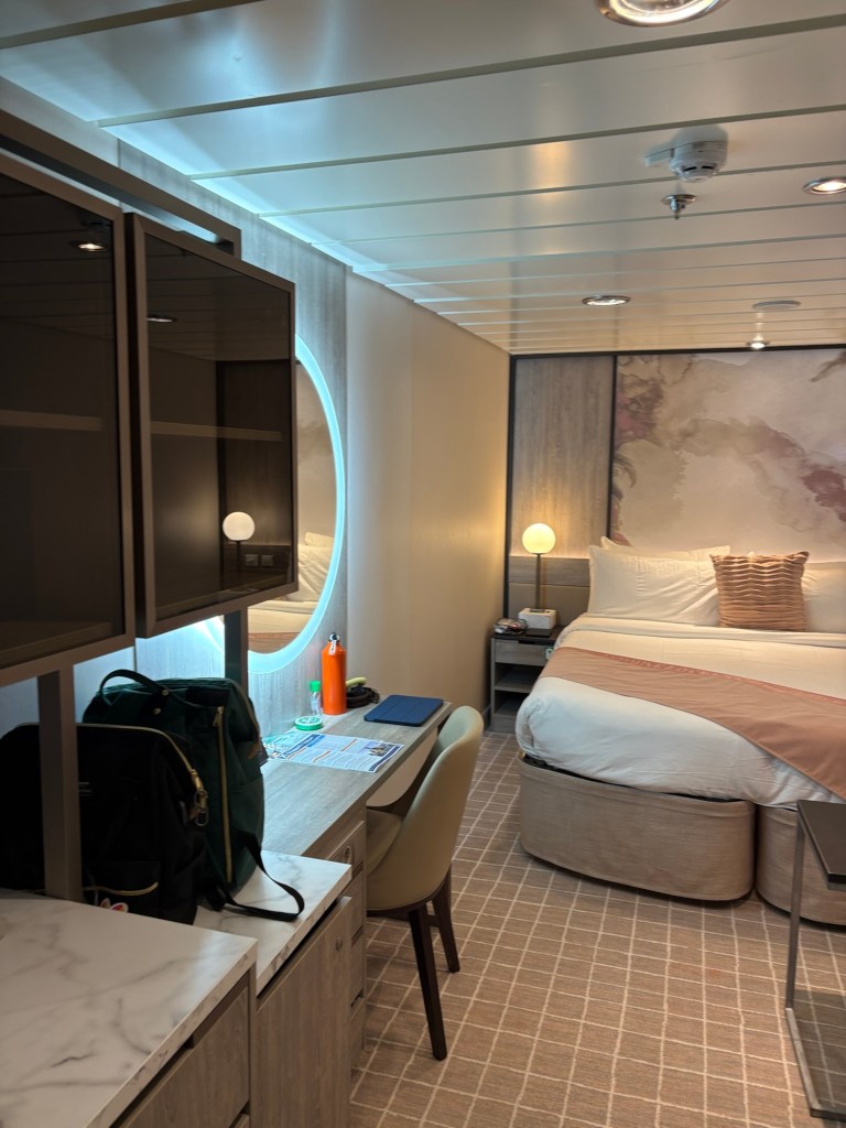 We left our hotel this morning and took a shuttle to the port, followed by the truly easiest boarding process we have EVER had in all our years of cruising. From shuttle drop off, we were through security and checkin and on the boat within about 8 minutes! Well done, Celebrity and Fort Lauderdale Port employees!! After boarding we dropped off our things in our cute little cabin (we usually have an inside cabin on most cruises to keep costs down and because we actually like cold, dark caves) and went to check out the ship. The Summit is an older, smaller ship but it has a great vibe and lots of cool, old school details like wood paneling and funky shaped elevators.