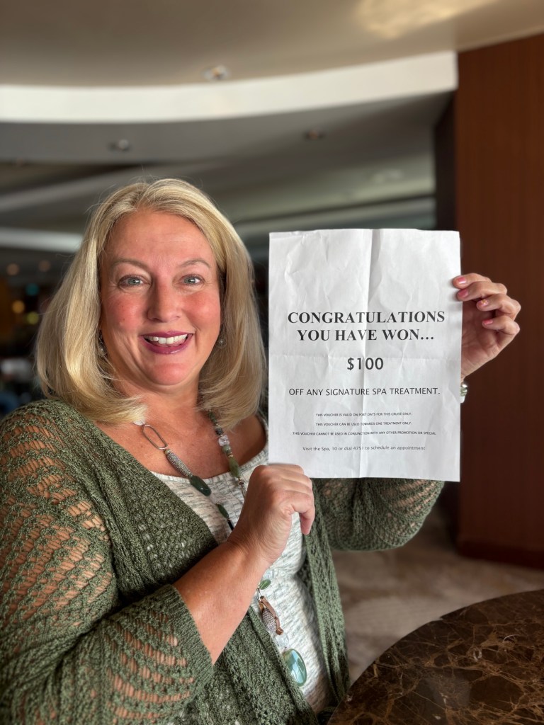 When we got on board today, we spent a few hours wandering and checking out the ship and entering all the raffles and giveaways they often do on the first day of a cruise. I was soooo excited to hear my ticket number called at the spa raffle today!! I have booked and will enjoy a massage later this cruise!
