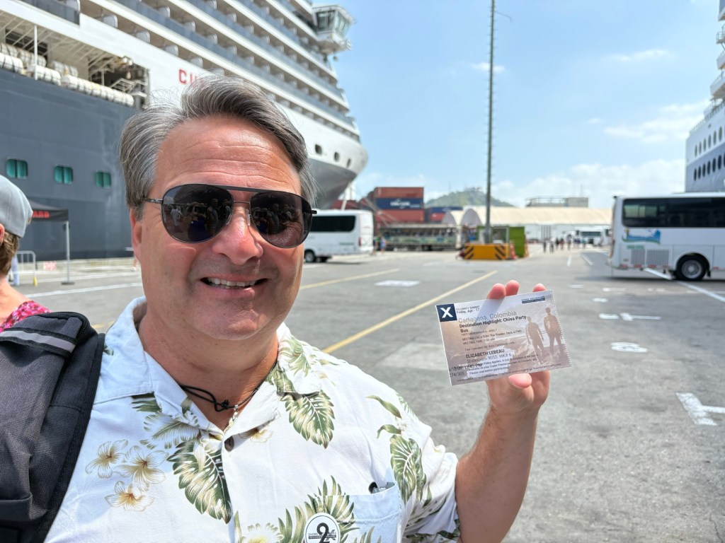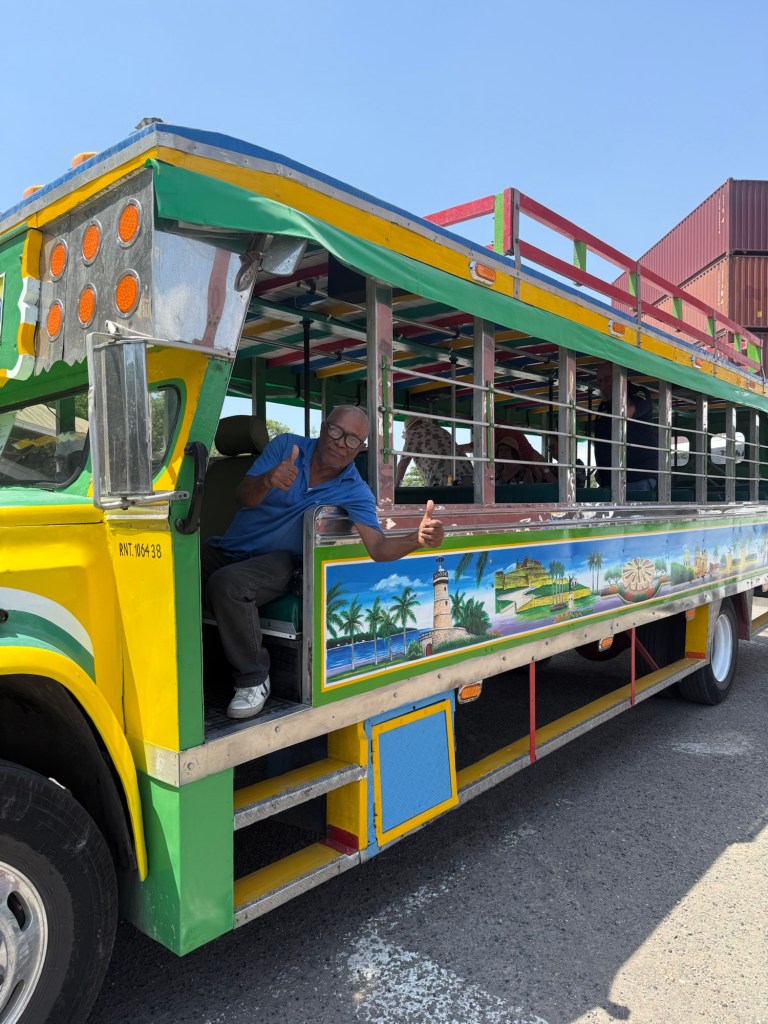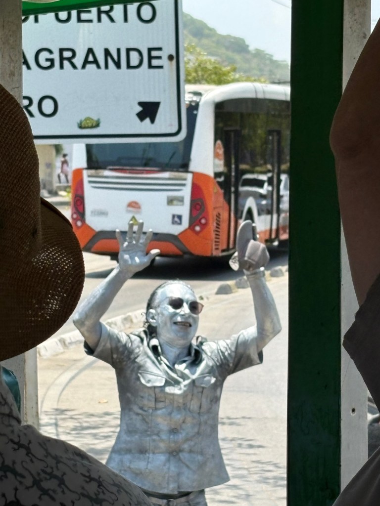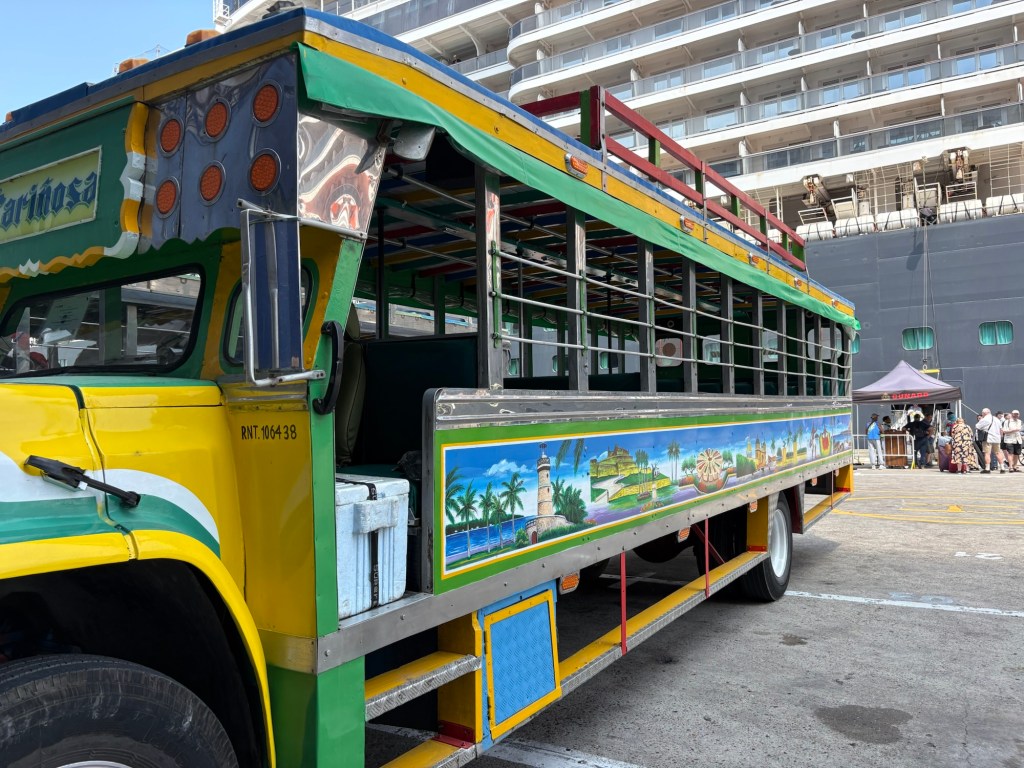 If you are looking at the Chiva bus pictures below, phito one requires some background explanation as to why it made the blog. Our ship strangely decided to schedule every single excursion into Colombia today to start out of the theater on the boat. This made for insane crowds at the theater this morning, where we all had to line up and walk across the stage to get our excursion tickets and information. I was lucky enough to snag some of the rare available seats in the theater, so I was sitting and waiting for him. For a reason only Rob and God know, he decided this morning was his moment to entertain the cruise ship masses, so when it was his turn to walk to the table and get our tickets, he turned around and waved and danced for the audience. Of course this led to thunderous applause from hundreds of bored passengers. And this was all before we got to the “bus bar.” I might or might not have hunched down in my seat in mortification… err, I meant pride… a little as he was returning to me 😂.