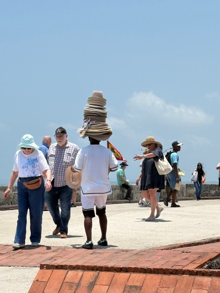 Between our port talk and today’s tour, we learned that Cartagena is the fifth-largest city in Colombia, with the largest being the capital city of Bogota. There are over a million people living here, and the walled city is a UNESCO world heritage site. The big Colombian exports are emeralds, coffee, petroleum and gold (which is NOT what Gloria said!). One of their cool local craftworks include the sombrero vueltiao (the “turned hat), which is a traditional Colombian hat handwoven by the indigenous Zenu people and made of arrow cane. They were so interesting and we saw them everywhere, but I only had the one so-so picture. So, I had to go to good old Wikipedia to show you the first image below, but yep… this is how they look. We have limited suitcase space as usual, so we didn’t buy anything today (but we have our eye on a few things for Panama tomorrow).