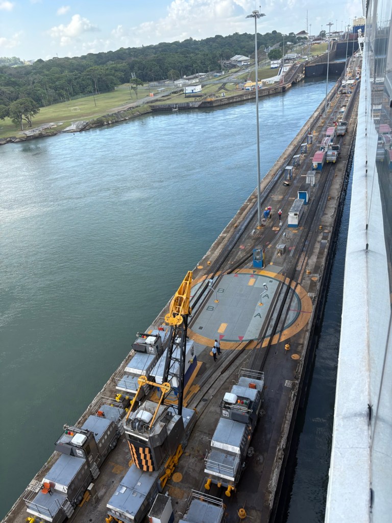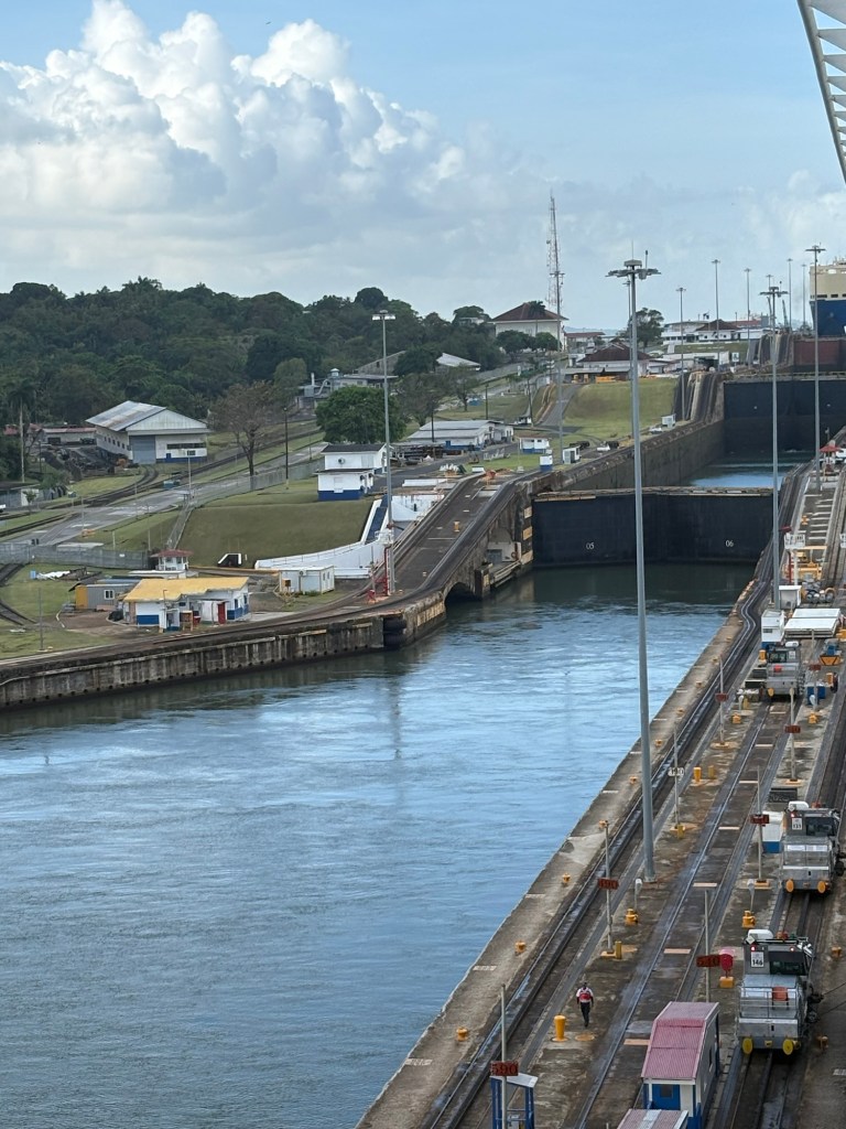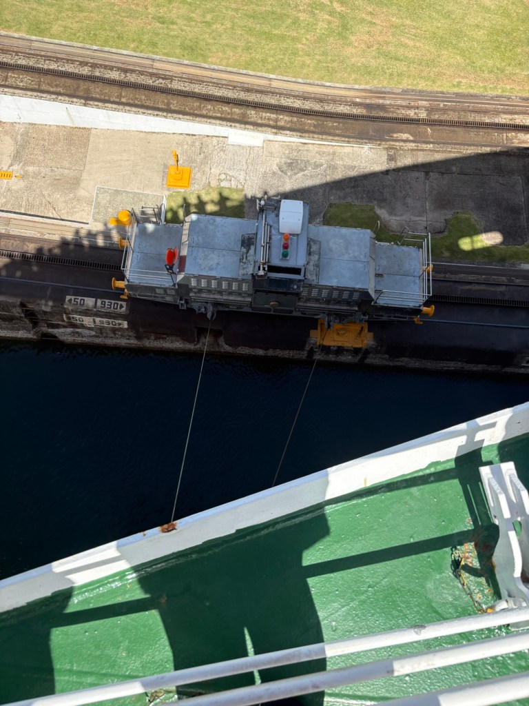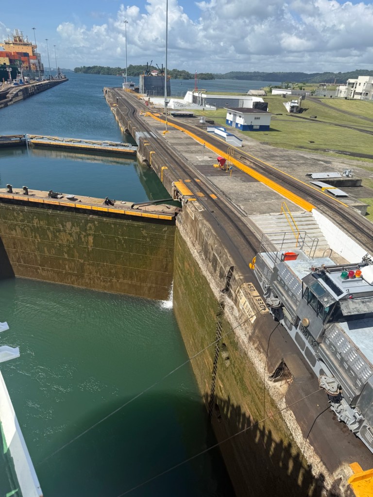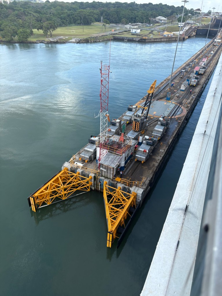 The Panama Canal’s system- 1 of the 7 man-made wonders of the world- involved building out a giant man made lake (Gatun Lake) and dam in the center of the country at a high point, and then building a system of locks on each side of that lake connecting the Atlantic side and the Pacific side, then letting gravity help with water flow and power. There are several sets of locks on each side of the country creating multiple “lanes” for crossing. We started on the old/original side in the Gatun locks, which differ from the Agua Clara locks in that they are smaller and still pulled by electric “carts” called mules that hook to the ship with steel cables and help pull/guide the ships thru the locks.