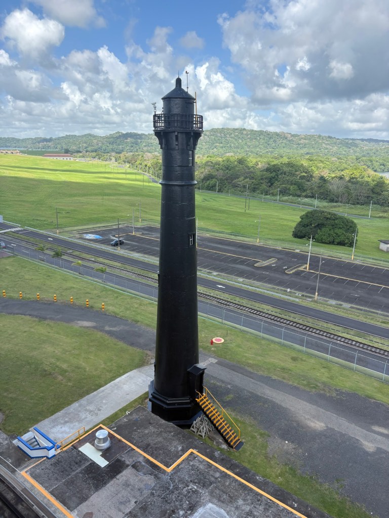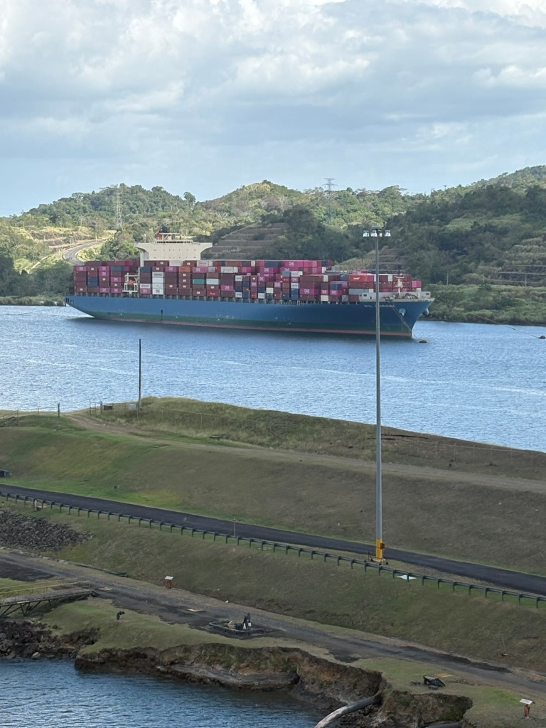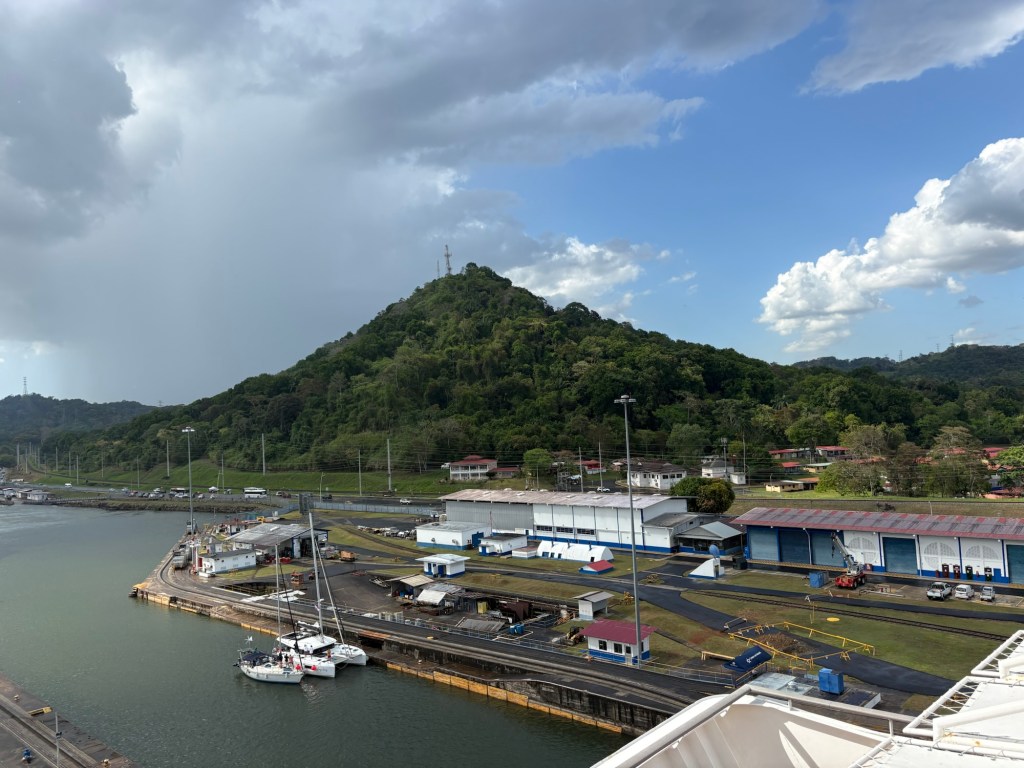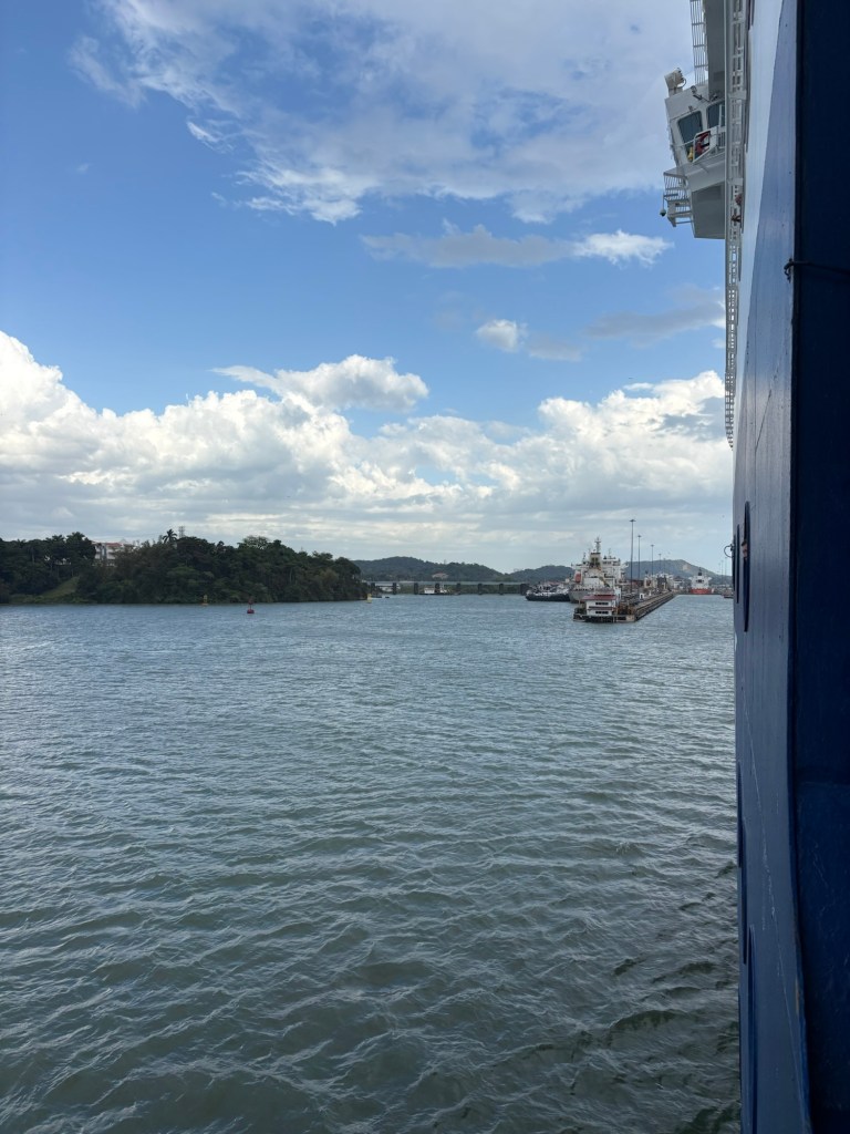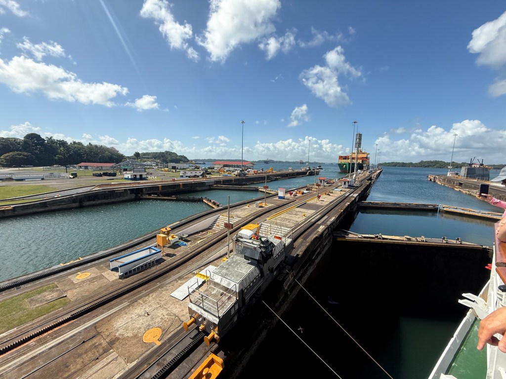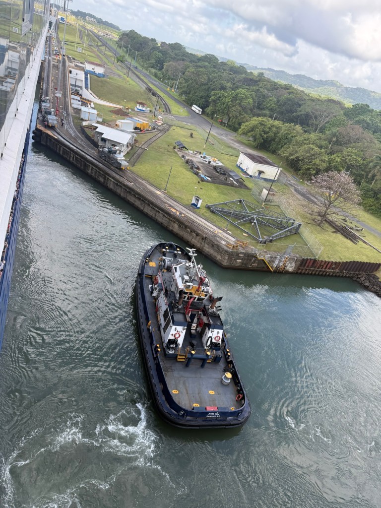 The Panama Canal’s system- 1 of the 7 man-made wonders of the world- involved building out a giant man made lake (Gatun Lake) and dam in the center of the country at a high point, and then building a system of locks on each side of that lake connecting the Atlantic side and the Pacific side, then letting gravity help with water flow and power. There are several sets of locks on each side of the country creating multiple “lanes” for crossing. We started on the old/original side in the Gatun locks, which differ from the Agua Clara locks in that they are smaller and still pulled by electric “carts” called mules that hook to the ship with steel cables and help pull/guide the ships thru the locks.