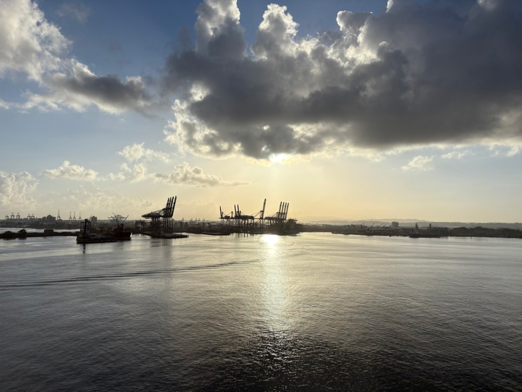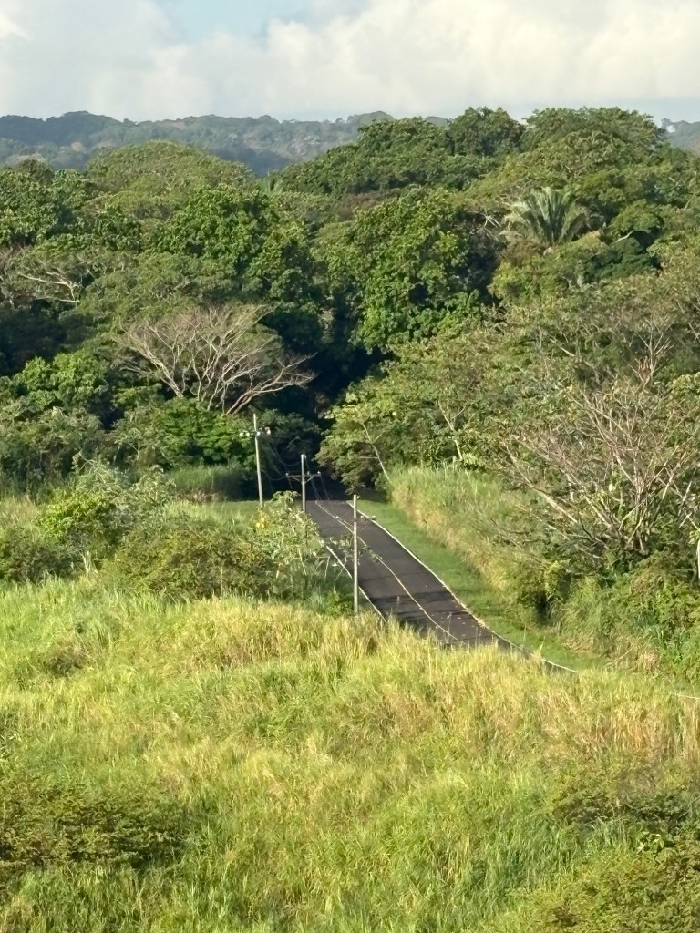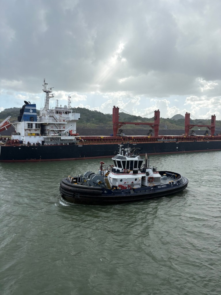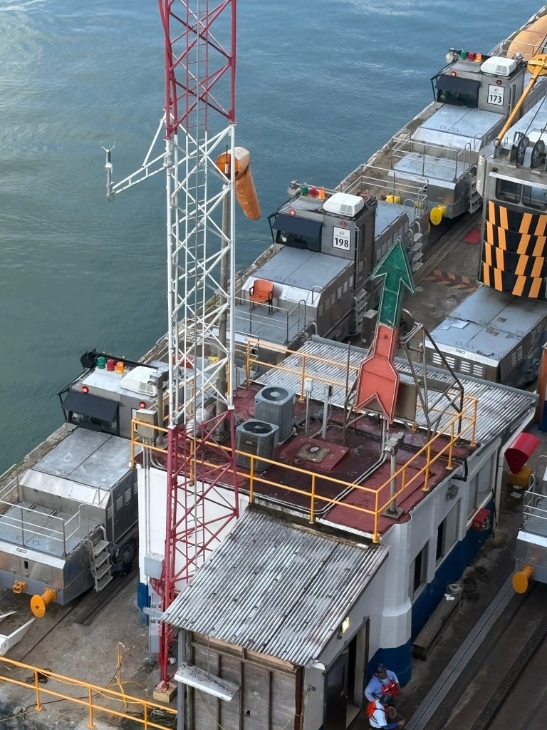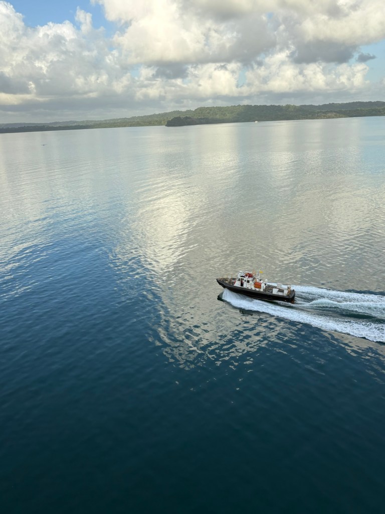 The Panama Canal’s system- 1 of the 7 man-made wonders of the world- involved building out a giant man made lake (Gatun Lake) and dam in the center of the country at a high point, and then building a system of locks on each side of that lake connecting the Atlantic side and the Pacific side, then letting gravity help with water flow and power. There are several sets of locks on each side of the country creating multiple “lanes” for crossing. We started on the old/original side in the Gatun locks, which differ from the Agua Clara locks in that they are smaller and still pulled by electric “carts” called mules that hook to the ship with steel cables and help pull/guide the ships thru the locks.