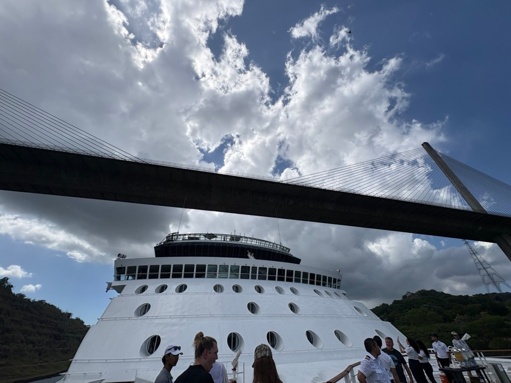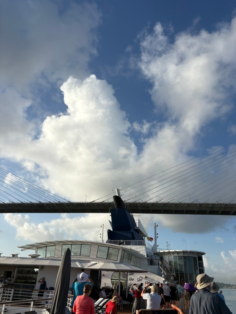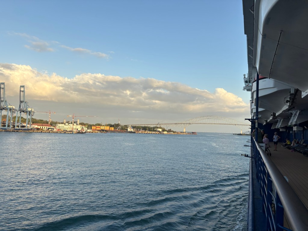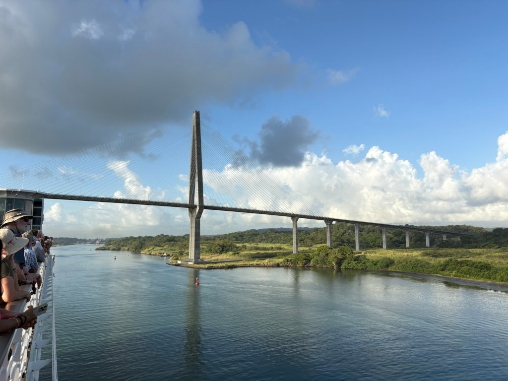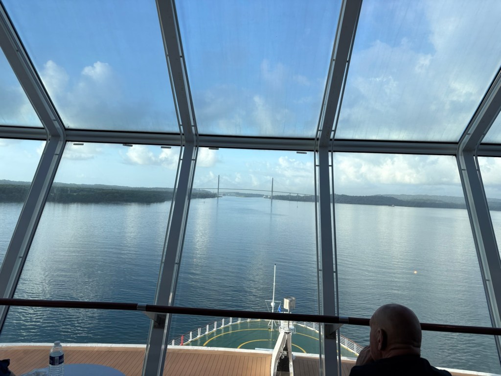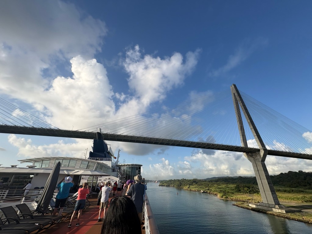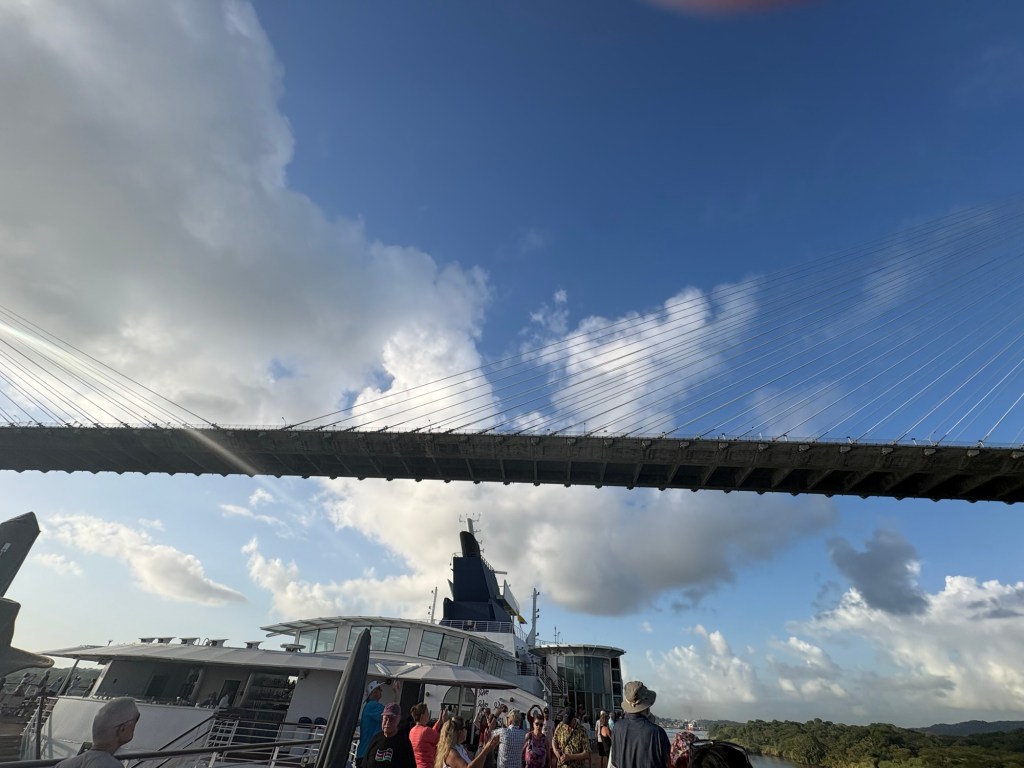 Coming in from the east/Atlantic side of the canal (or more precisely, the canal runs north/south so we are coming in from the north), we sailed through Limón Bay and under the Atlantic Bridge early this morning. What a sight to wake up to! Rob and I alternated between the upper decks where we could get good photos and the lower decks where we had air conditioning but smudgy windows so the photos are less clear. They also had the ship’s helipad on the bow open and available for guests to come stand and view the crossing.