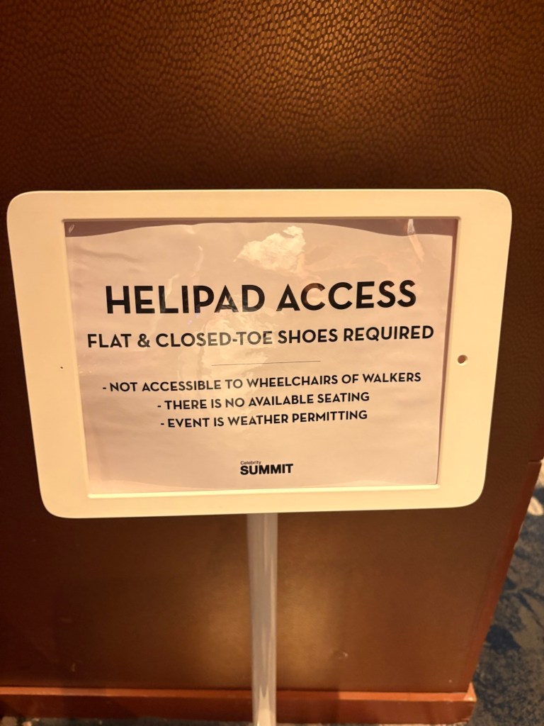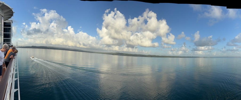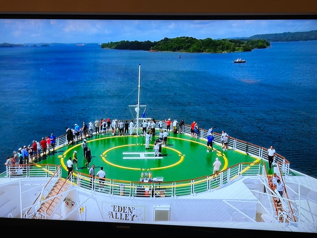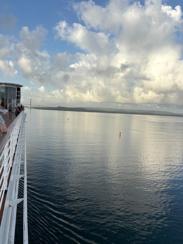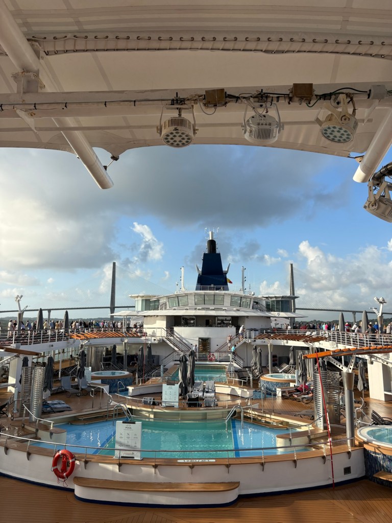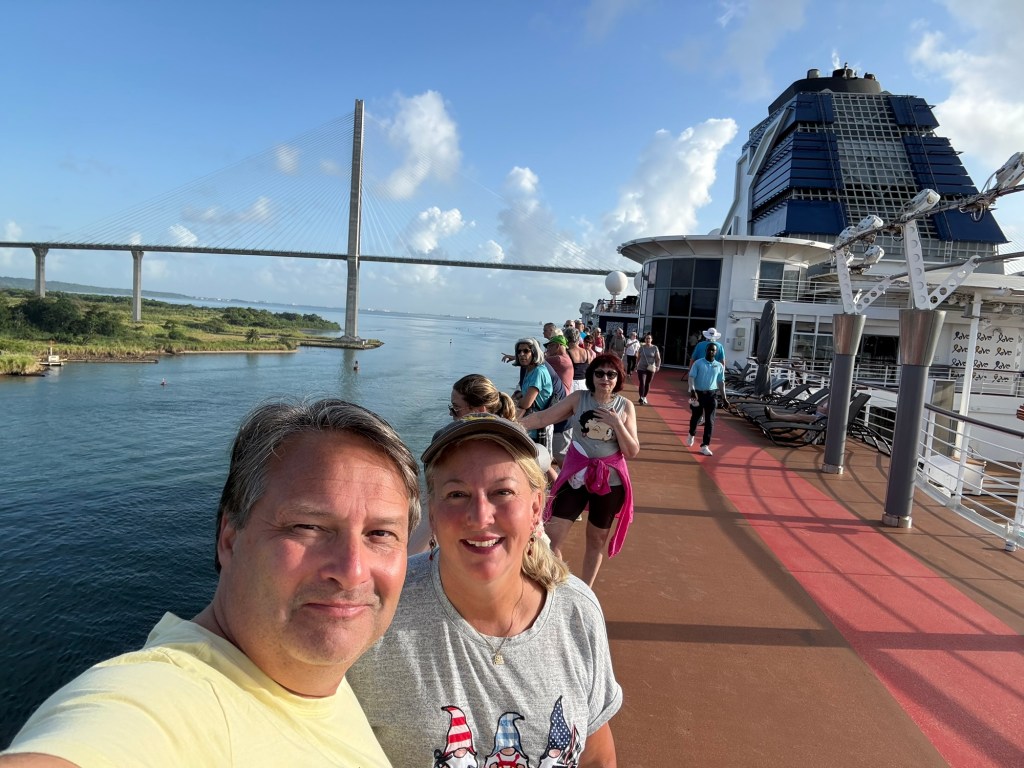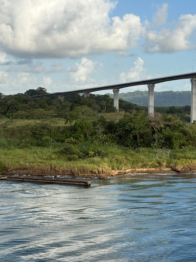 Coming in from the east/Atlantic side of the canal (or more precisely, the canal runs north/south so we are coming in from the north), we sailed through Limón Bay and under the Atlantic Bridge early this morning. What a sight to wake up to! Rob and I alternated between the upper decks where we could get good photos and the lower decks where we had air conditioning but smudgy windows so the photos are less clear. They also had the ship’s helipad on the bow open and available for guests to come stand and view the crossing.
