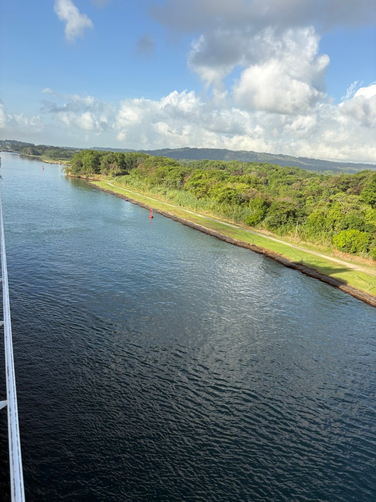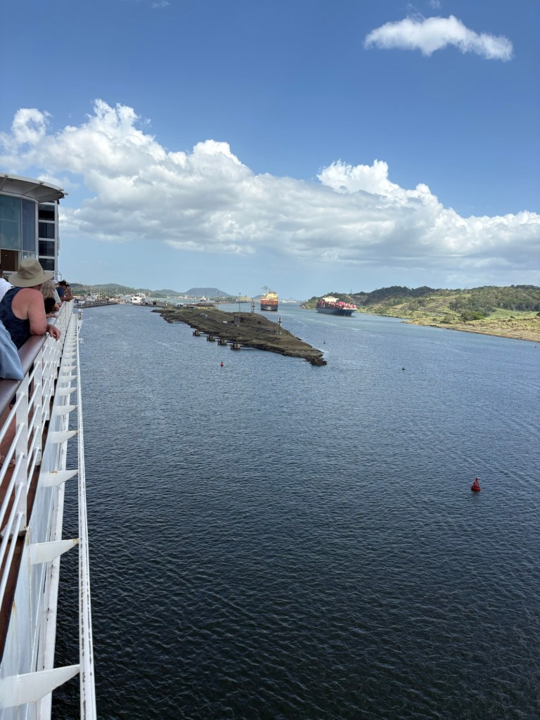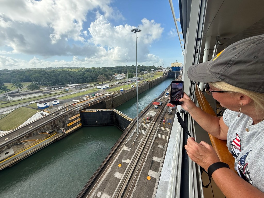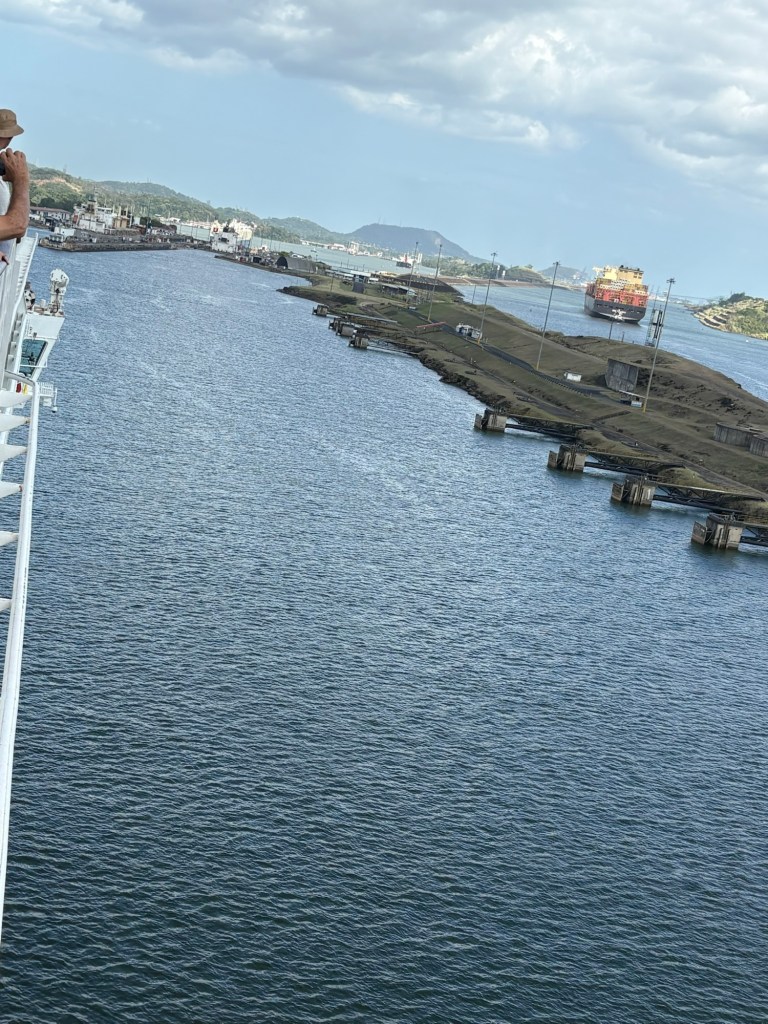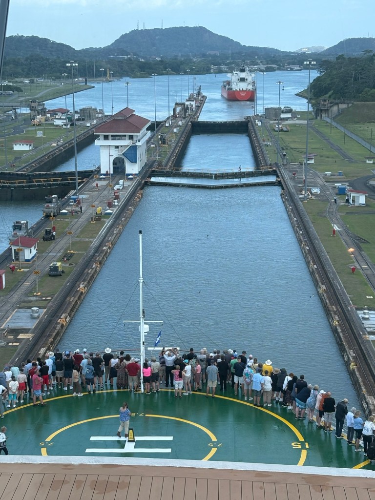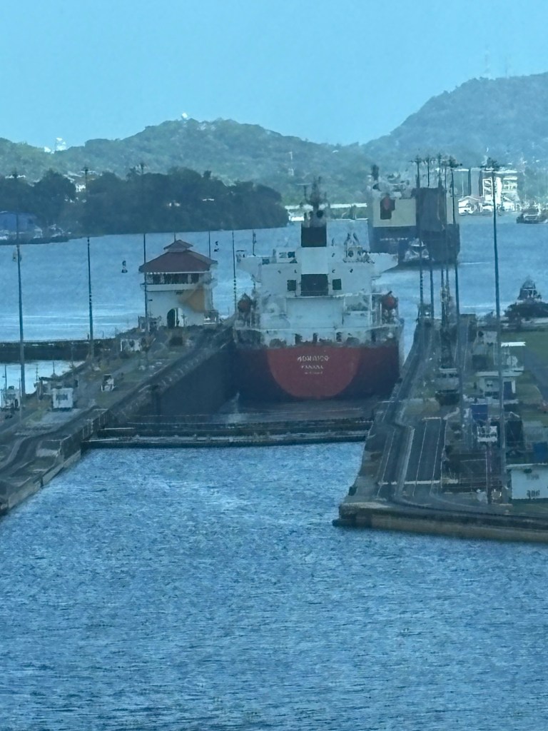 Reservations for canal crossings are made at least a year in advance, and our onboard guides (who have been doing our port talks and announcing the sights and events all day today) told us that the cost for ships like ours goes by tonnage, so our ship paid $650,000 to cross, including a $100,000 reservation fee. Yikes!! No wonder so many ships turn around at Gatun Lake and sail back. The day of your crossing is tightly scheduled, and if you are off by one minute in your timing as a captain, they evidently put you in the back of the line. The locks are operational 24/7. Before you gain permission to enter the locks on the day of your reservation, you have to obtain permission from the harbor master and pass inspection that includes divers going under the ship to check for leakage or particles that shouldn’t be there. With ships going from salt water to fresh water systems, they don’t play! Evidently this system is very straightforward now, and much improved over the old reservation system that evidently involved bribes given to the harbor masters and control centers and anyone involved with crossing. 😂