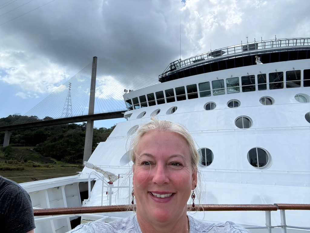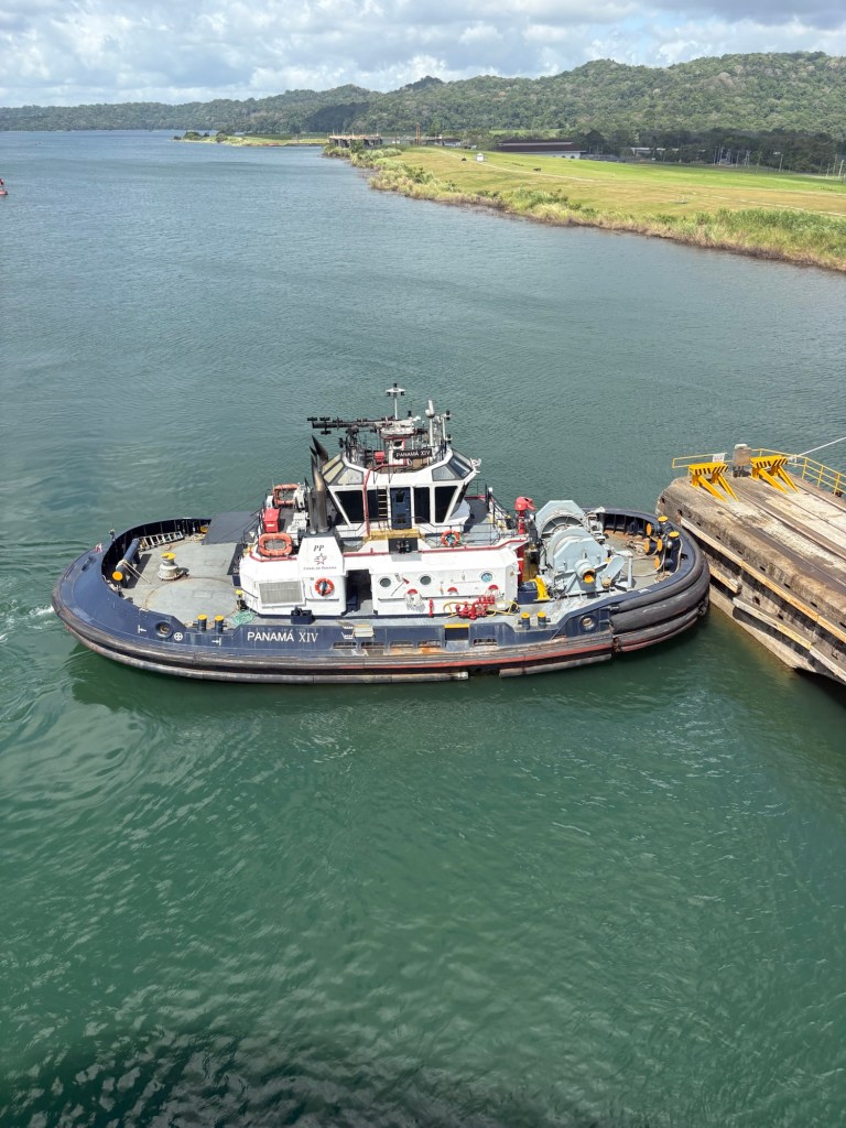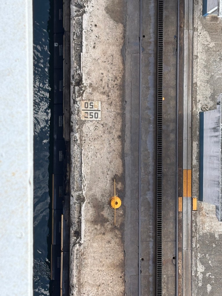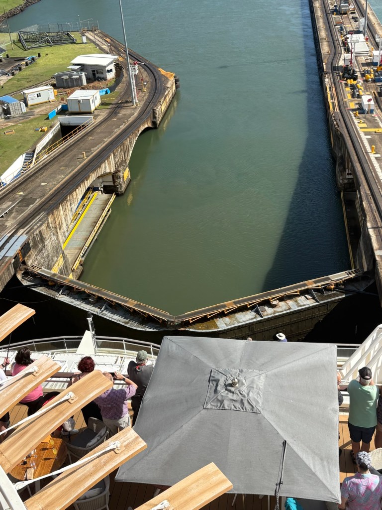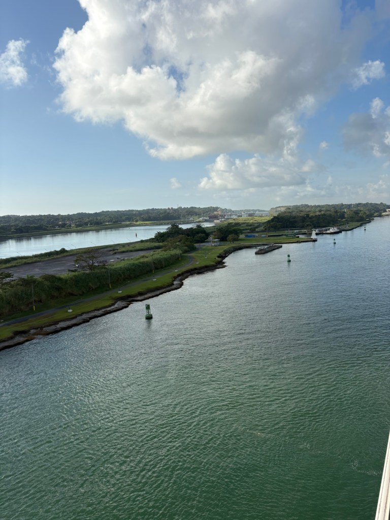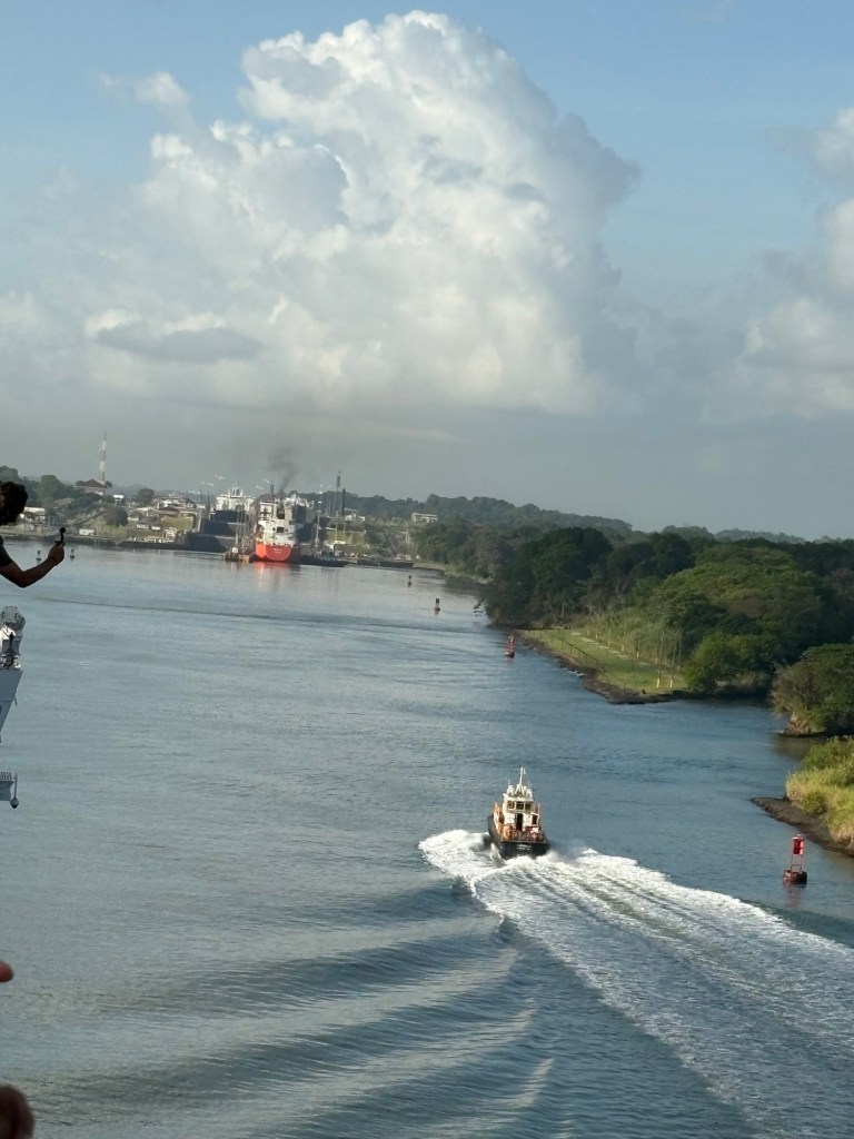 Reservations for canal crossings are made at least a year in advance, and our onboard guides (who have been doing our port talks and announcing the sights and events all day today) told us that the cost for ships like ours goes by tonnage, so our ship paid $650,000 to cross, including a $100,000 reservation fee. Yikes!! No wonder so many ships turn around at Gatun Lake and sail back. The day of your crossing is tightly scheduled, and if you are off by one minute in your timing as a captain, they evidently put you in the back of the line. The locks are operational 24/7. Before you gain permission to enter the locks on the day of your reservation, you have to obtain permission from the harbor master and pass inspection that includes divers going under the ship to check for leakage or particles that shouldn’t be there. With ships going from salt water to fresh water systems, they don’t play! Evidently this system is very straightforward now, and much improved over the old reservation system that evidently involved bribes given to the harbor masters and control centers and anyone involved with crossing. 😂