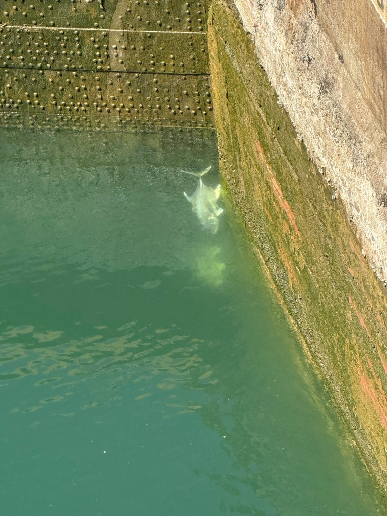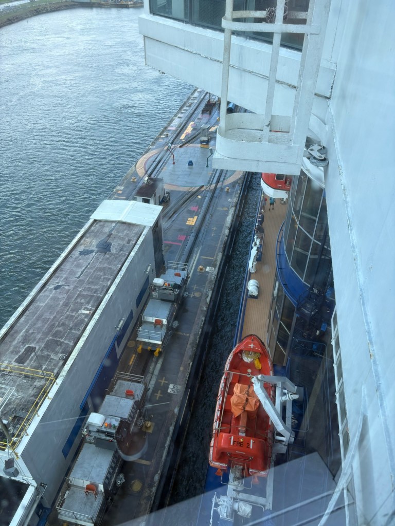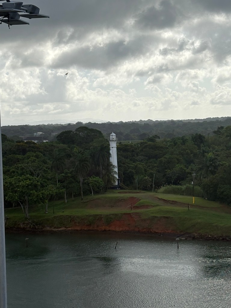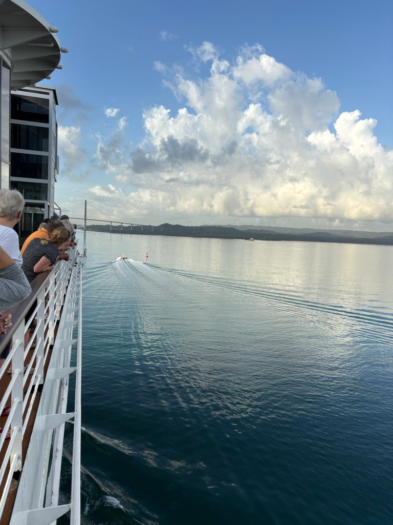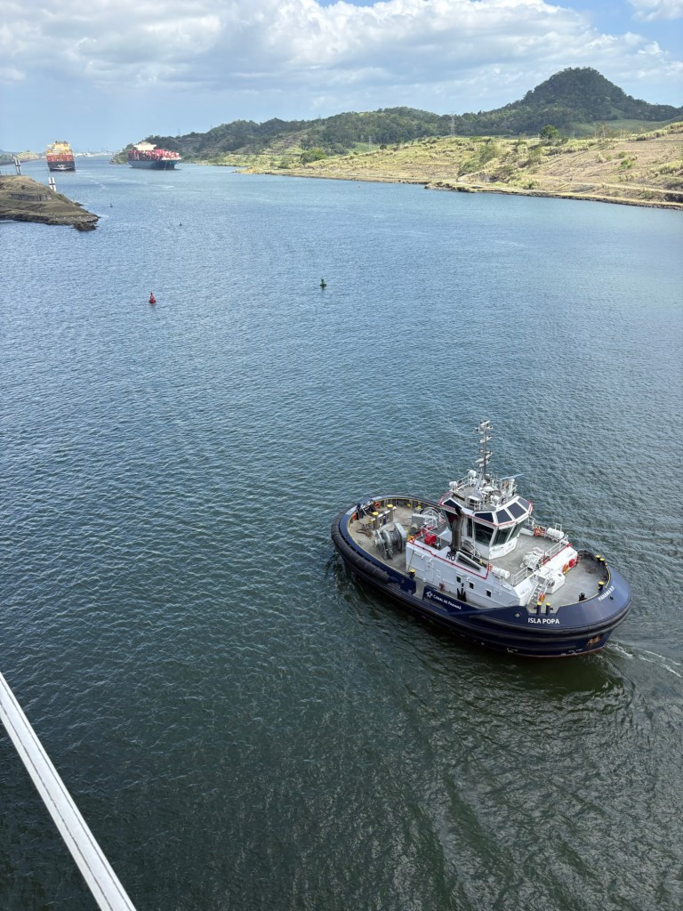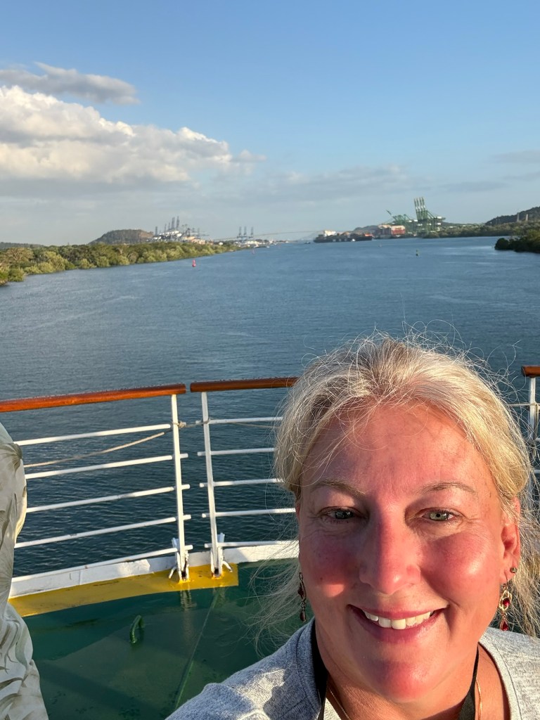 Reservations for canal crossings are made at least a year in advance, and our onboard guides (who have been doing our port talks and announcing the sights and events all day today) told us that the cost for ships like ours goes by tonnage, so our ship paid $650,000 to cross, including a $100,000 reservation fee. Yikes!! No wonder so many ships turn around at Gatun Lake and sail back. The day of your crossing is tightly scheduled, and if you are off by one minute in your timing as a captain, they evidently put you in the back of the line. The locks are operational 24/7. Before you gain permission to enter the locks on the day of your reservation, you have to obtain permission from the harbor master and pass inspection that includes divers going under the ship to check for leakage or particles that shouldn’t be there. With ships going from salt water to fresh water systems, they don’t play! Evidently this system is very straightforward now, and much improved over the old reservation system that evidently involved bribes given to the harbor masters and control centers and anyone involved with crossing. 😂
