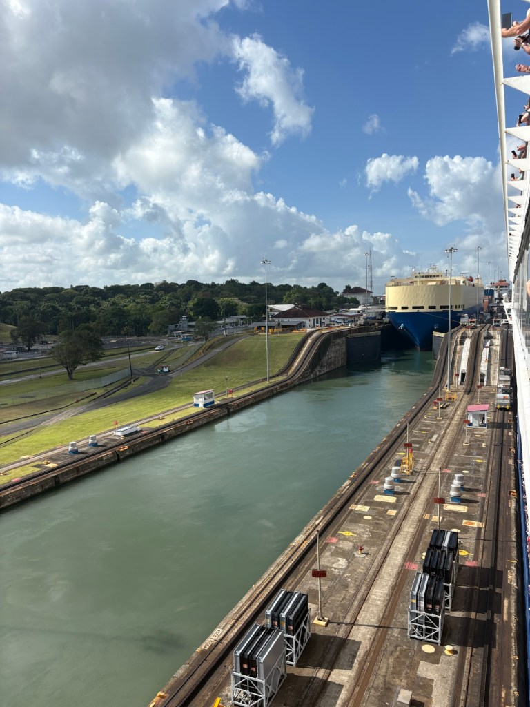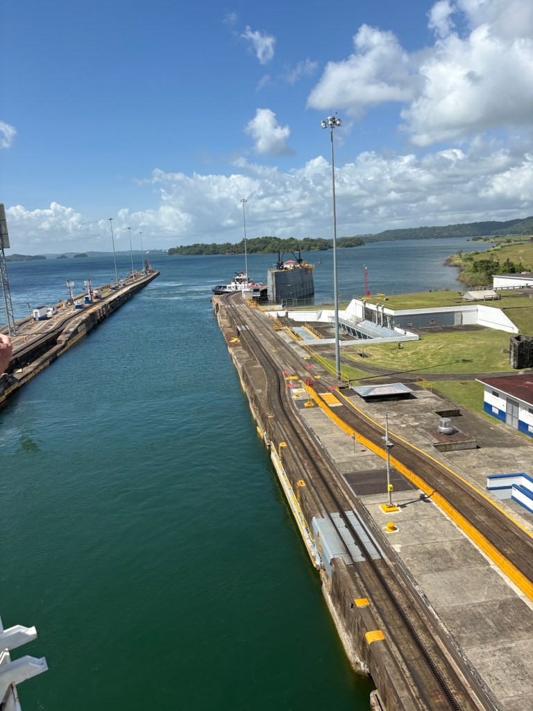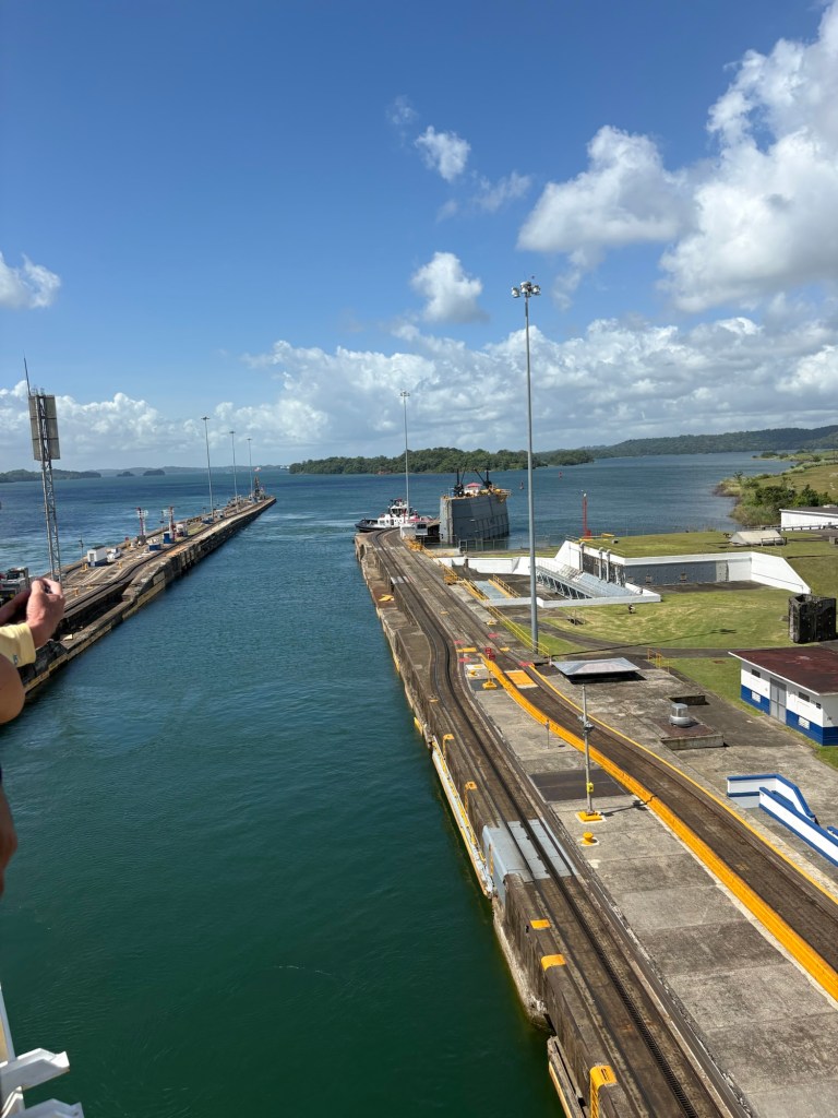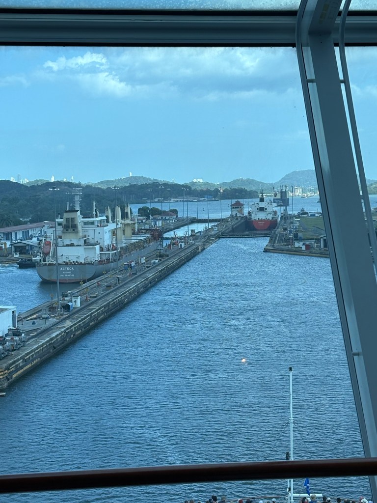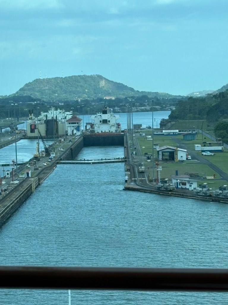 MAJOR bucket list ✅ today due to our Panama Canal crossing!! We went from the Atlantic to the Pacific, crossing completely through the center of Panama via their incredible lock system- wow! If you haven’t seen a lock system before (and definitely some of our fellow passengers had not!), you sail into each lock at your same water level, and it seals your ship in the chamber and then the water rises or lowers to release you into the next chamber (or body of water) at that level.