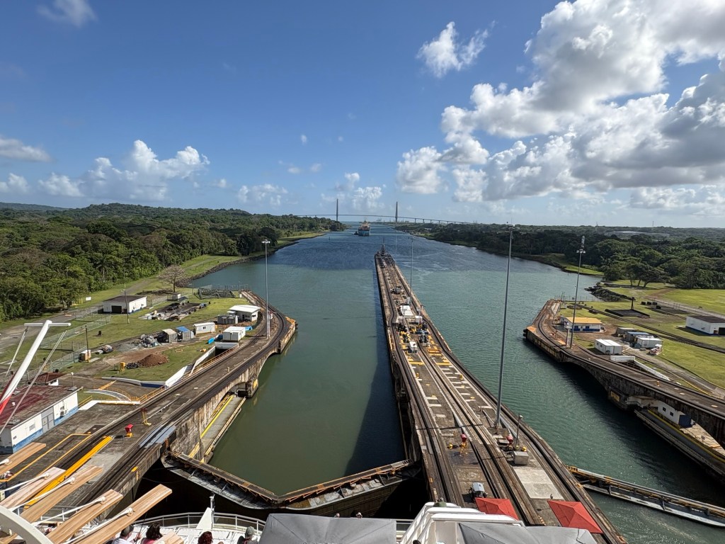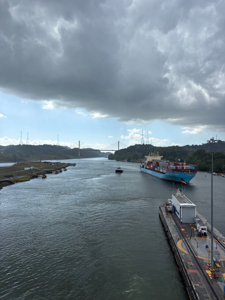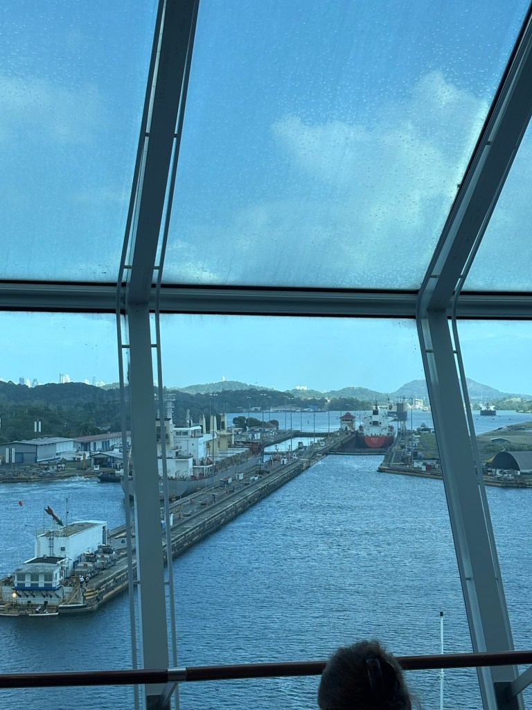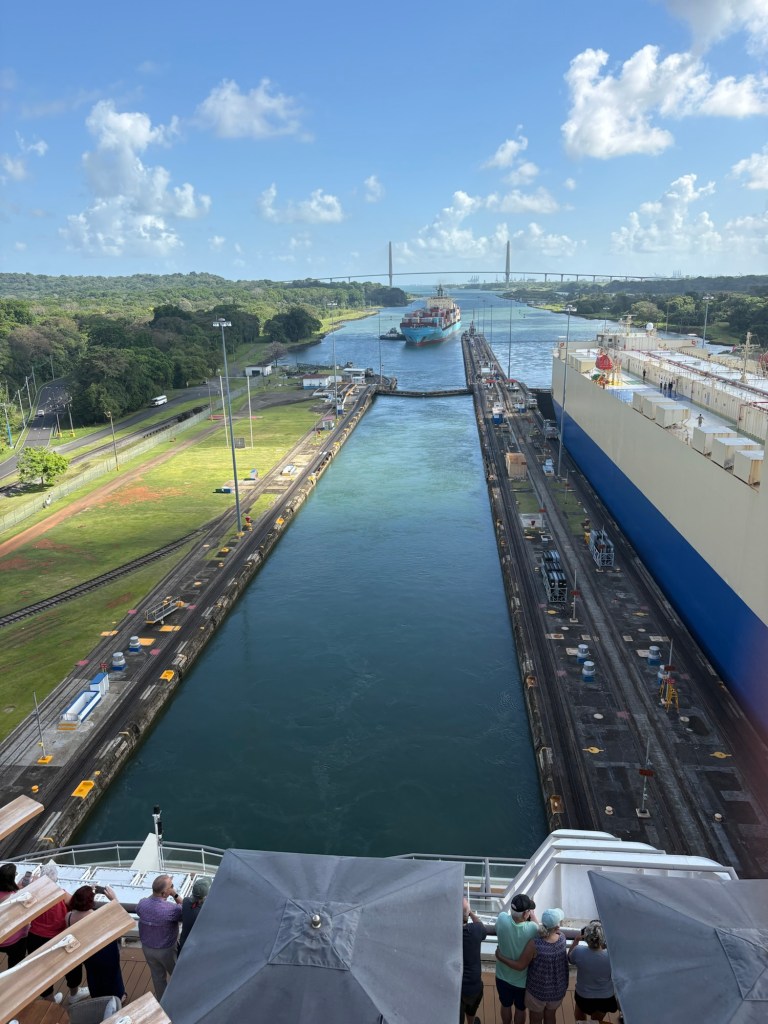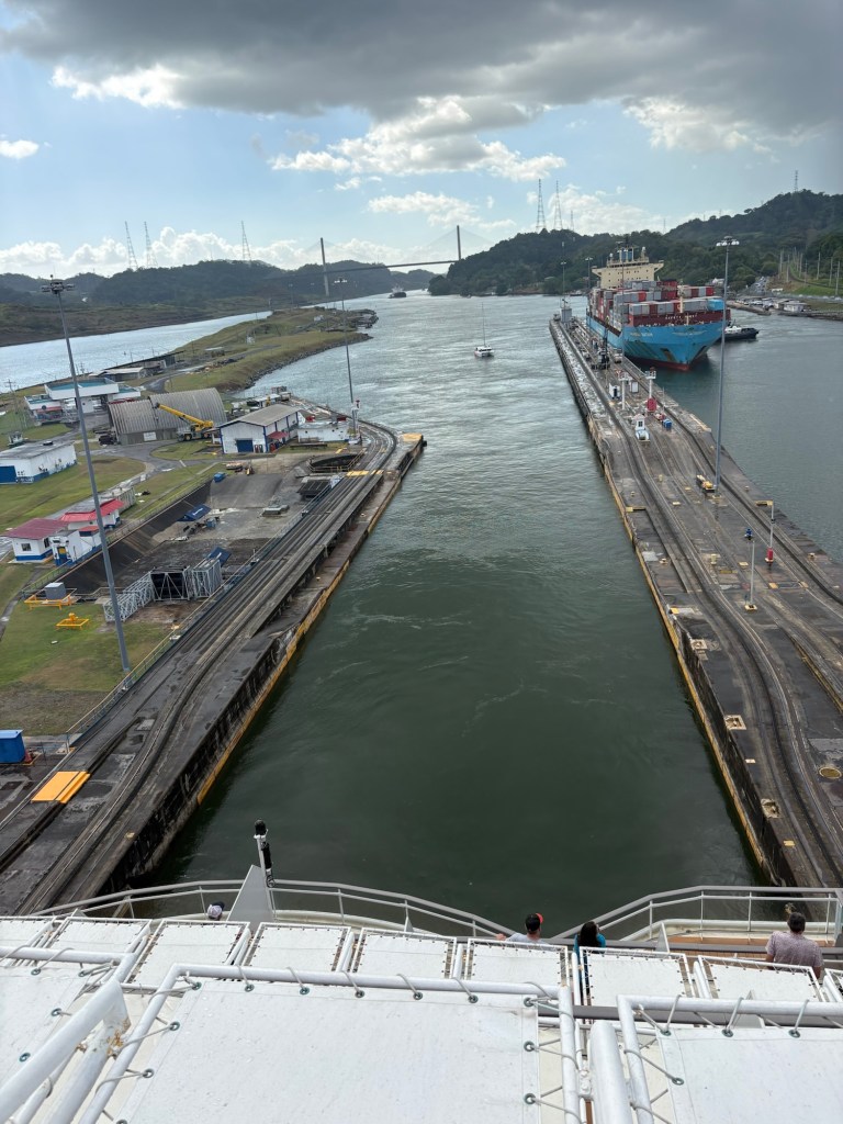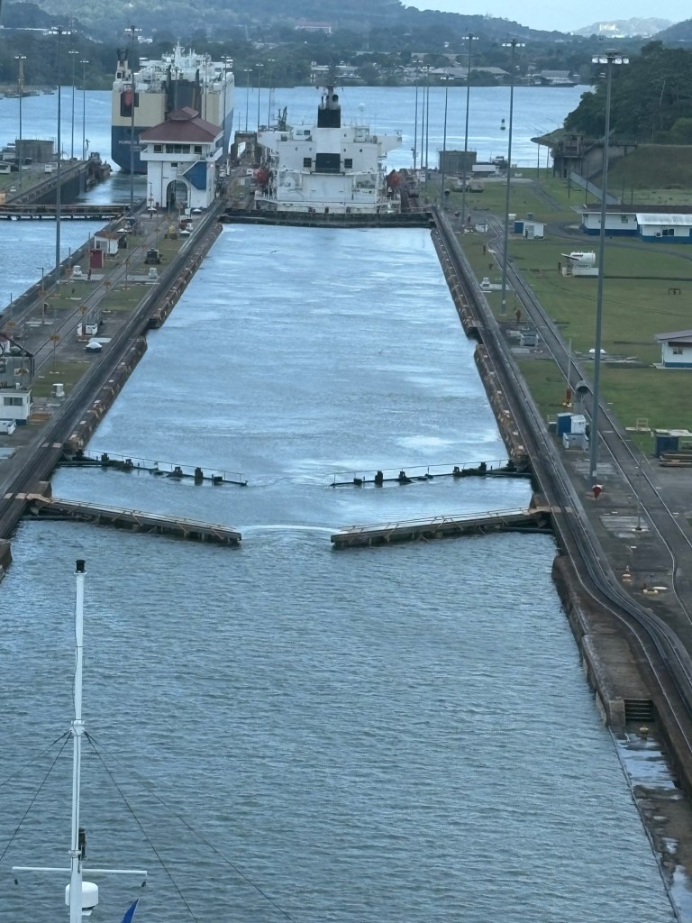 MAJOR bucket list ✅ today due to our Panama Canal crossing!! We went from the Atlantic to the Pacific, crossing completely through the center of Panama via their incredible lock system- wow! If you haven’t seen a lock system before (and definitely some of our fellow passengers had not!), you sail into each lock at your same water level, and it seals your ship in the chamber and then the water rises or lowers to release you into the next chamber (or body of water) at that level.